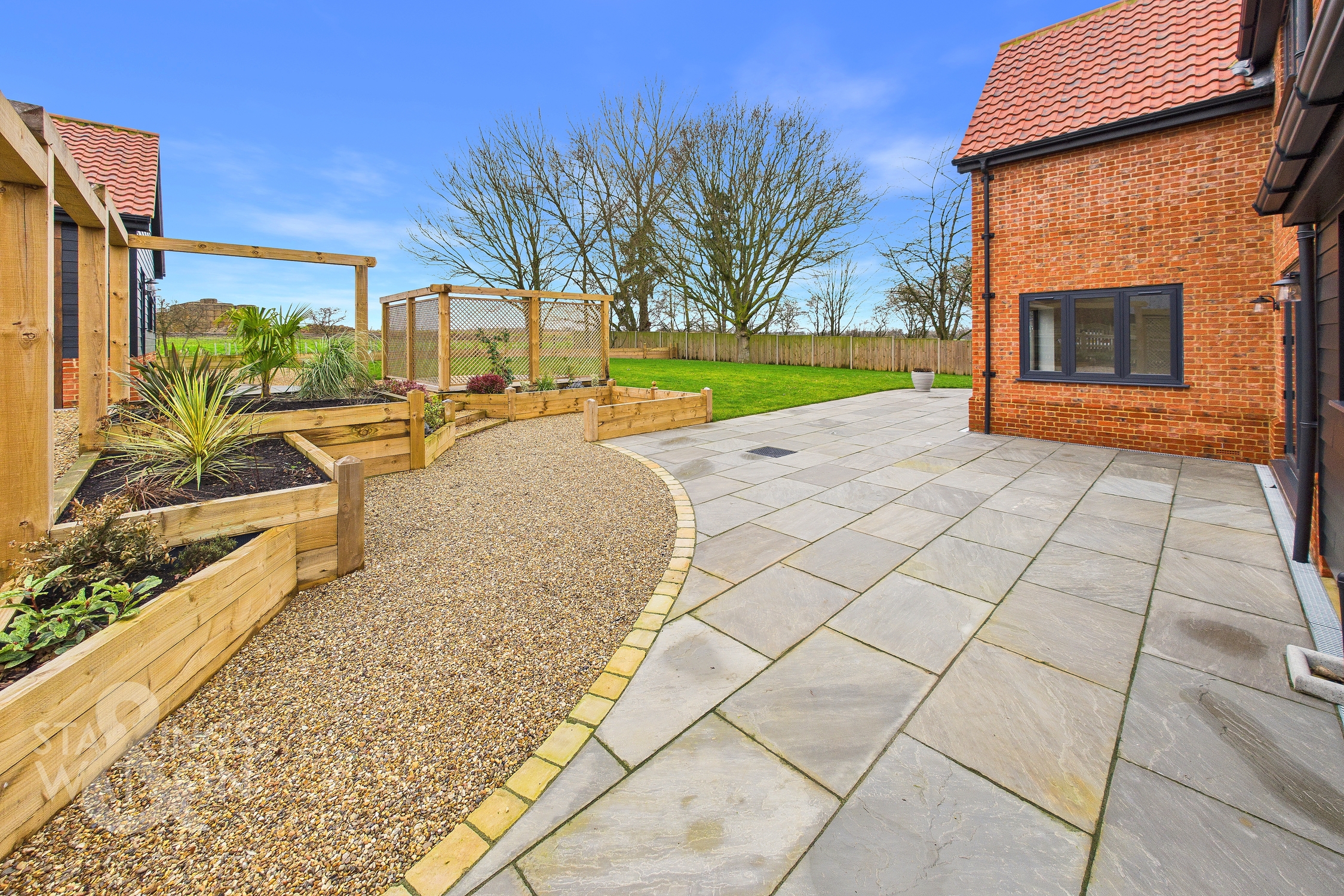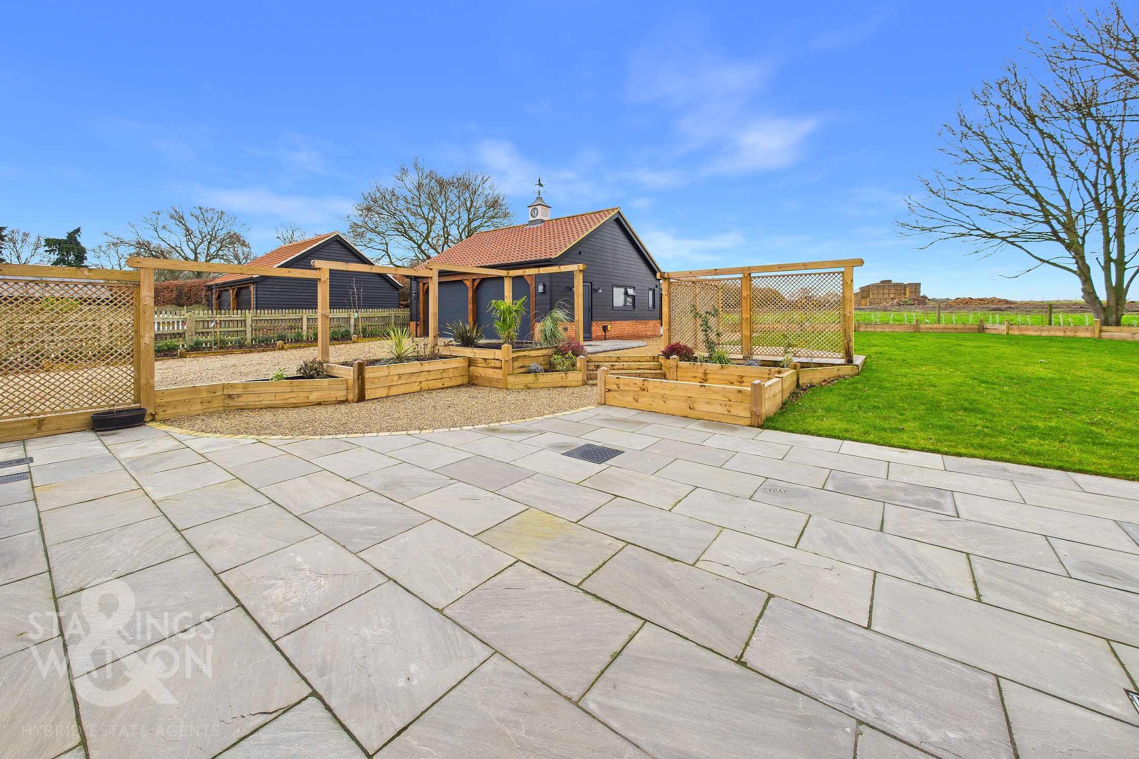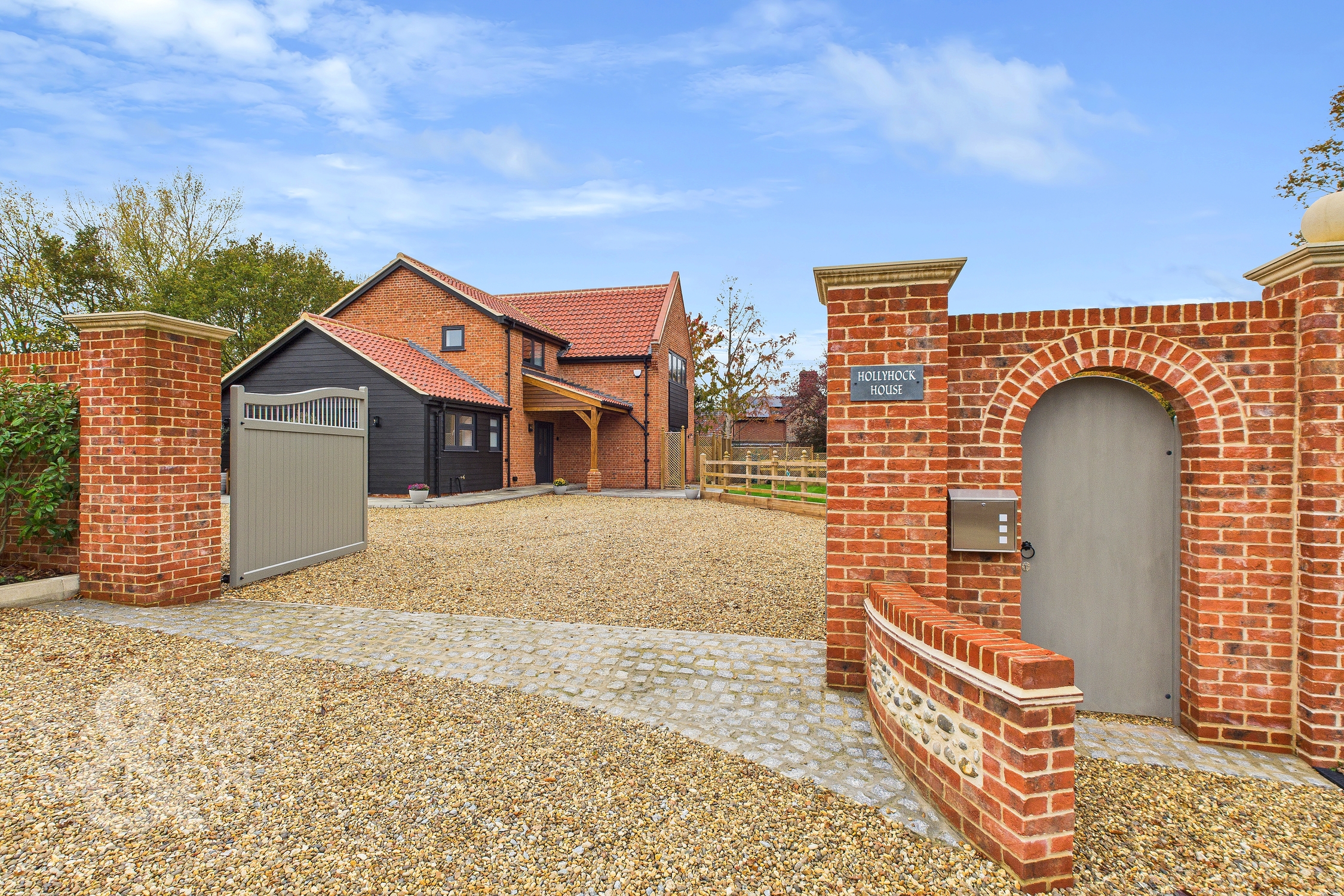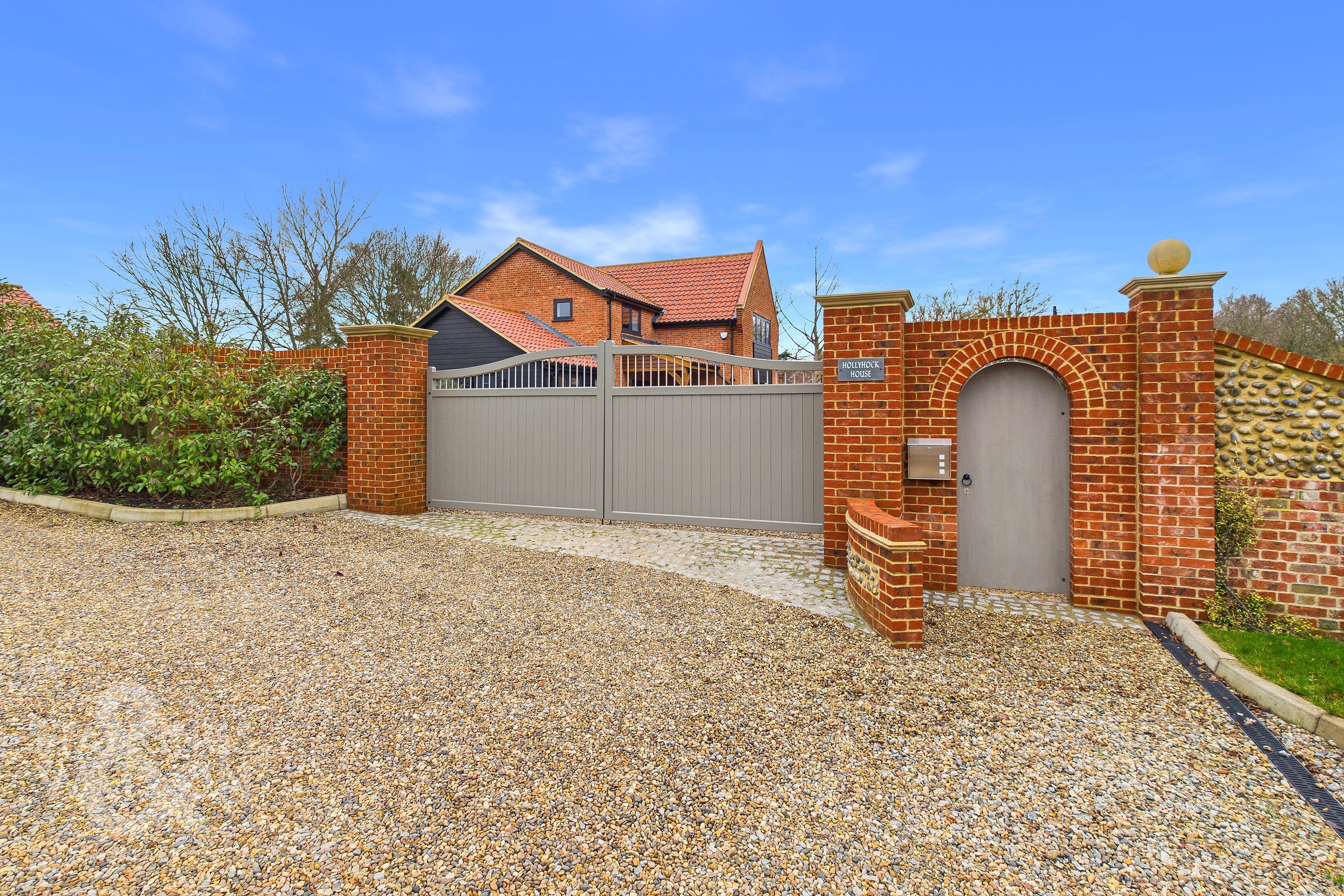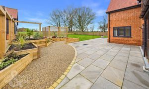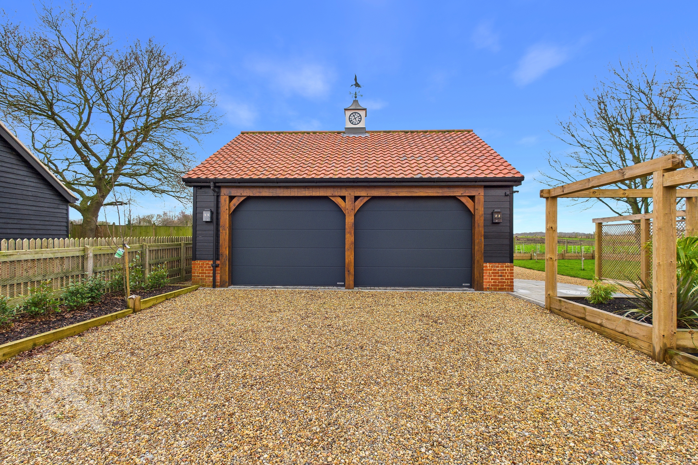 Elevated from the road, a gated entrance with brick pillars and a pedestrian gate opens to the main shingle driveway. With ample parking and turning space, raised timber sleeper beds run down the driveway, with a range of planting. Timber post and rail fencing enclose the front lawned garden, with a paved footpath taking you to the oak framed porch and rear garden. The front garden is private and non-overlooked, with a Portuguese Laurel hedge recently planted, patio area and a sunken wildlife garden with further planting.