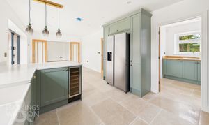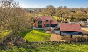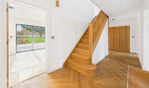 Engineered oak wood flooring in a herringbone style complete with under-floor heating runs underfoot. Stairs rise to the first floor, with storage under and a further double built-in airing and storage cupboard. On your left, the ground floor W.C has been fitted with a contemporary two piece suite including storage under the hand wash basin and tiled splash-backs. The kitchen/dining room enjoys garden and countryside views, with your eyes immediately drawn to the bi-folding doors which open to the patio. The kitchen itself is a high specification Wren product with Quartz surfaces, including a feature inset twin ceramic butler sink, with integrated cooking appliances including an inset electric ceramic hob and built-in electric double oven. A dishwasher is integrated, with a freestanding wine cooler and American style fridge freezer included. Tiled flooring and underfloor heating runs underfoot, with a door to the utility room - finished in a matching style and solid wood work surfaces. A stable door leads to the driveway, with a washer/dryer and water softener integrated. The formal sitting room enjoys a central wood burner, which creates a focal point to the room. With dual facing views and bi-folding doors, herringbone style engineered oak wood flooring runs under foot, with under-floor heating. Ideal as a guest bedroom or further reception space, the final room is finished in a similar style, along with full height windows and French doors opening to the front garden. A private en suite shower room includes a vanity style unit with storage, attractive tiling, underfloor heating and a rainfall shower.