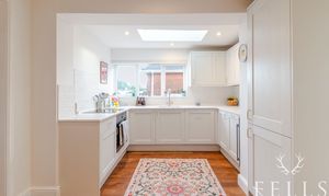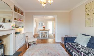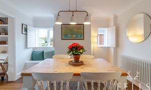 The front door opens beneath stained glass panels that colour the hallway with gentle light, where engineered wood flooring continues through the living and dining spaces. The sitting room has an easy warmth, shaped by ceiling roses, a stone surround with a woodburning stove and bespoke cabinetry built into the alcoves. Plantation shutters frame the windows and heritage style column radiators complement the character of the house. A wide square opening leads through to the dining room, a comfortable space for gatherings with further bespoke cabinetry and twin side facing windows.