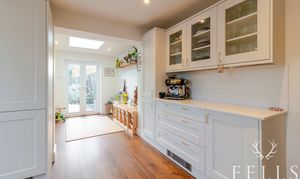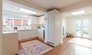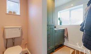 The kitchen and breakfast room form the social heart of the property. Shaker style cabinetry, quartz worktops and gold hardware create a refined and welcoming atmosphere. Integrated appliances include an induction hob, electric oven, wine cooler, dishwasher and fridge freezer. Two sky lanterns, one above the kitchen and another above the breakfast room, bring an uplifting sense of daylight from above. The breakfast room offers space for relaxed dining or quiet moments, with French doors opening onto the south facing terrace. A well planned cloakroom and utility sits just off this space, fitted with matching quartz surfaces, storage and space for laundry appliances.