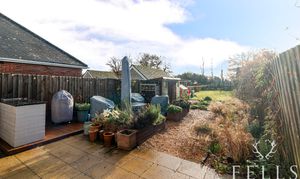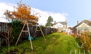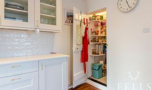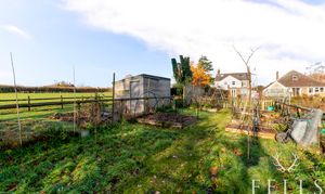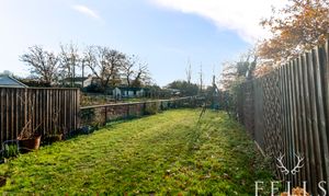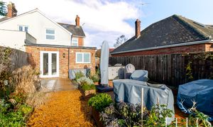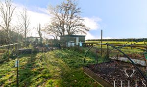 Outside, the garden is a standout feature, approaching 200ft in length and arranged to create a series of inviting spaces. A south facing terrace sits directly behind the house, leading to a raised deck with an outdoor kitchen area ideal for summer evenings. Beyond the lawn, picket fencing opens to a generous vegetable patch and a further section currently used for chickens. With neighbouring fields beyond, the setting feels open and scenic throughout the seasons.