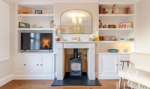 - Stone surround woodburning stove and bespoke alcove cabinetry