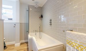 - Family bathroom with heritage fittings, panelling and brick tiles