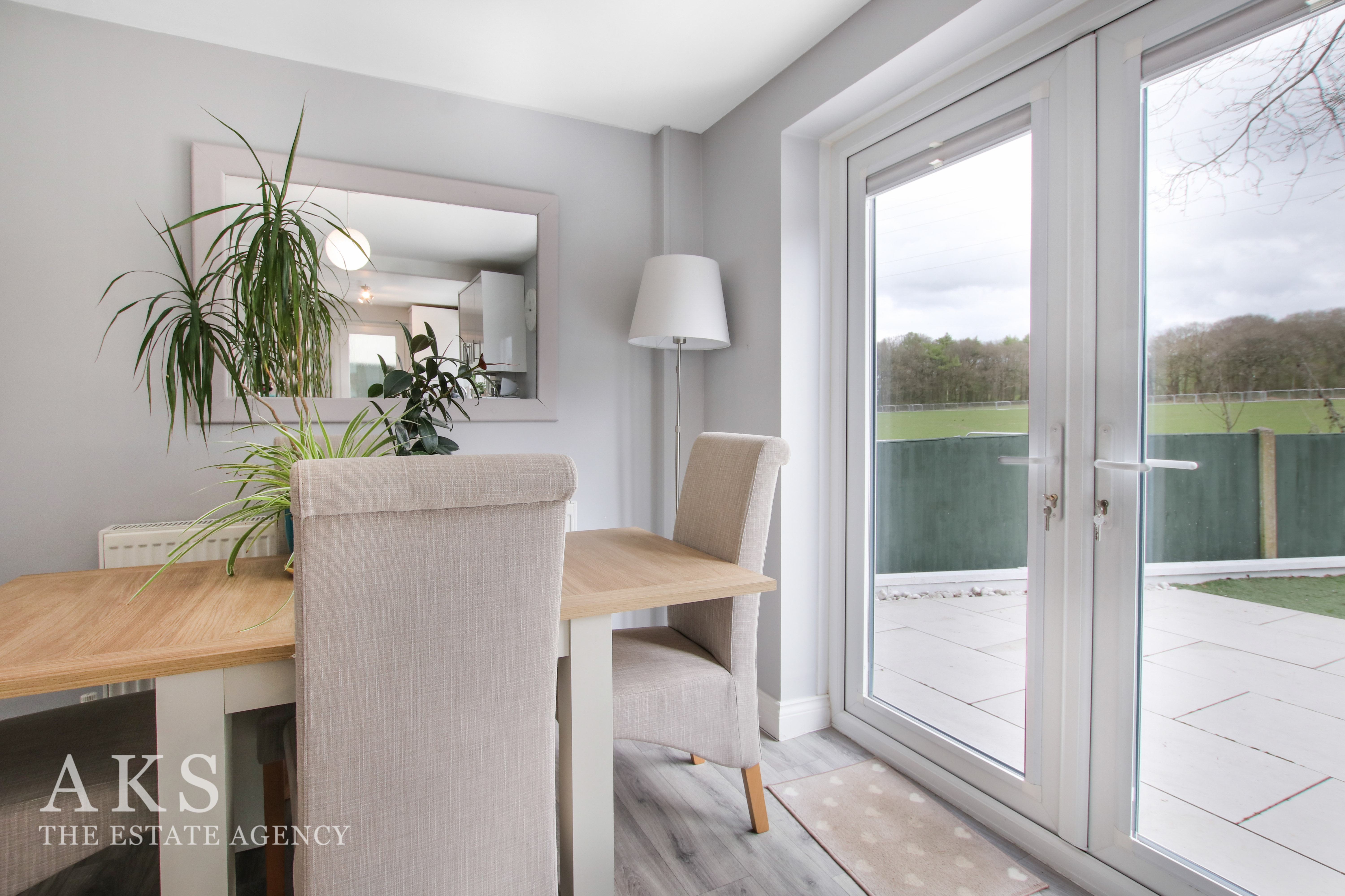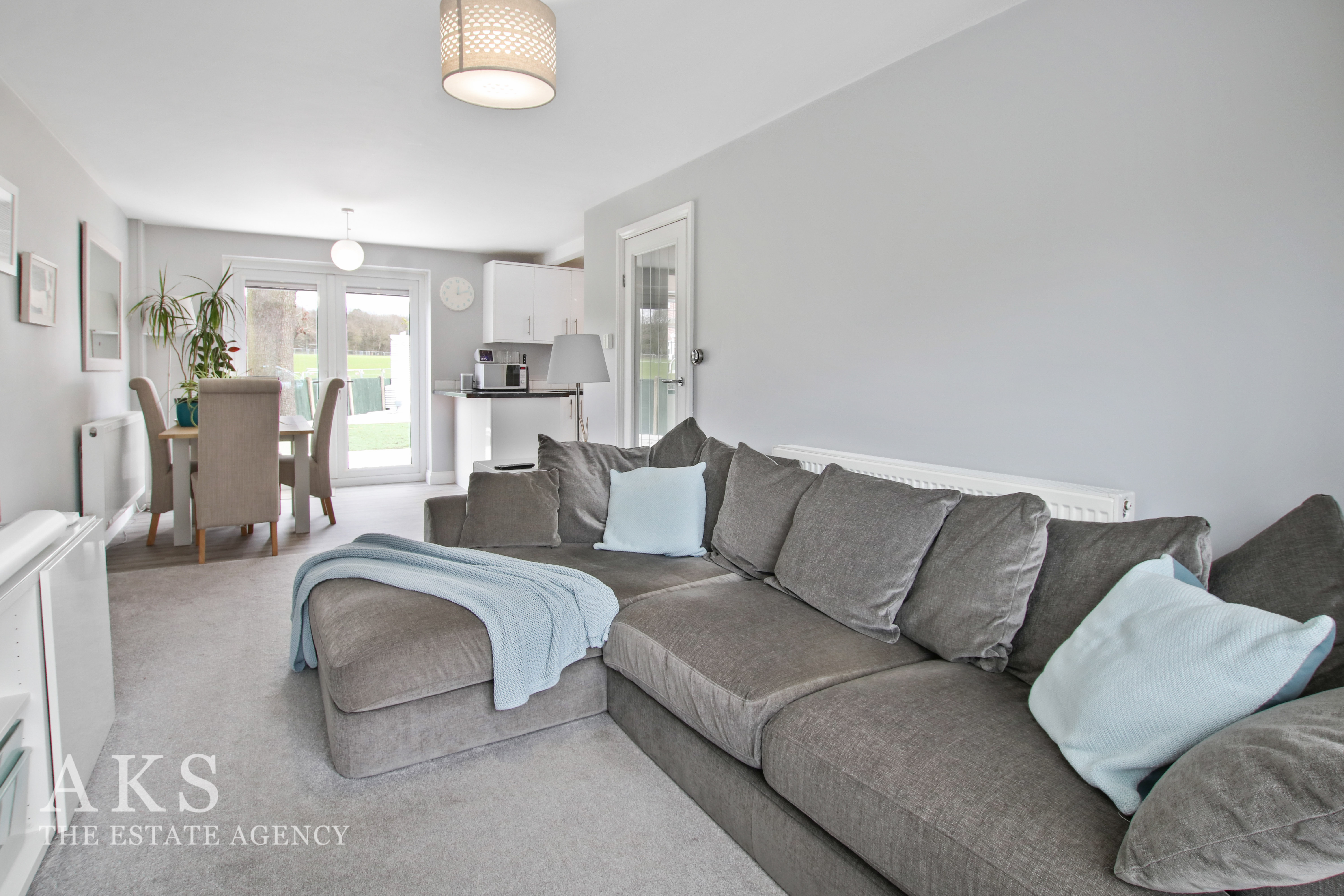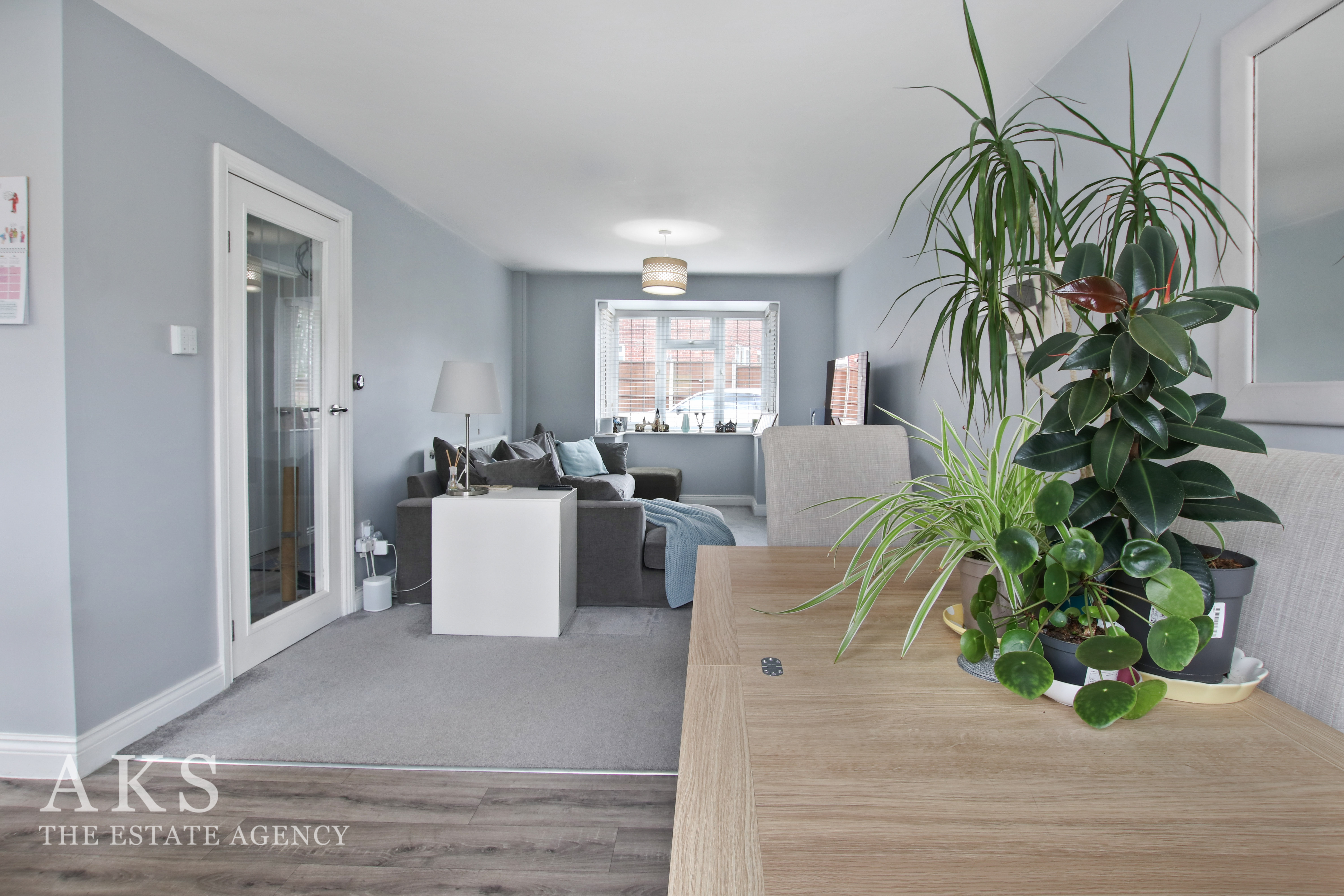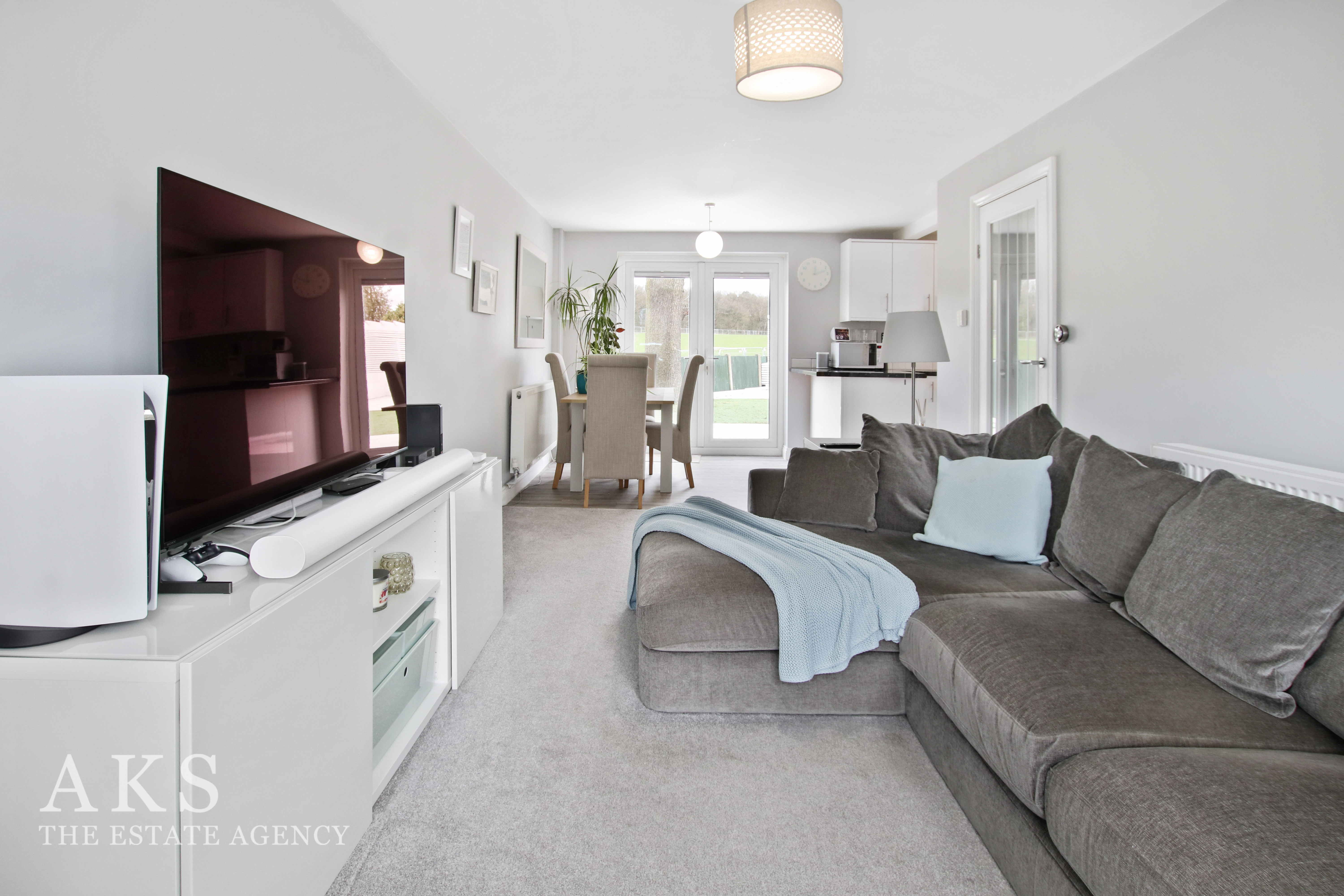 Inside, the layout is incredibly versatile. At the front of the house, there’s a large reception room that you can really make your own – whether that’s a home office, a snug, or even a games room. The rest of the ground floor flows brilliantly, with an open-plan living space that feels bright and airy. The living room leads naturally into the dining area, which sits right by the patio doors – perfect for letting in lots of light and making indoor-outdoor living feel seamless in the warmer months. The kitchen wraps around from here and has a clean, modern feel with its smart white finish and neatly tucked-away appliances, which helps keep everything looking uncluttered.