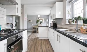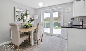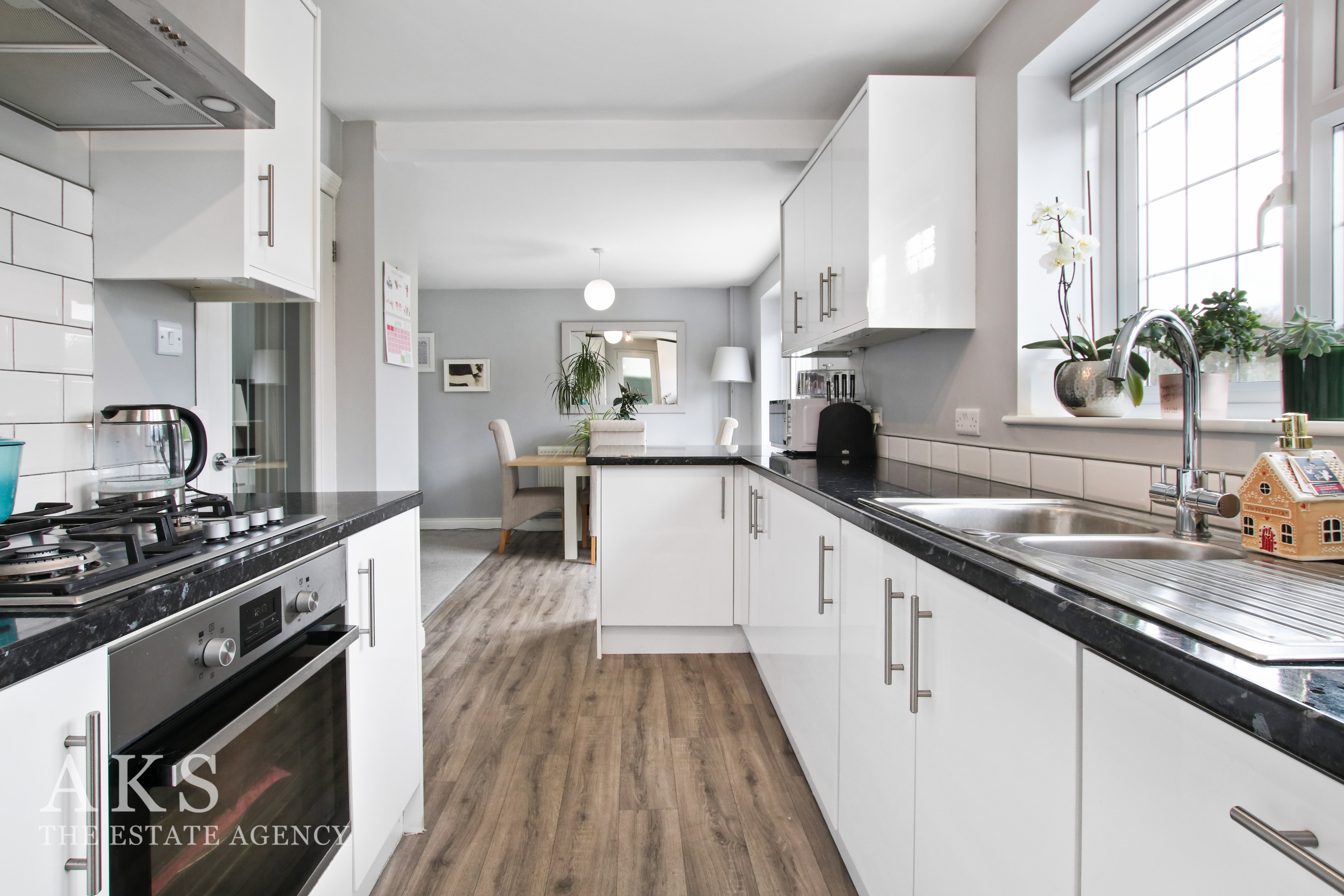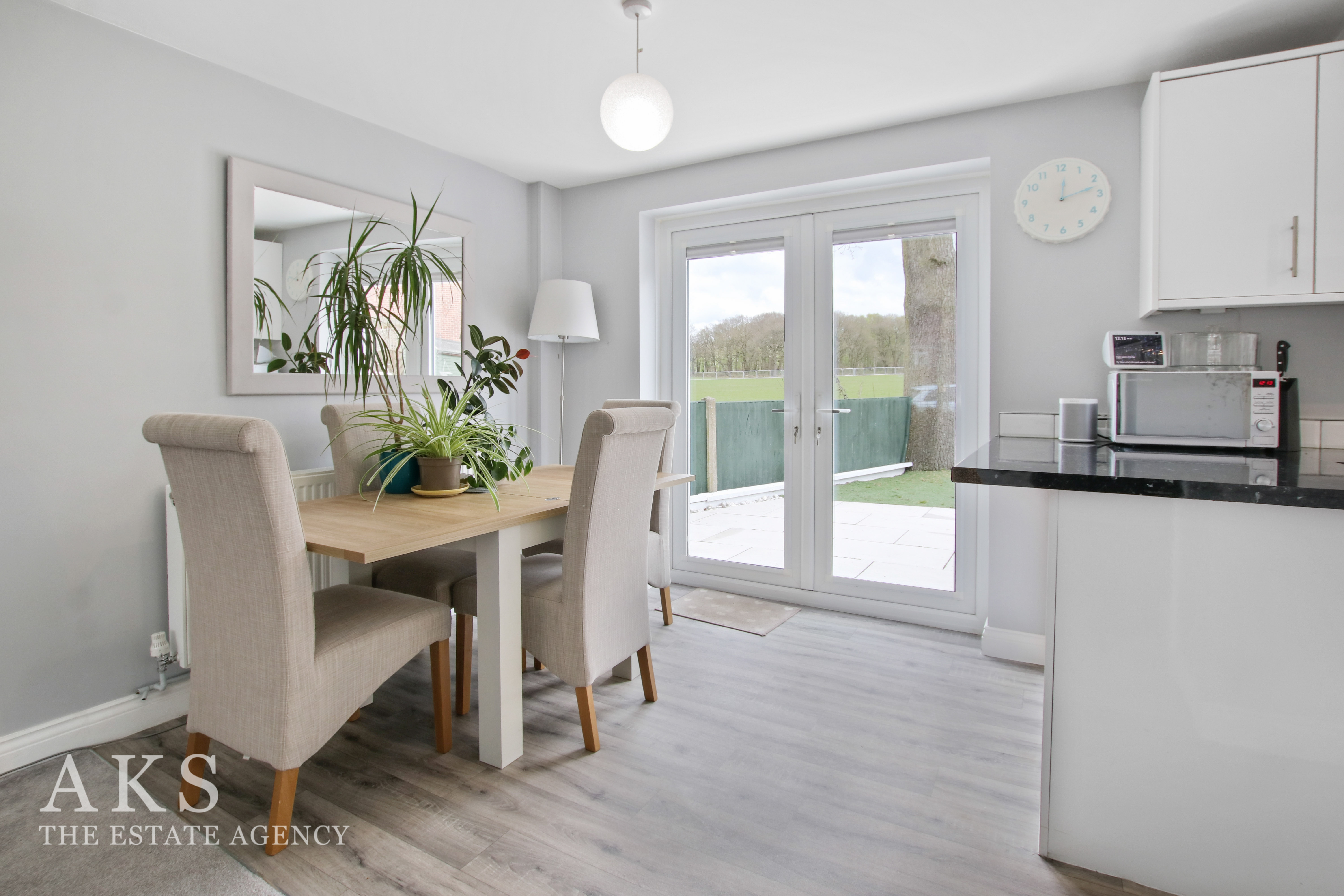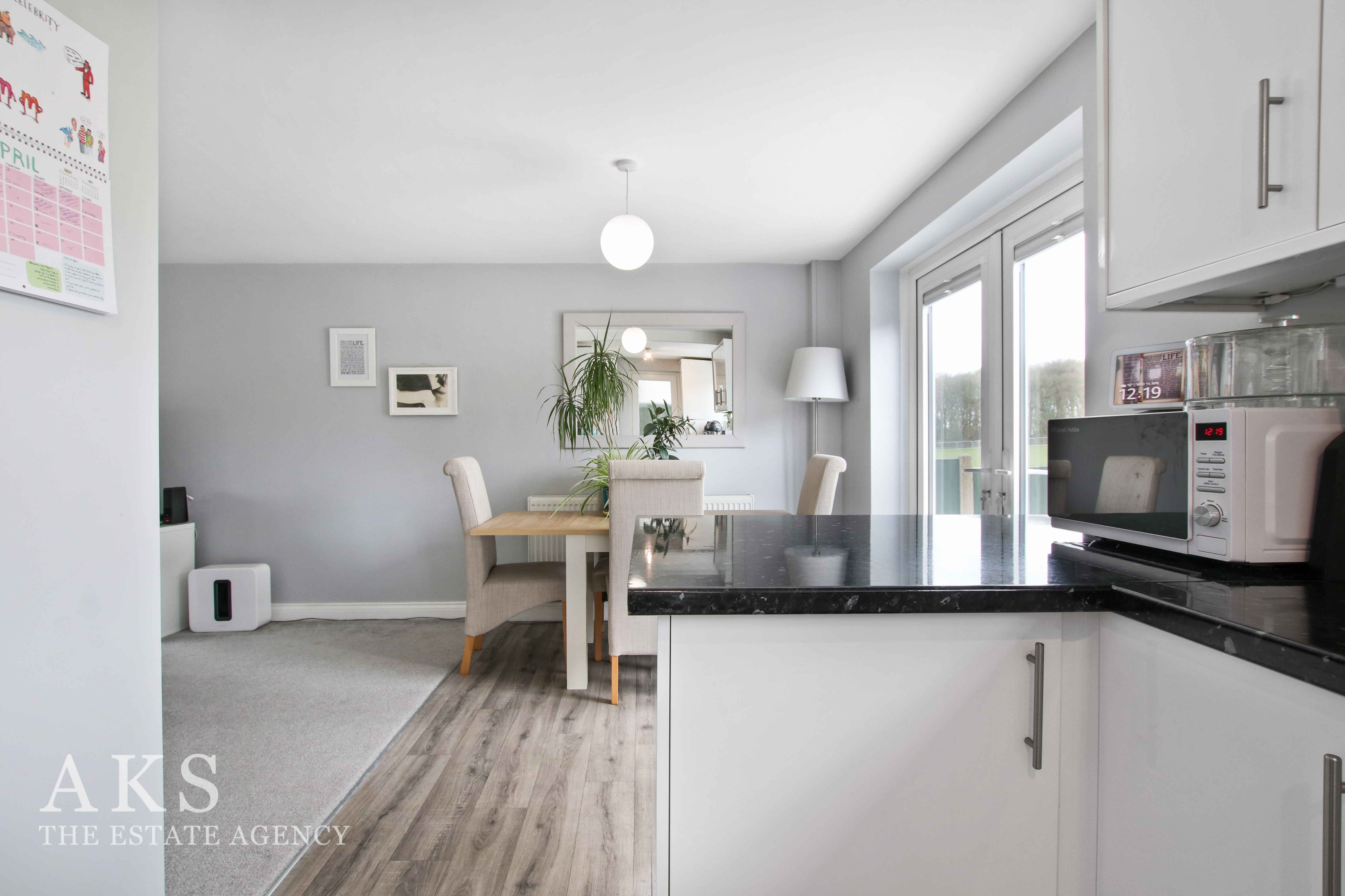 Inside, the layout is incredibly versatile. At the front of the house, there’s a large reception room that you can really make your own – whether that’s a home office, a snug, or even a games room. The rest of the ground floor flows brilliantly, with an open-plan living space that feels bright and airy. The living room leads naturally into the dining area, which sits right by the patio doors – perfect for letting in lots of light and making indoor-outdoor living feel seamless in the warmer months. The kitchen wraps around from here and has a clean, modern feel with its smart white finish and neatly tucked-away appliances, which helps keep everything looking uncluttered.