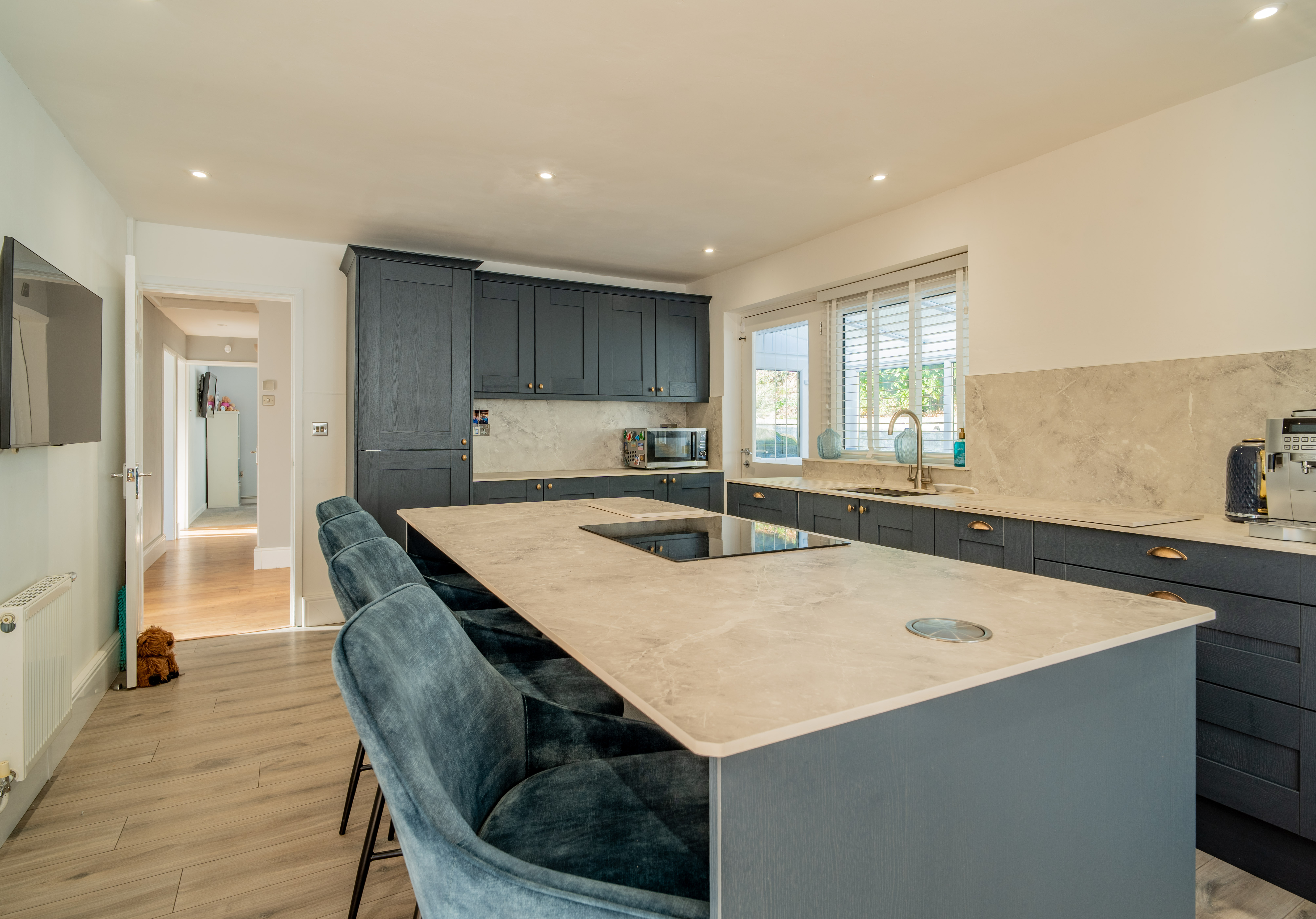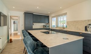 The open-plan kitchen/dining room has been refitted to an exceptional standard with an extensive range of units, compact-laminate work surfaces and integrated appliances, creating a sociable space perfect for entertaining. A door leads to a generous utility room with additional storage and access to the garden.