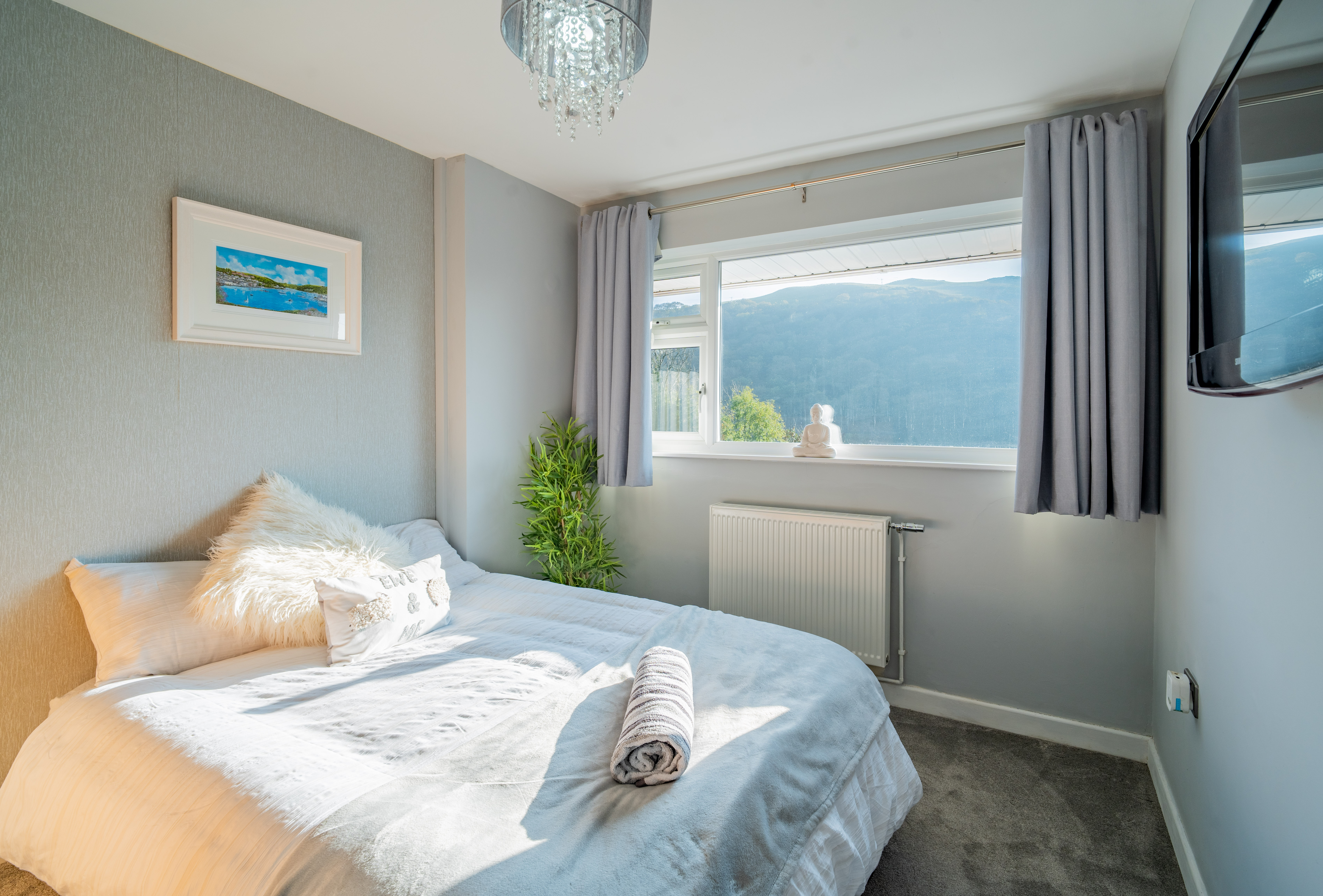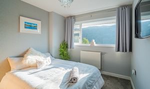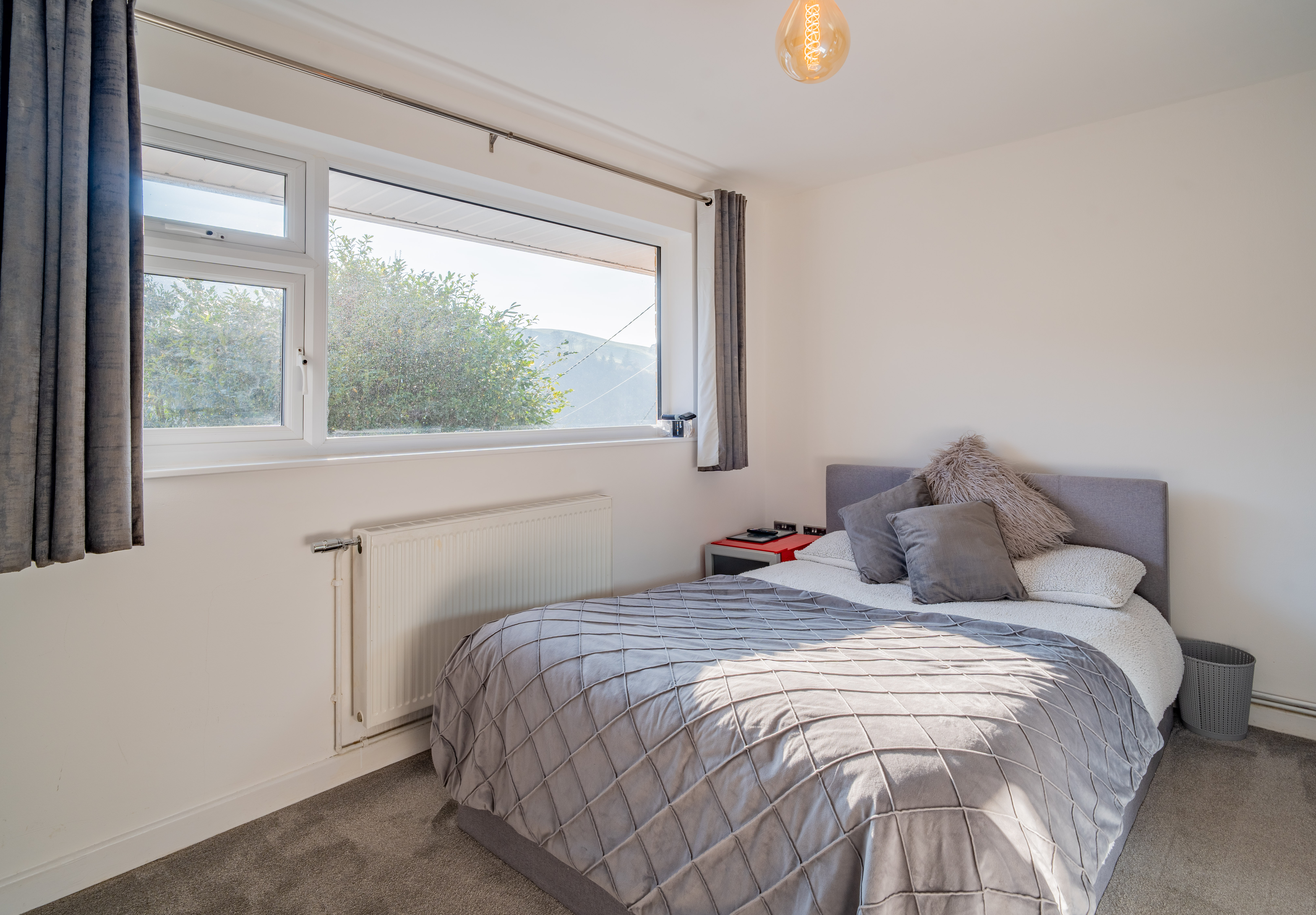 Spacious rear bedroom overlooking the terraced gardens and valley views, ideal as a principal or guest room.