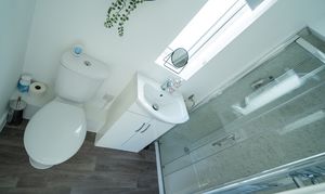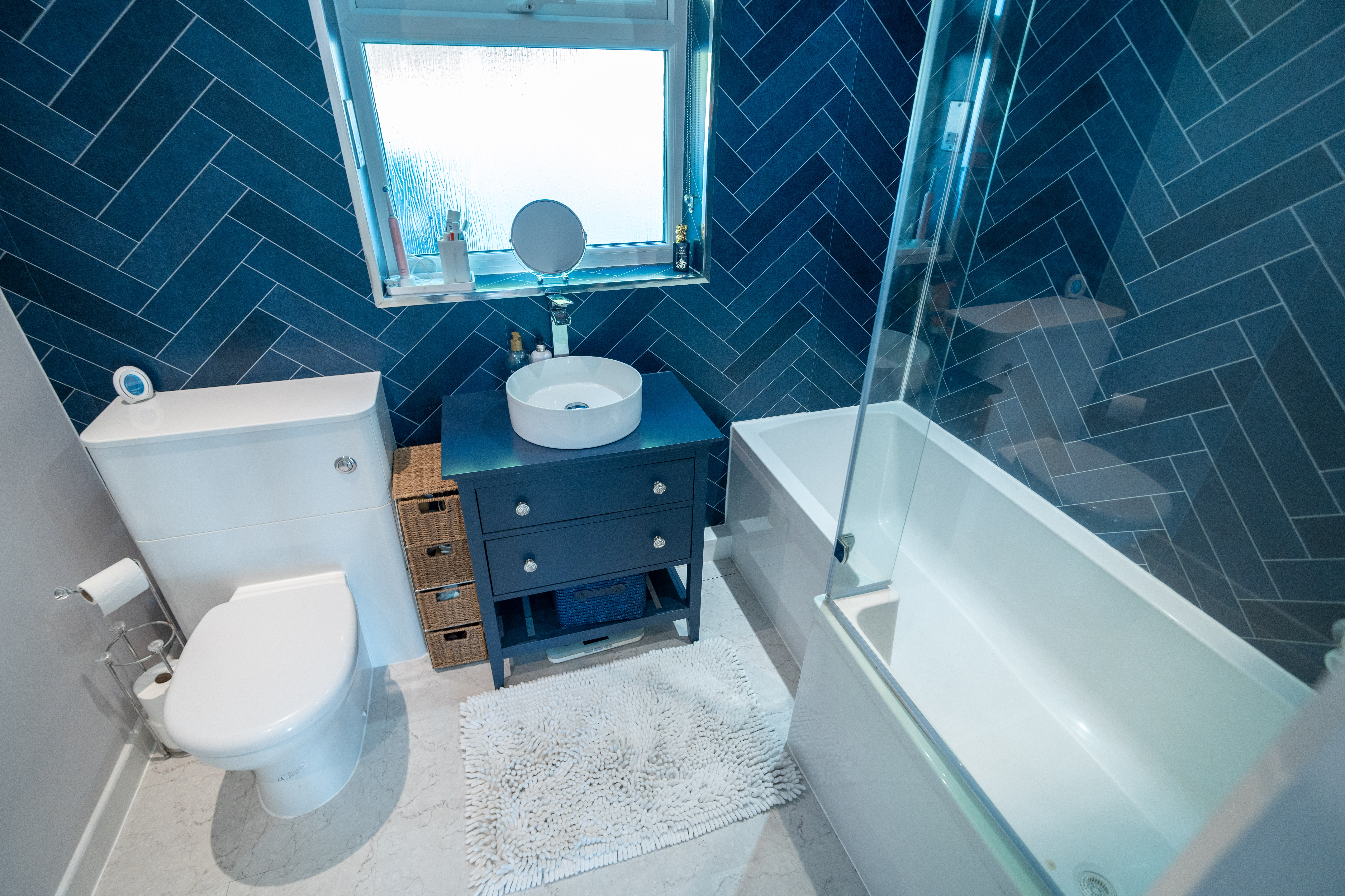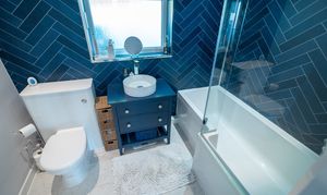 A newly fitted modern family bathroom offers panelled bath with rainfall shower over, vanity unit and heated towel rail.