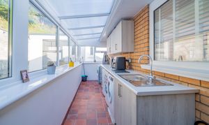 A practical and well-equipped utility room fitted with a sink and drainer, complemented by newly installed kitchen units providing ample additional storage. This versatile space also serves as a convenient laundry area, ideal for managing household chores with ease. Perfectly located for use after working in the garden — a great place to clean up and keep the main living areas tidy.