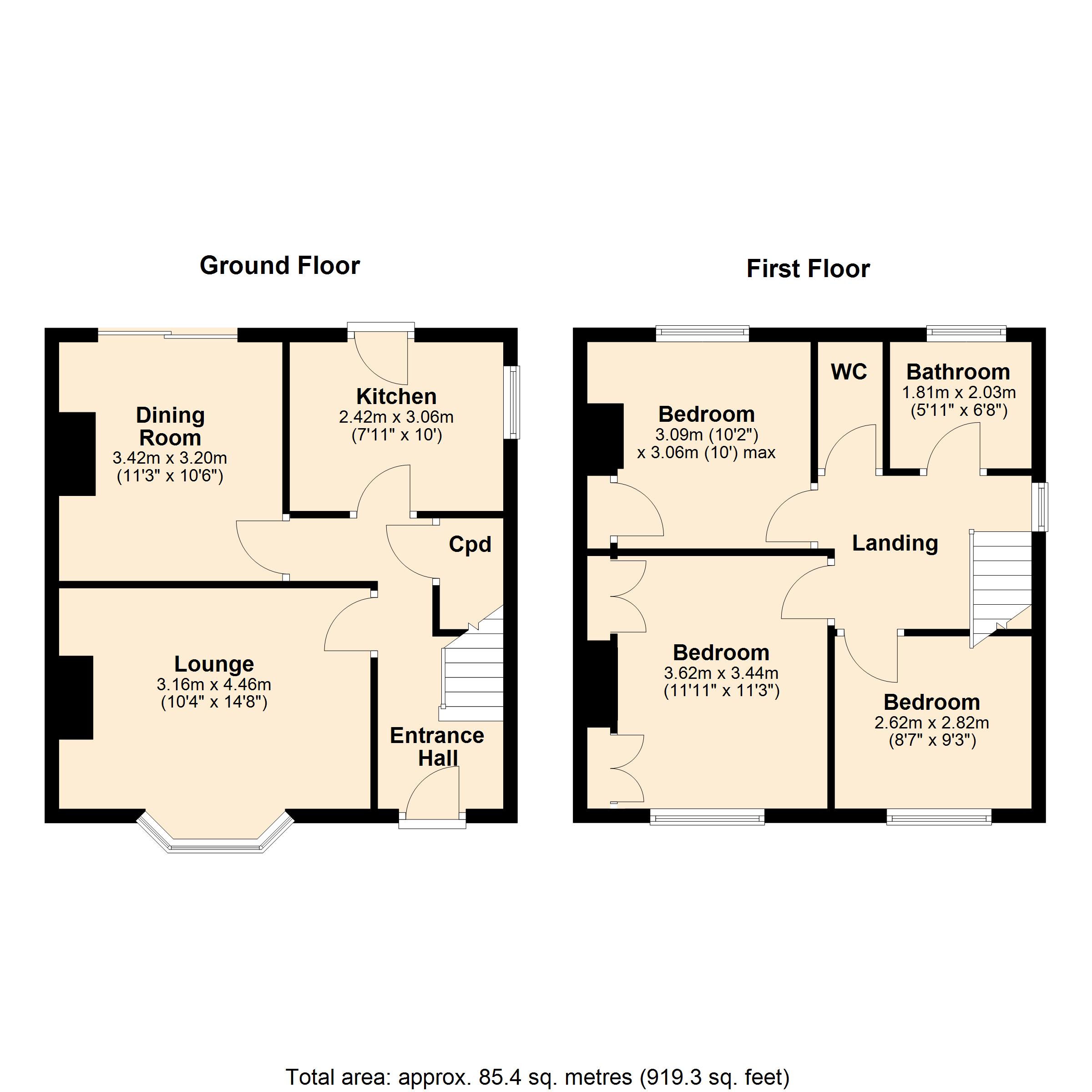 The property is set back from the road and opens into an enclosed hallway with storage beneath the stairs. The ground floor comprises a spacious lounge to the front, complete with a bay window, along with a dining room to the rear complete with an original feature fireplace. The kitchen has access into the rear garden. Upstairs, three bedrooms are provided along with the bathroom and separate WC. Although in need of modernisation, ample living space is provided. Gas central heating is supplied throughout.