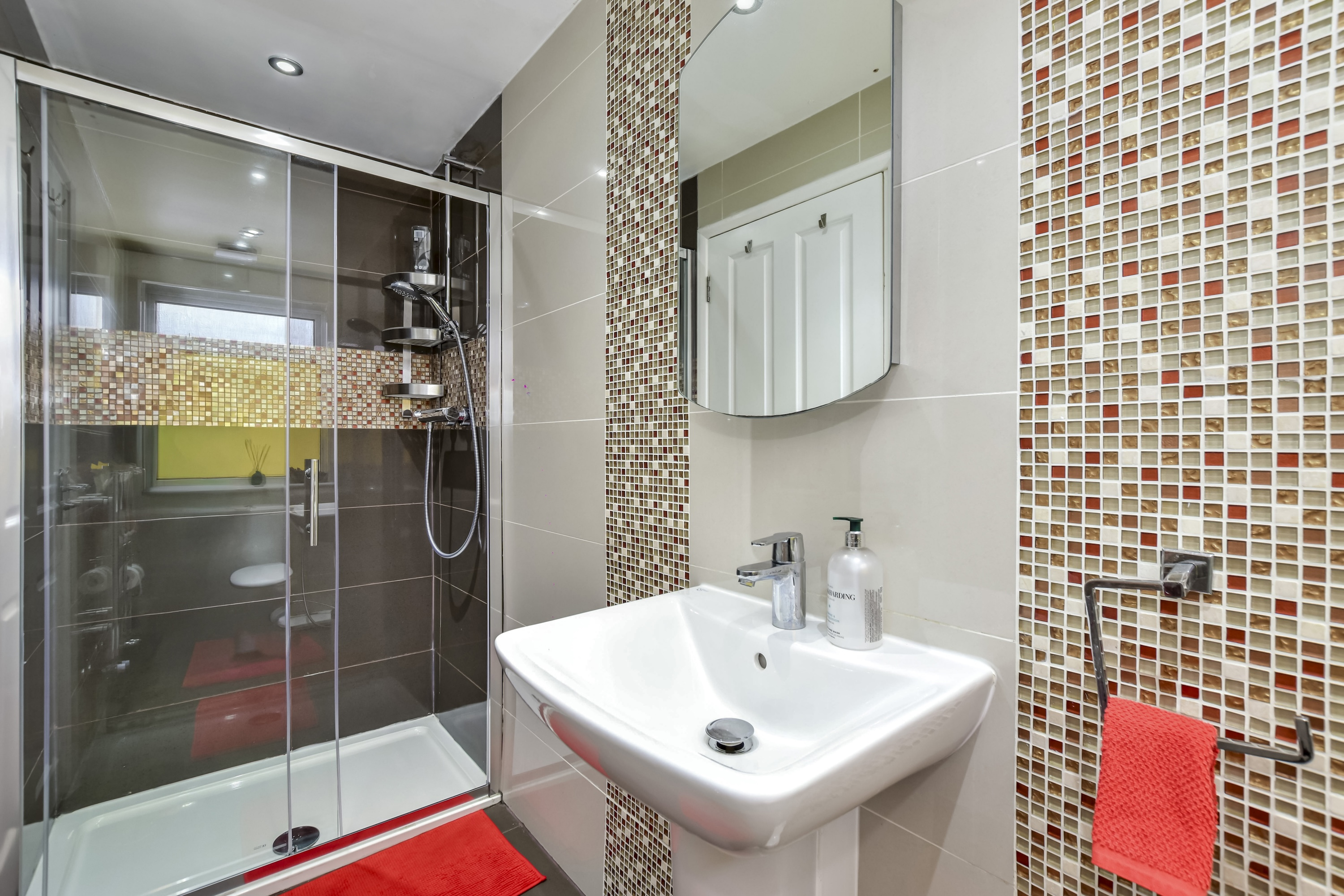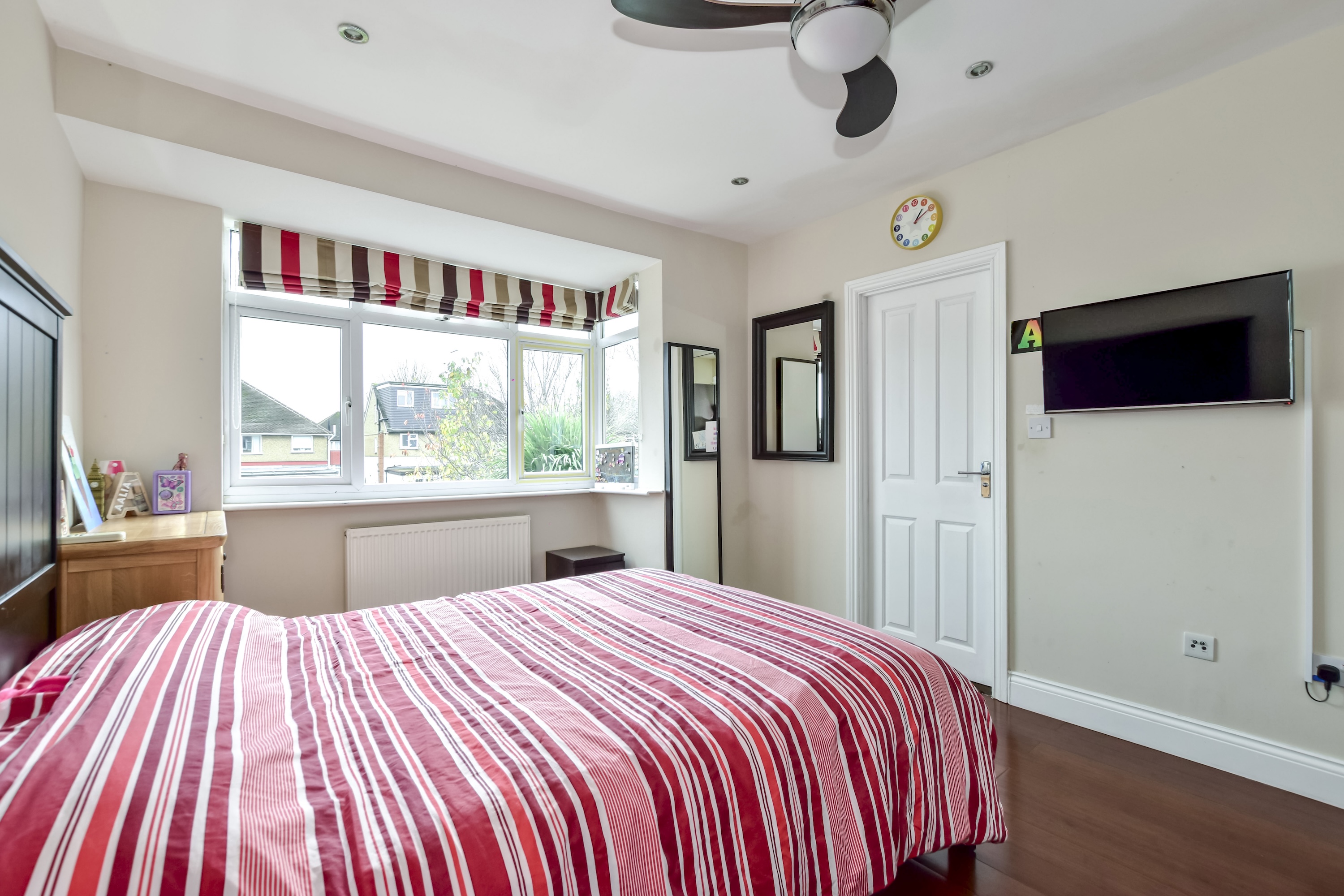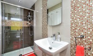 The first floor hosts three bedrooms, including two generous doubles and a further single. The second bedroom enjoys direct access to a smart Jack and Jill shower room, shared with the remaining bedrooms on this level, making it a superb layout for families.