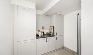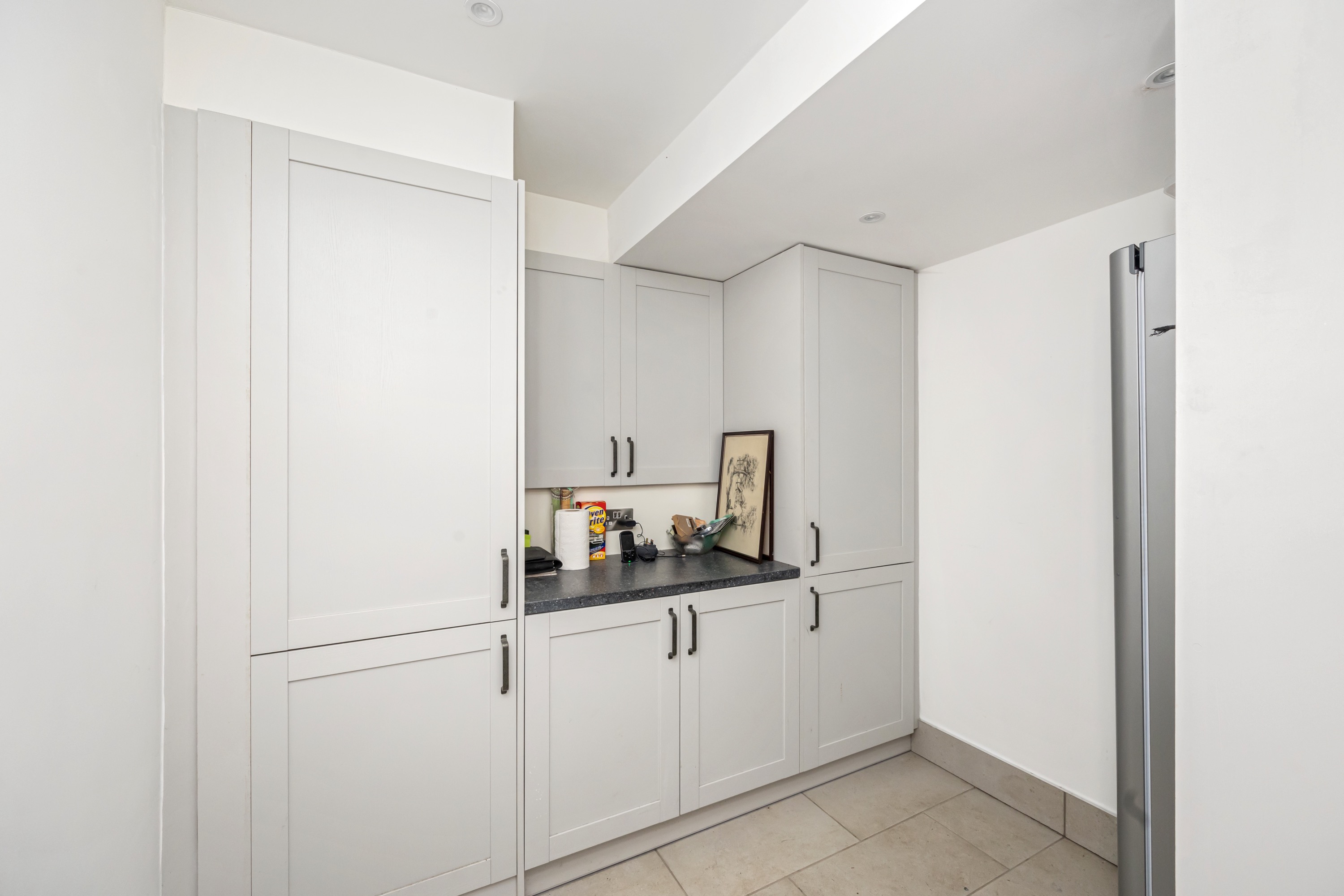 Utility: light Grey kitchen units with black quartz worktops. Space and plumbing for washing machine, space for tall fridge freezer, shoe storage, tiled floor.