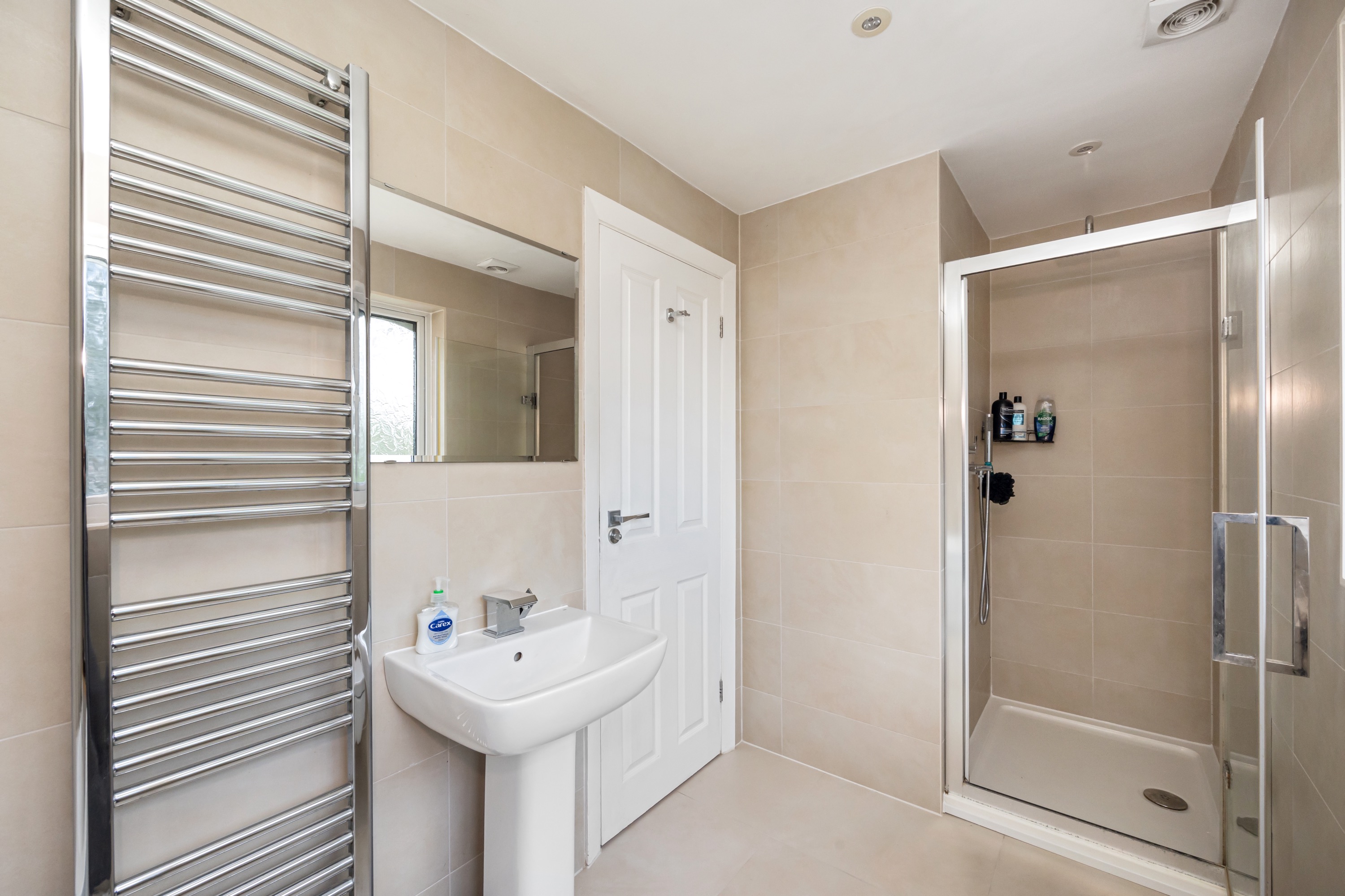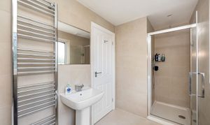 Re-fitted Bath and Shower Room: White suite, panel enclosed bath, pedestal hand basin, low level WC, shower cubicle with twin headed shower, tiled floor and walls, ladder radiator, uPVC double glazed window.