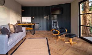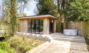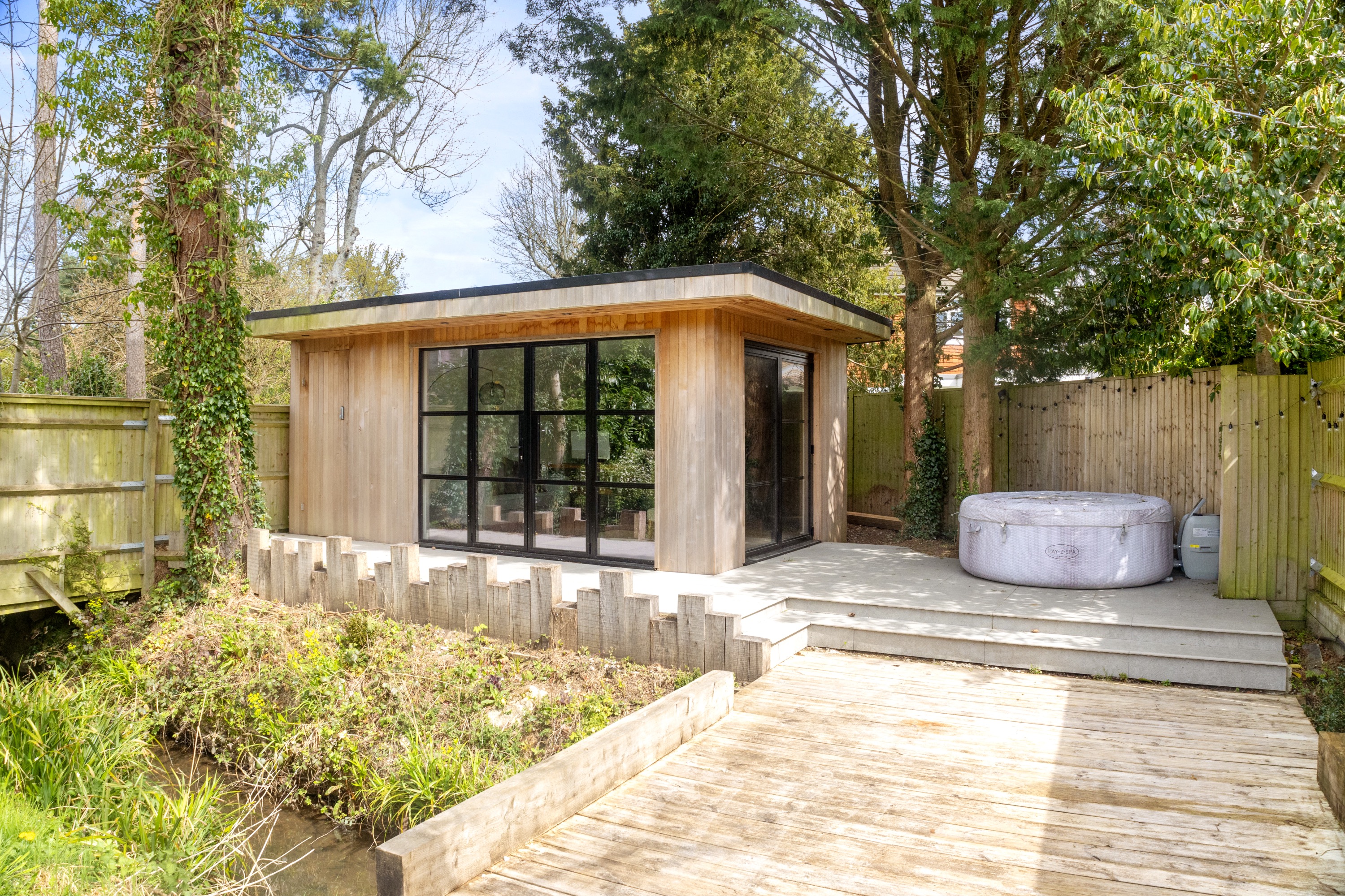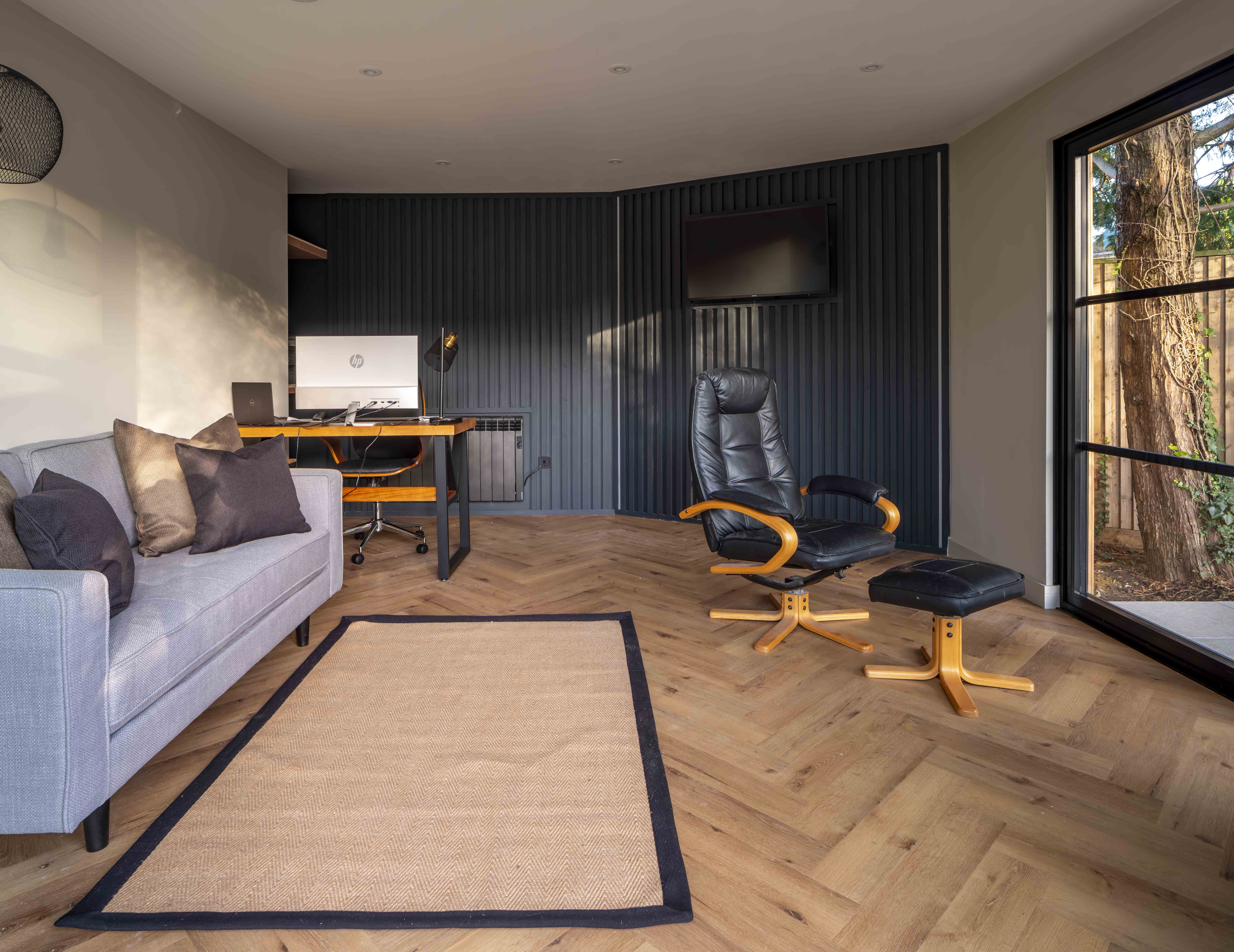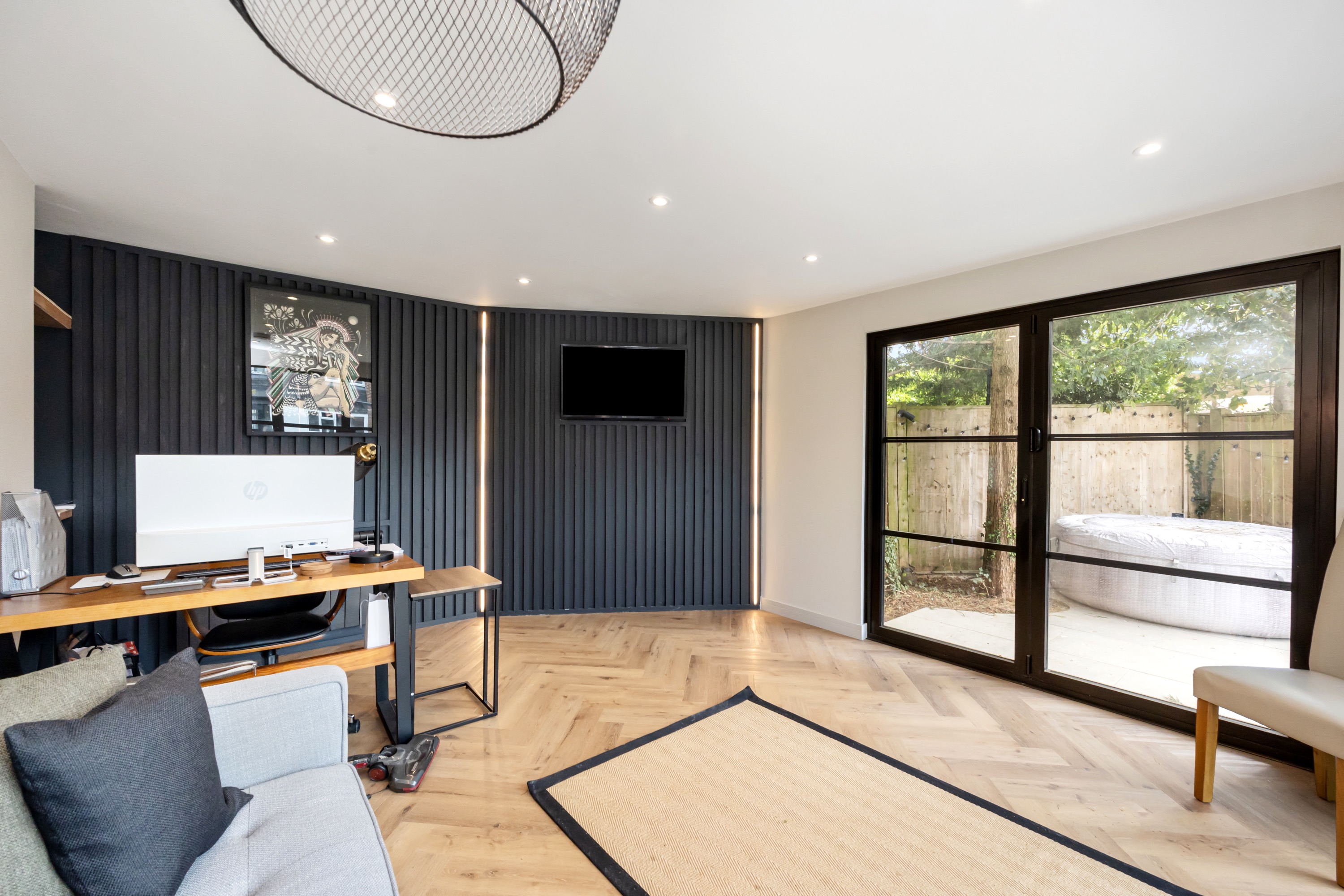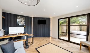 Garden Office: 18’6 × 16’ max. Clad in western red cedar, boasting herringbone LVT flooring. One set of French doors, one set of bi-folding doors, lighting and power with app controlled heating, fully insulated. The office has WAP (wireless access point), ultra high speed broadband and can be used as an office, gym or other. There is an adjoining lockable store room and space behind the office building ideal as additional storage.