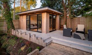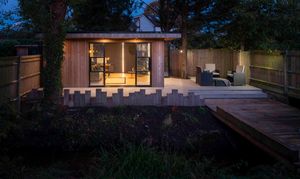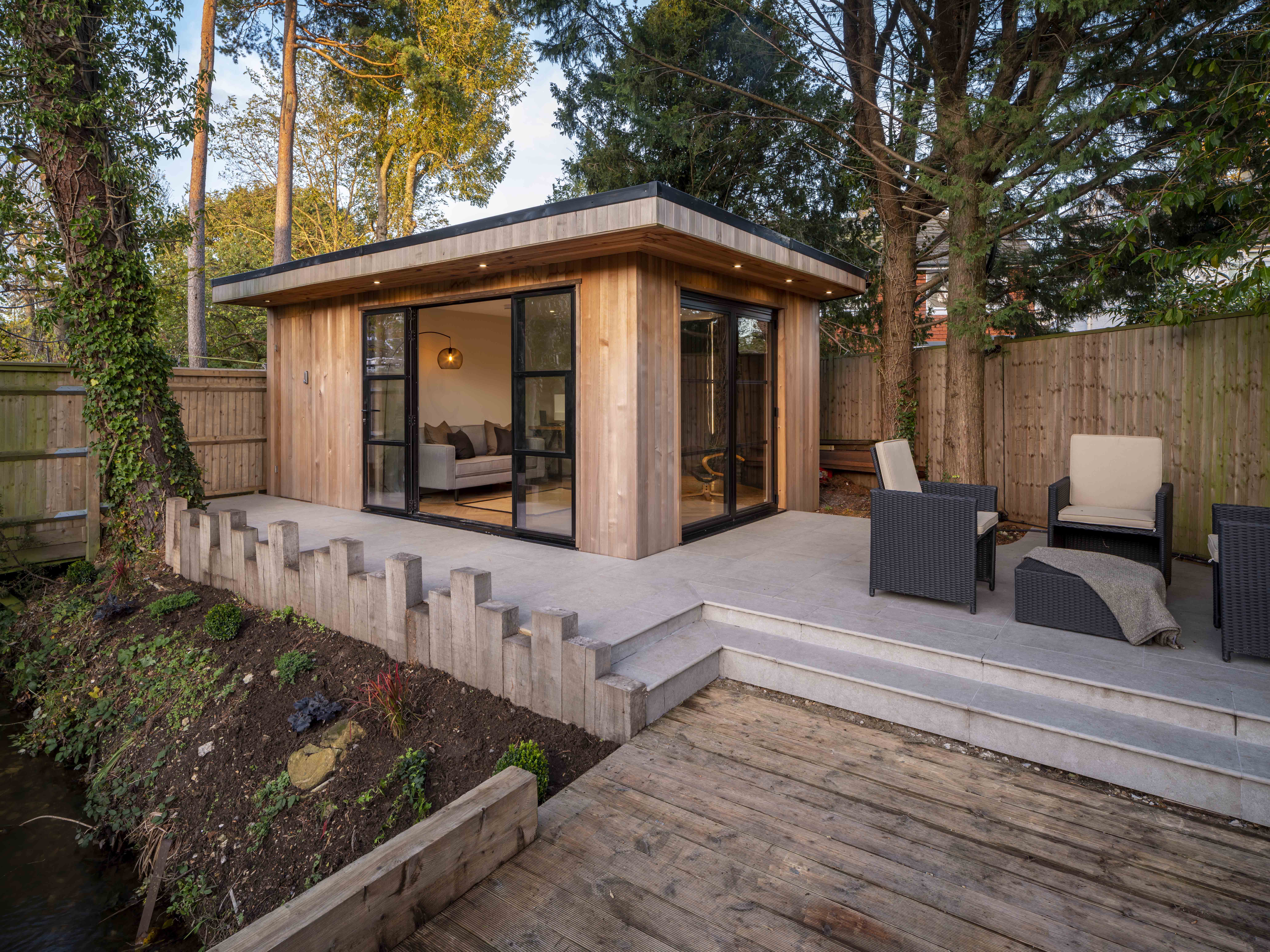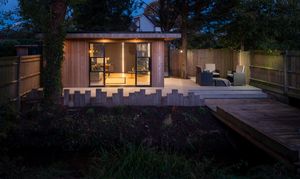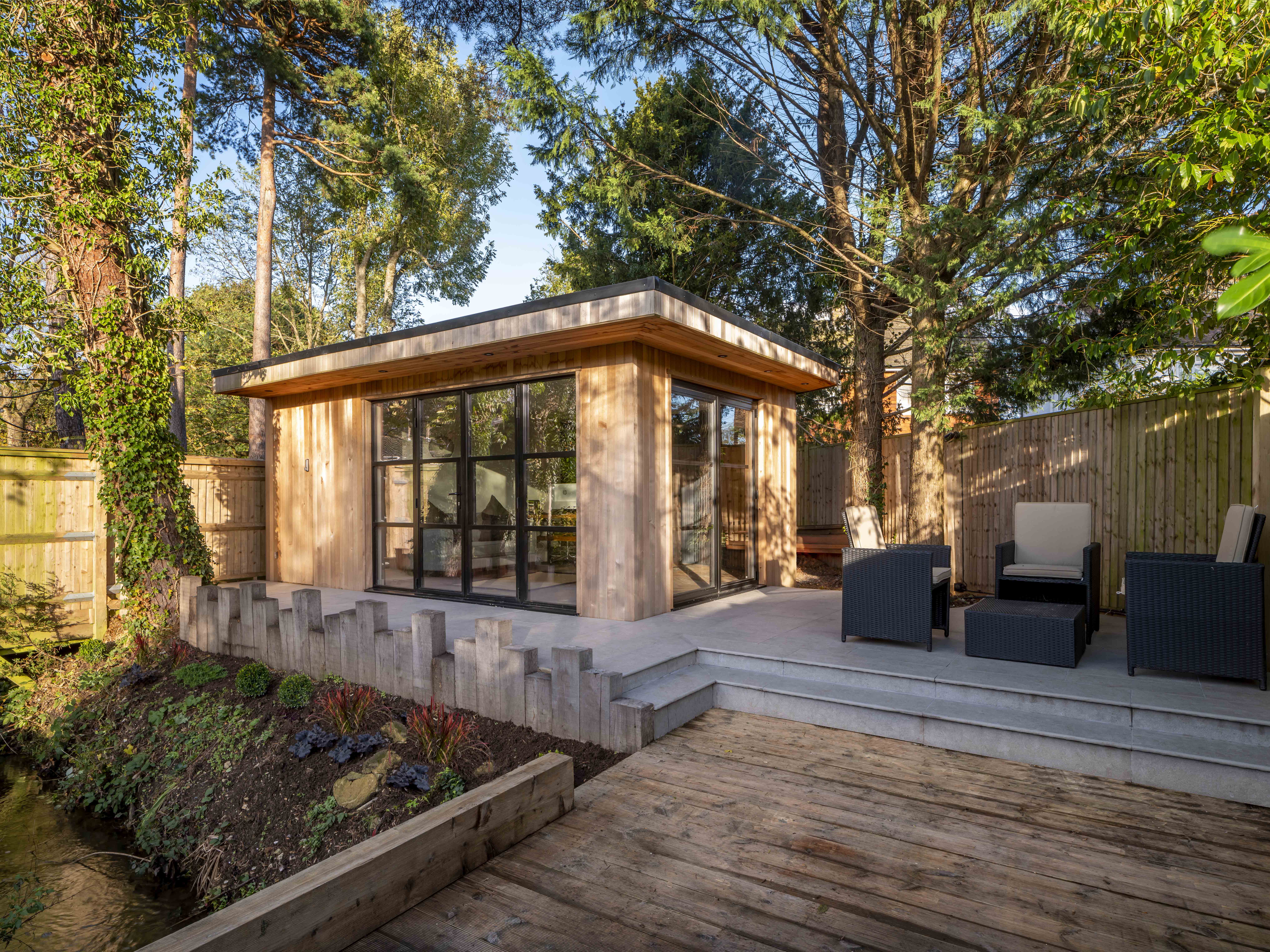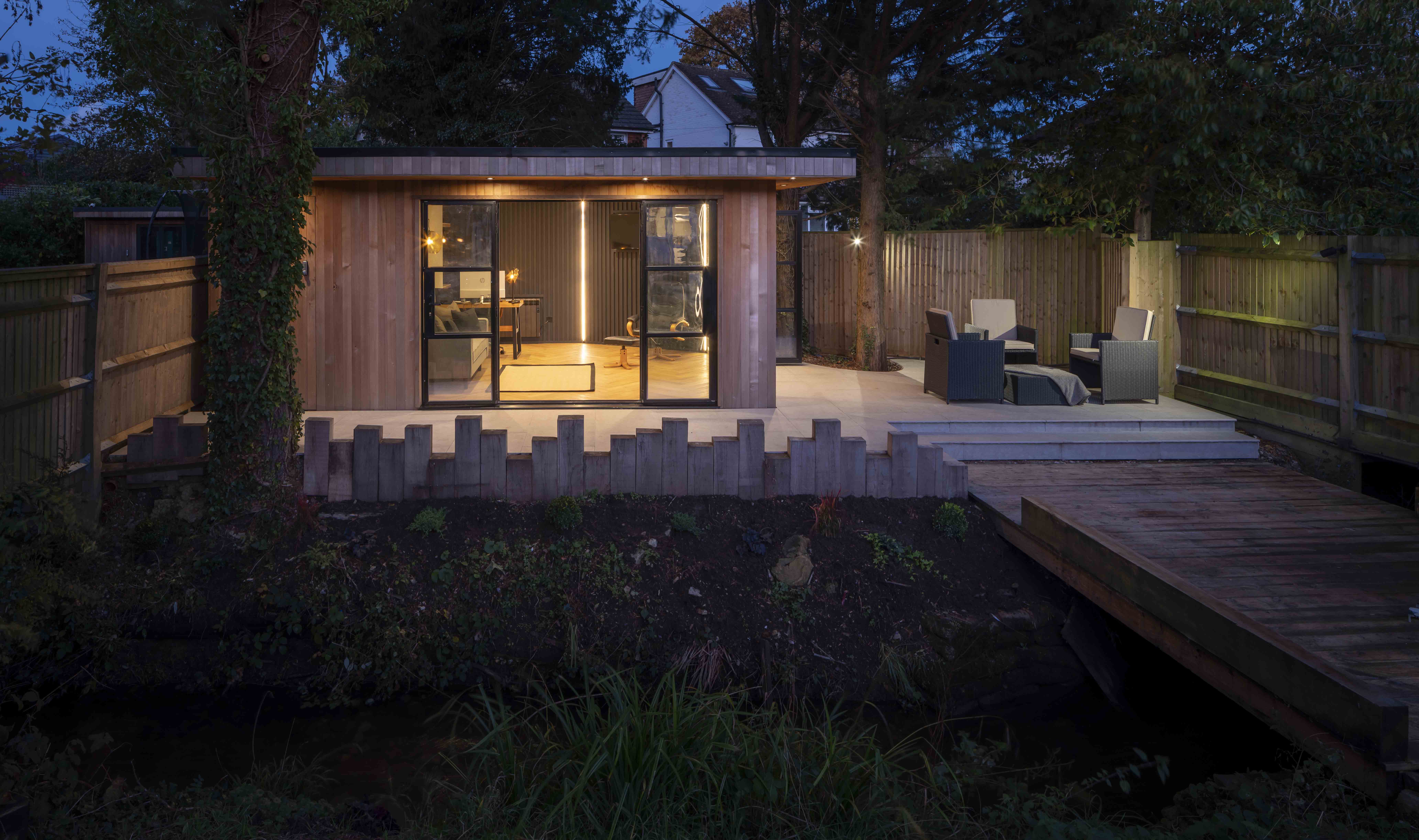Garden Office: 18’6 × 16’ max. Clad in western red cedar, boasting herringbone LVT flooring. One set of French doors, one set of bi-folding doors, lighting and power with app controlled heating, fully insulated. The office has WAP (wireless access point), ultra high speed broadband and can be used as an office, gym or other. There is an adjoining lockable store room and space behind the office building ideal as additional storage.