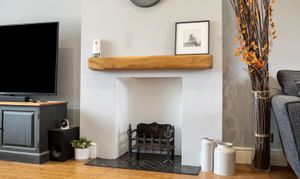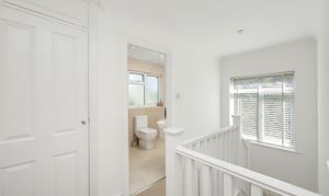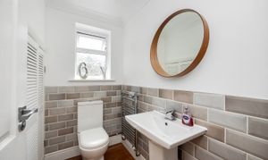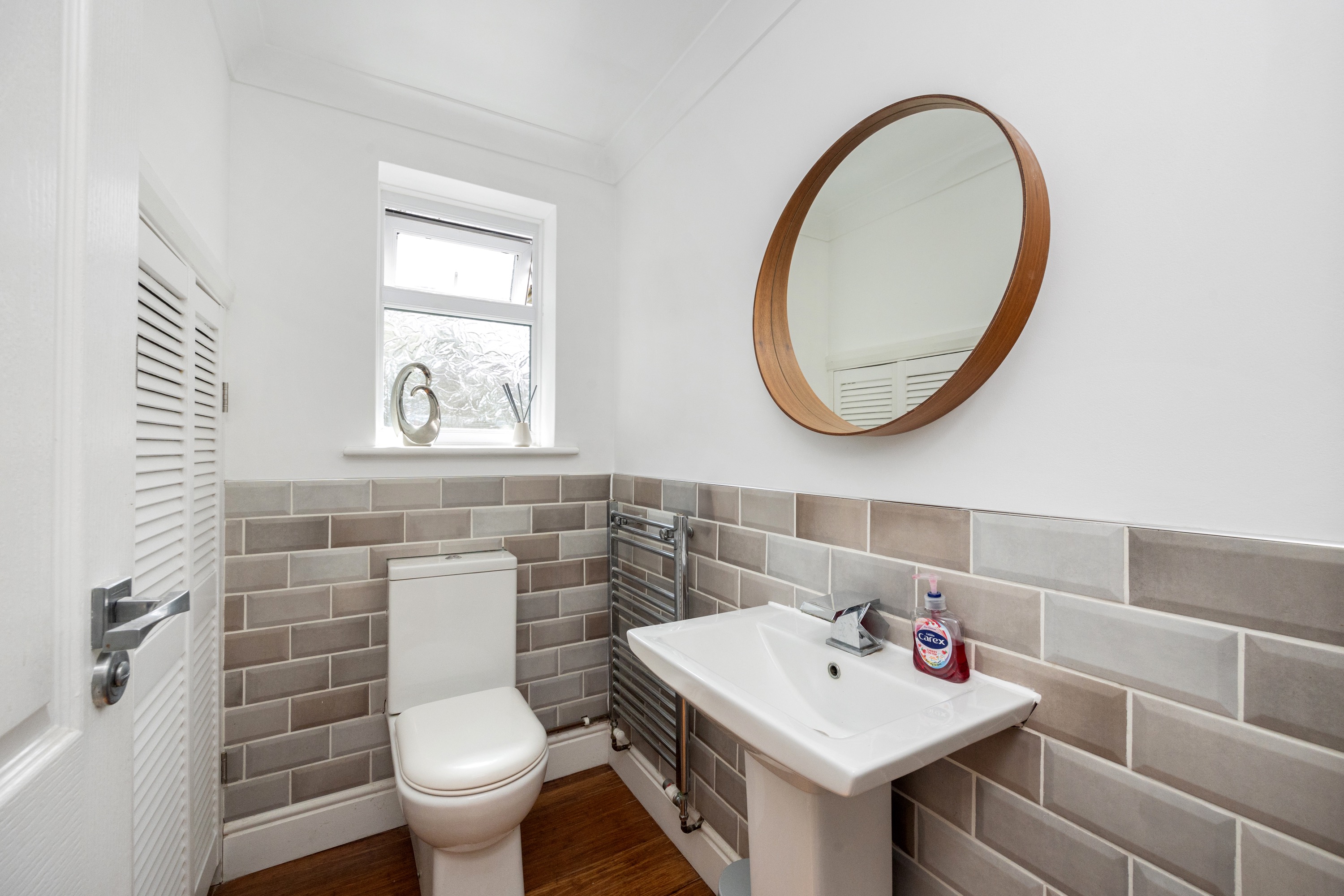 Re-fitted Cloakroom: White suite, low level WC, pedestal wash hand basin, bamboo wood floor, half tiled walls, Radiator/towel rail, uPVC double glazed window, louvre fronted understairs storage cupboard.