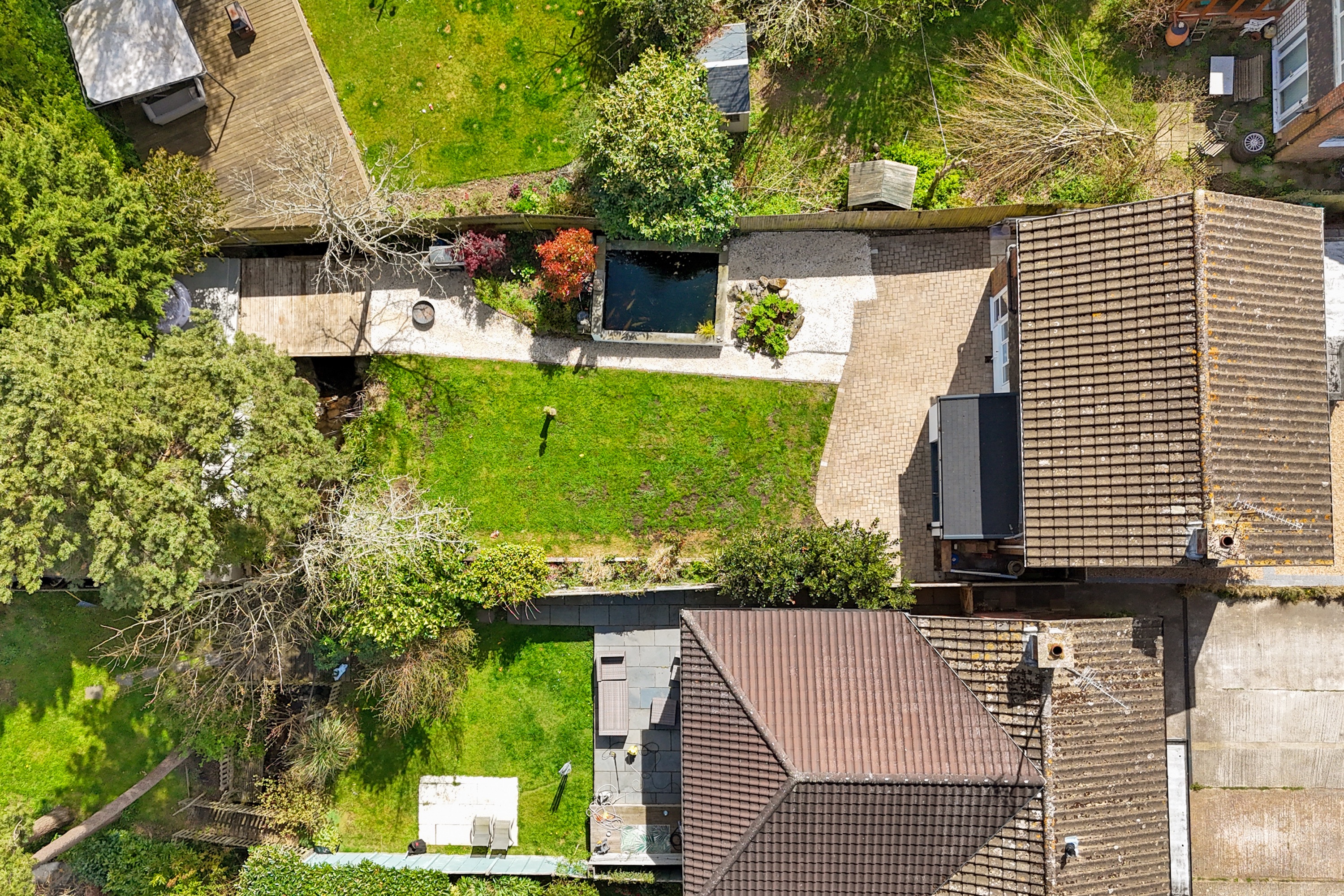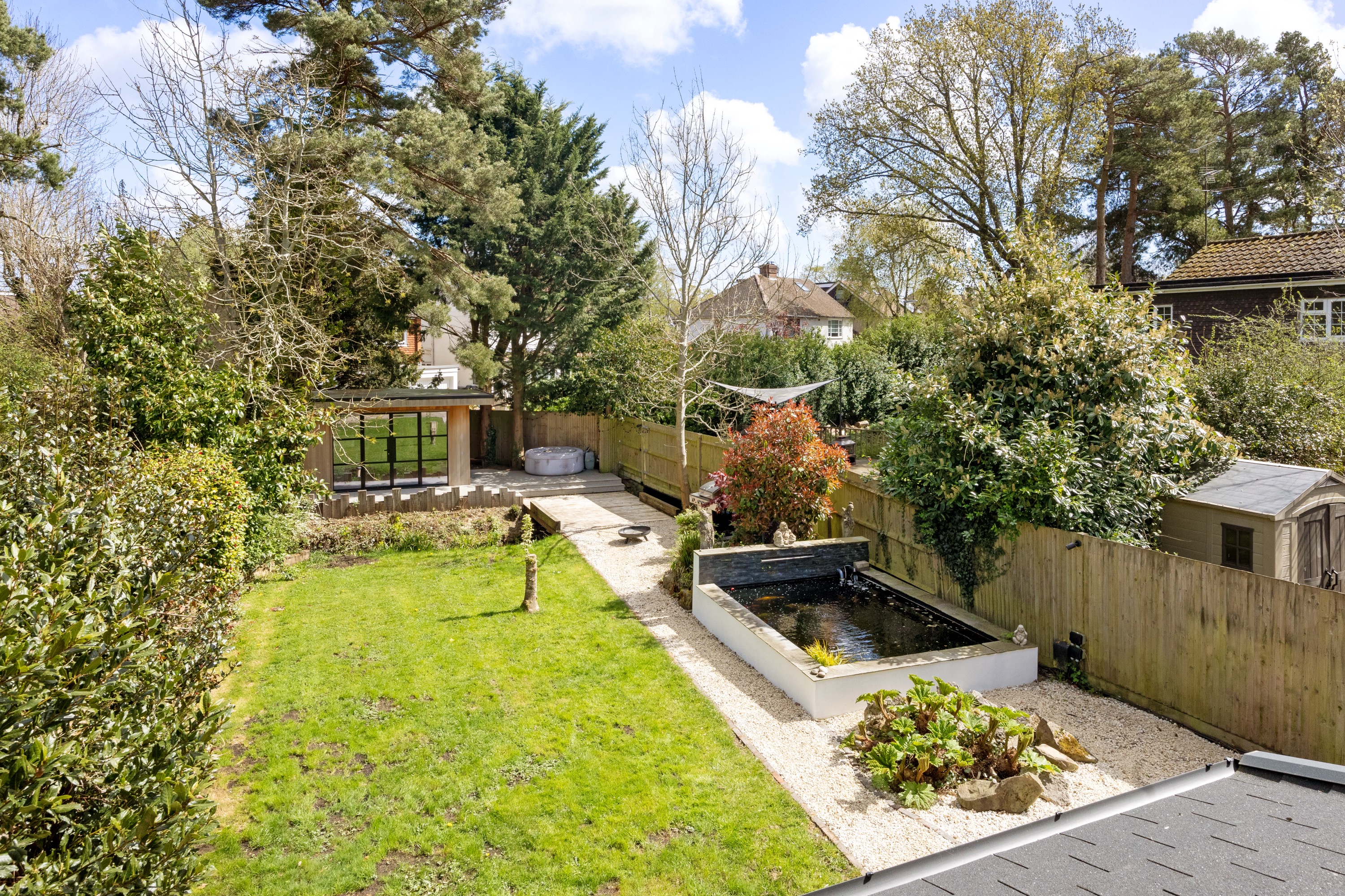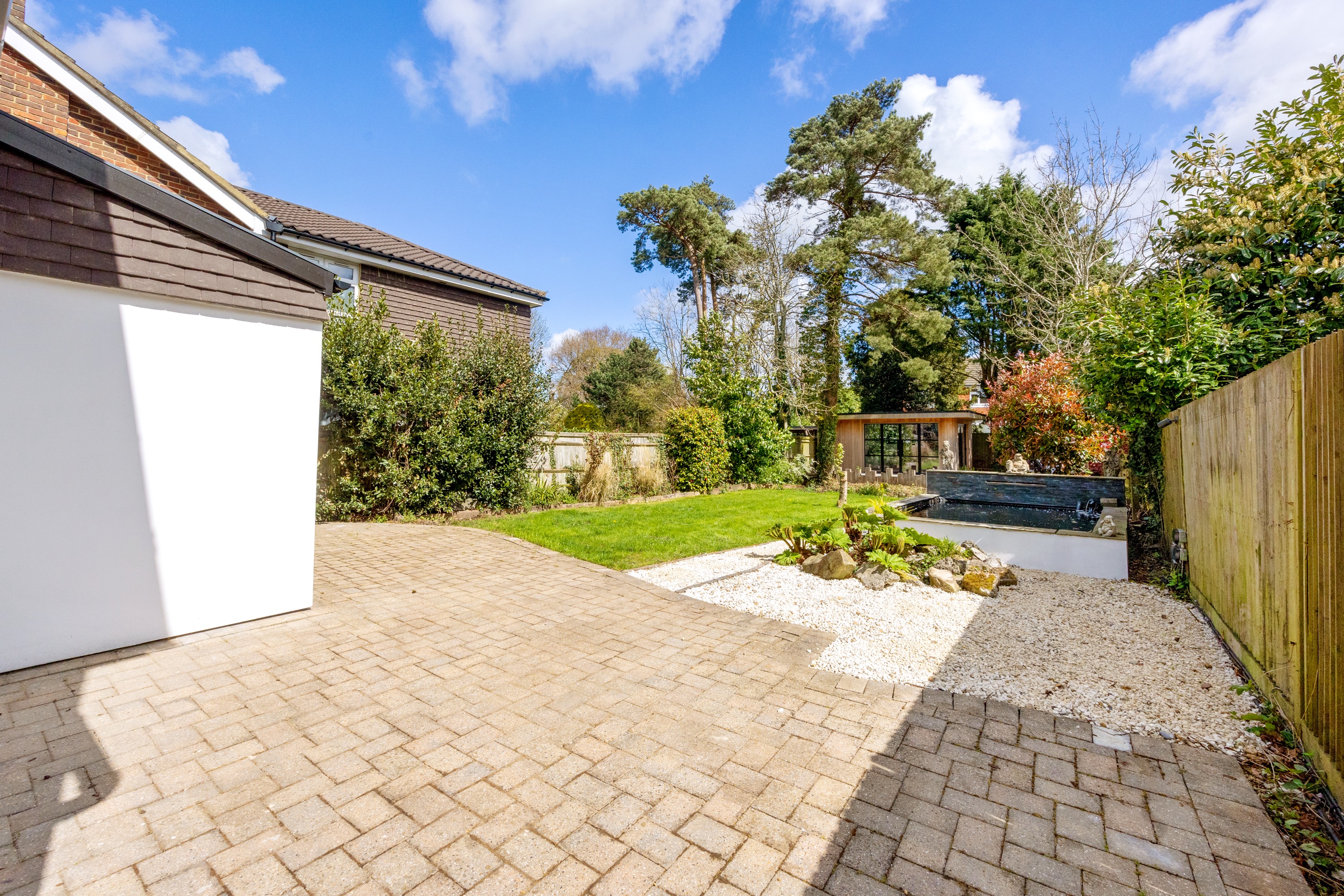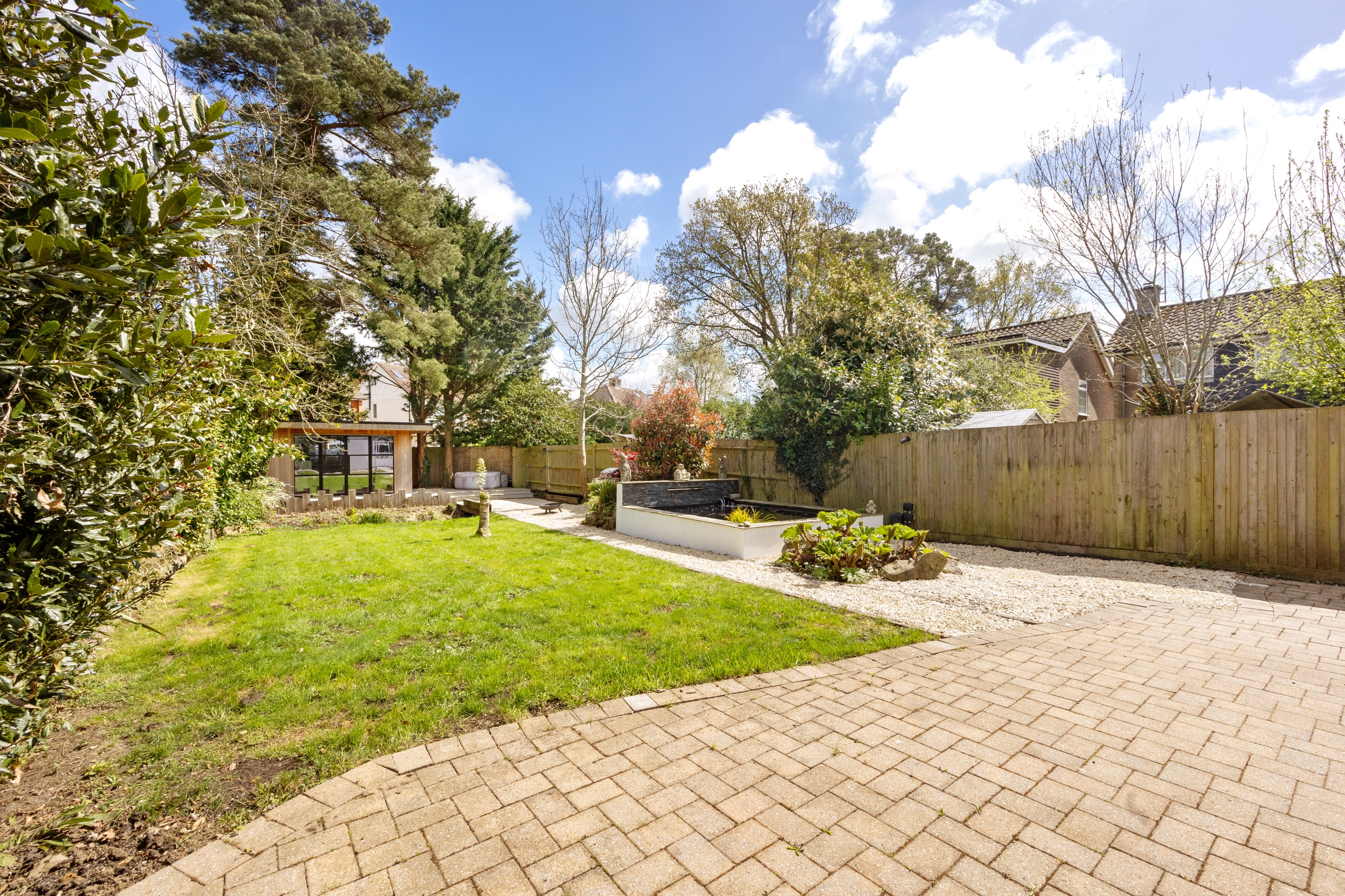 Rear Garden: 100’ long, East facing, block paved patio adjoins house, level lawn, ornamental fish pond, lighting and power, small stream and timber bridge to further porcelain patio with beautiful garden lighting and: