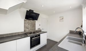 Re-fitted Kitchen: White High Gloss soft close wall and base units with contrasting black quartz worktops, 1 and half bowl/drainer sink unit, electric oven with five ring gas hob and ‘Cookology’ fitted hood over, integrated dishwasher, integrated fridge, tiled floor and splashbacks, uPVC double glazed window’s and door to rear garden.