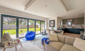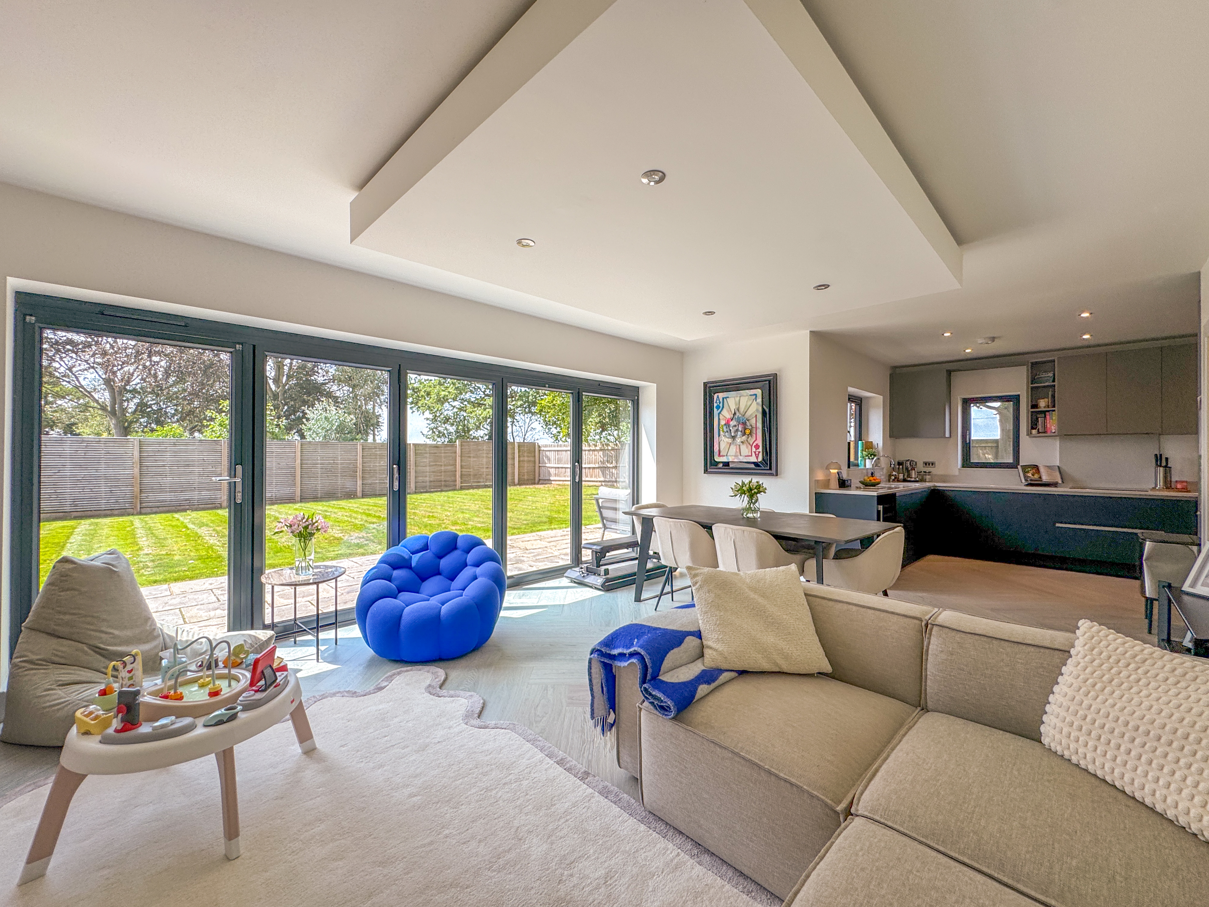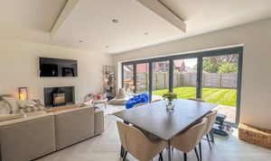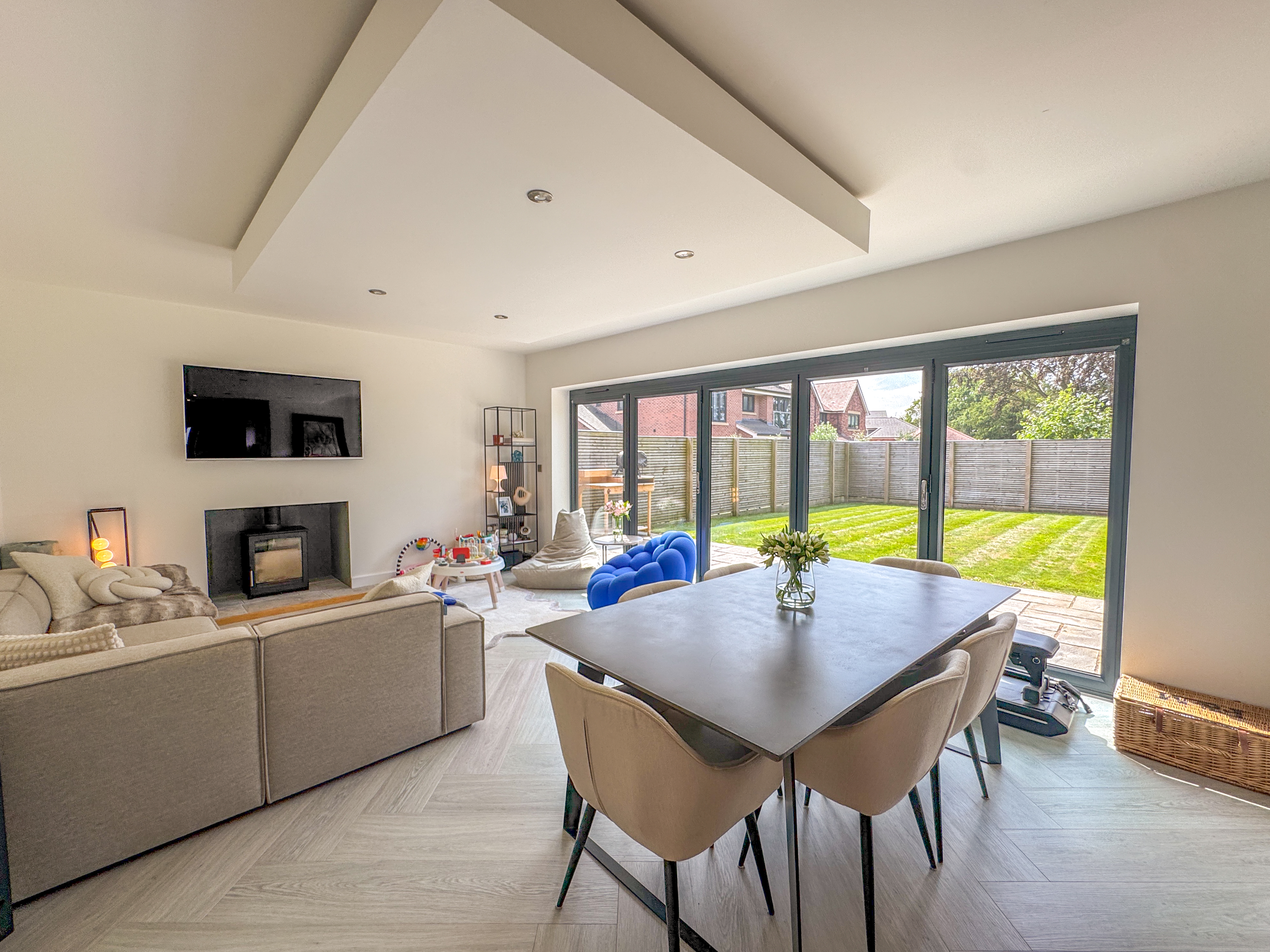 This remarkable space is finished with a wood-burning stove and dual bi-fold doors opening onto the rear terrace and gardens, seamlessly connecting the indoor and outdoor spaces.