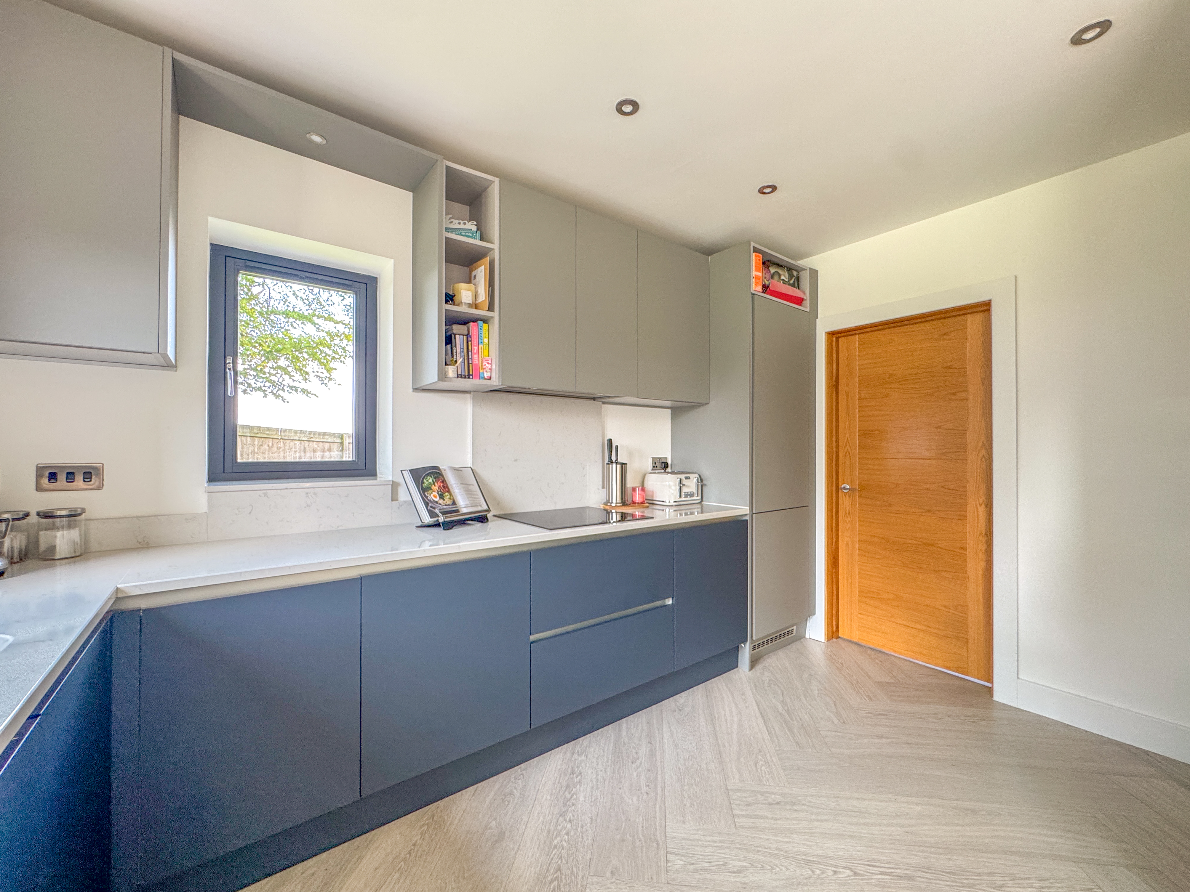 A separate utility room matches the kitchen in style and function, with additional base units, quartz surfaces, plumbing for laundry appliances, and external access to the garden.