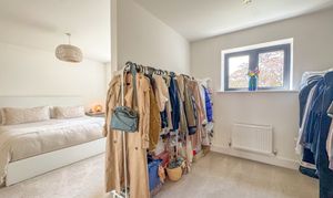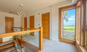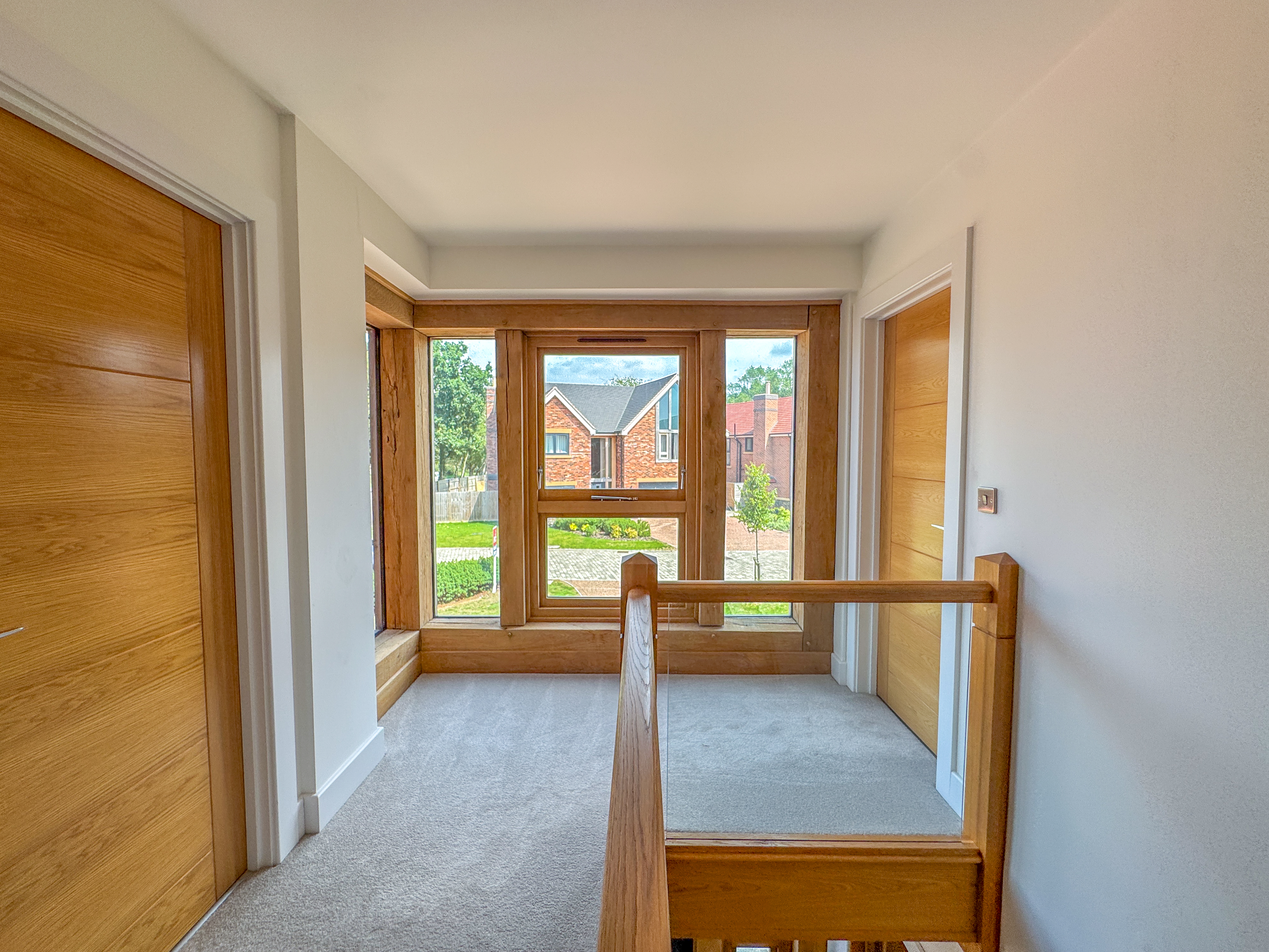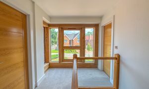 Upstairs, the galleried landing continues the sense of openness and architectural drama, framed by the same full-height oak windows seen on the ground floor. The principal bedroom suite is a luxurious haven, complete with a private dressing area and a beautifully finished en-suite featuring a double walk-in shower with rainfall and handheld heads, a floating vanity basin, and contemporary fittings. The remaining two bedrooms are both generous doubles, with one including fitted wardrobes and the other offering lovely views over the rear garden.