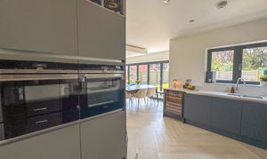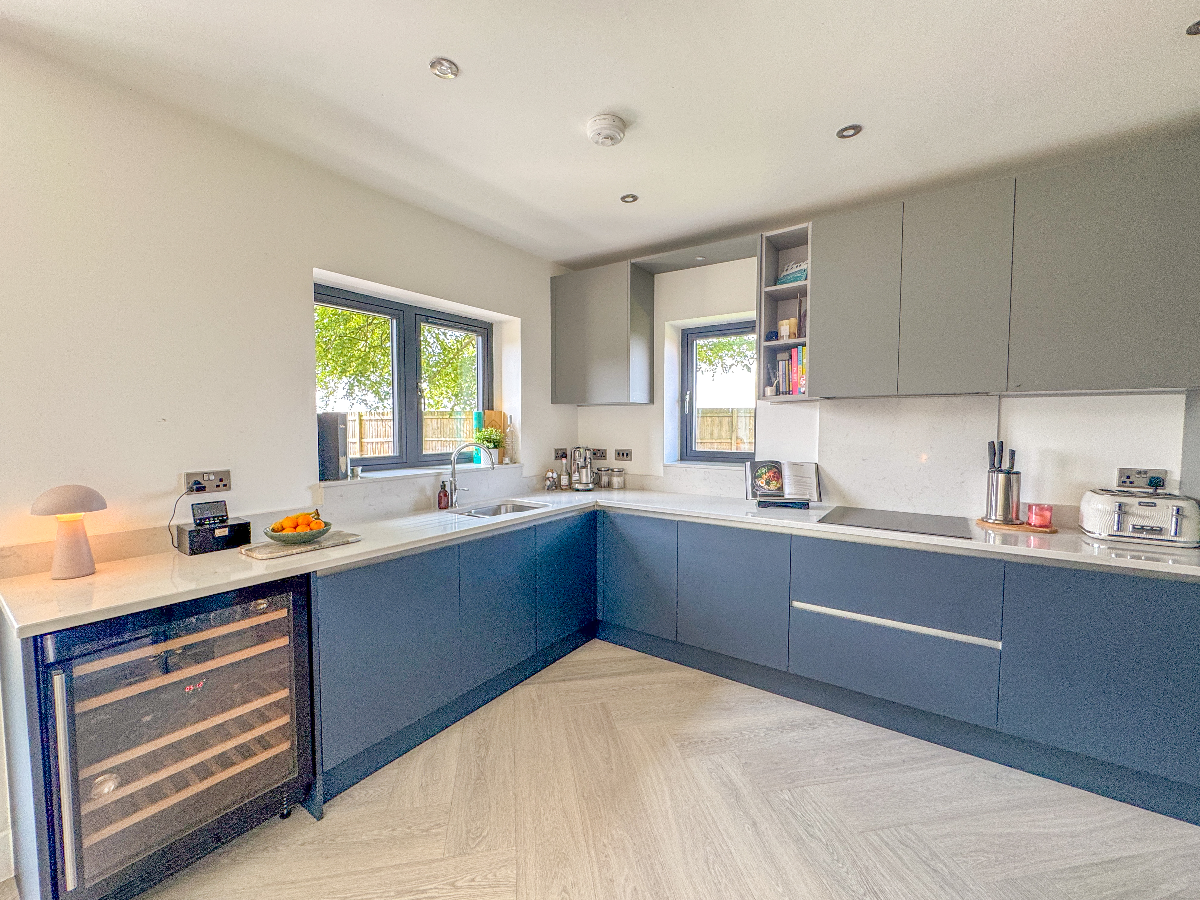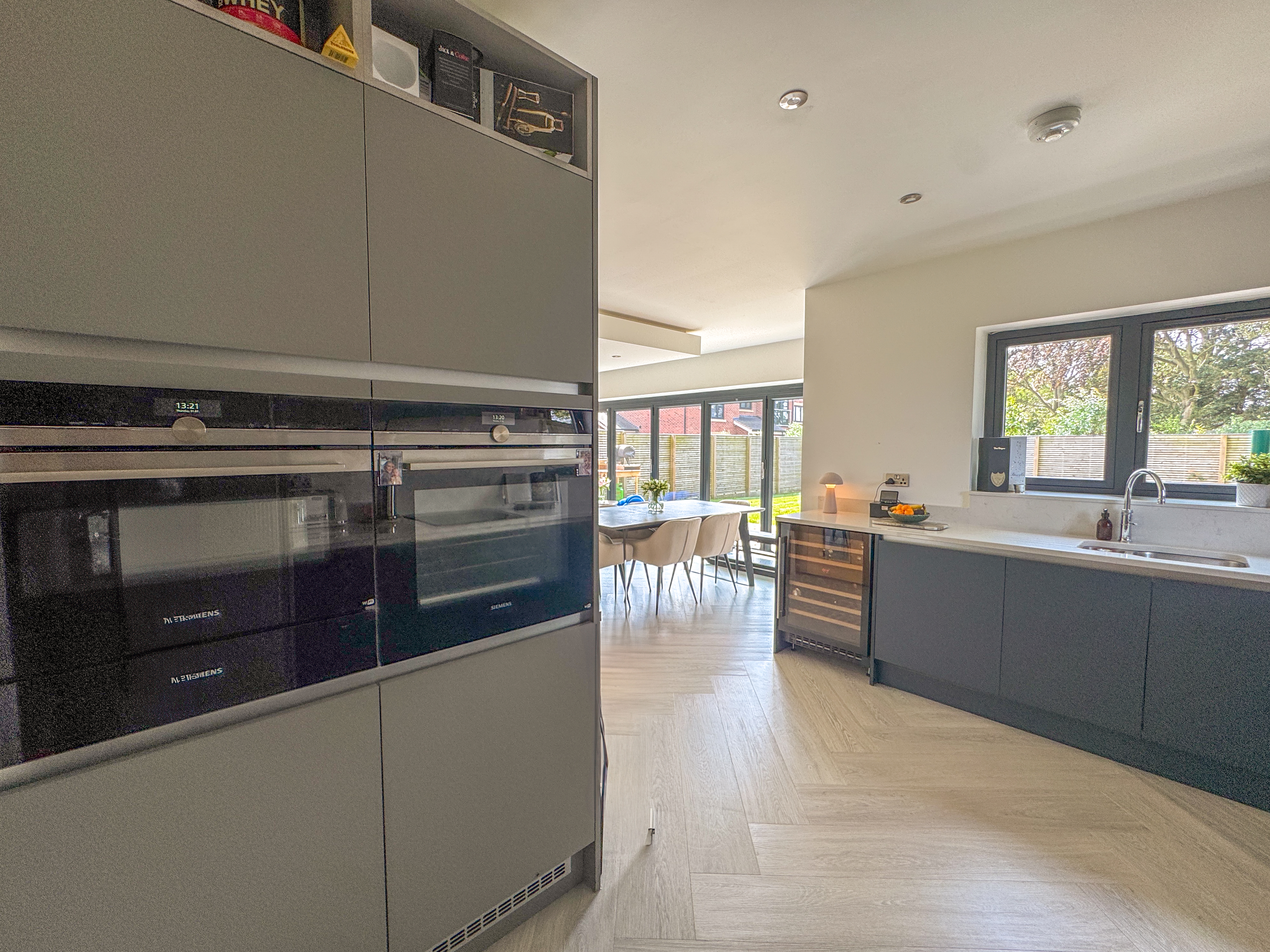 The heart of the home lies to the rear, where a spectacular open-plan kitchen, dining, and living space offers effortless flow and the ideal setting for everyday life and entertaining. The kitchen is fitted with a high-end range of sleek cabinetry topped with luxurious quartz worktops, and features a full suite of integrated Siemens appliances, including two ovens (one with a combination microwave and warming drawer), an induction hob with extractor, fridge freezer, dishwasher, dual-zone wine fridge, and Quooker boiling water tap.