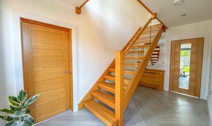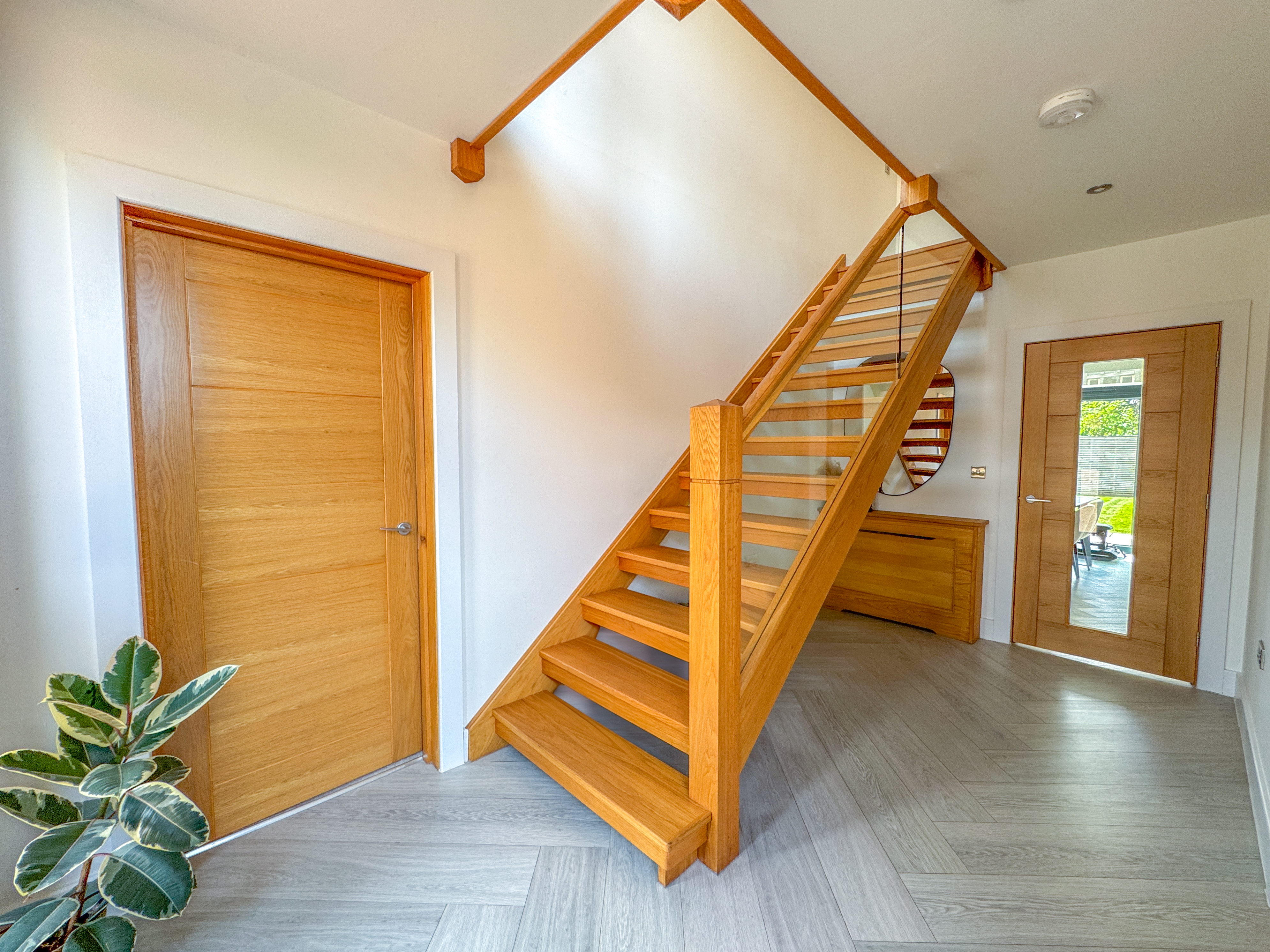From the moment you step inside, the quality of finish and sense of space are immediately apparent. A magnificent reception hall creates a stunning first impression, with a bespoke glass balustrade staircase and full-height oak-framed windows that bathe the interior in natural light. Every detail in this home has been considered to blend timeless elegance with modern comfort, making it perfectly suited to buyers seeking style, practicality, and energy efficiency in equal measure.