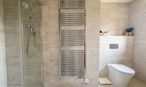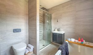 The main family bathroom has been finished to an exceptional standard, featuring a freestanding bath with central tap, a double walk-in rainfall shower, low-flush WC, and elegant fittings by Hansgrohe and Villeroy & Boch.