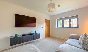 To the front, a beautifully appointed snug provides a quiet retreat—ideal as a reading room, media space, or home office. Off the hallway, a sleek cloakroom features a floating basin and low-flush WC, echoing the home's clean, contemporary design throughout.