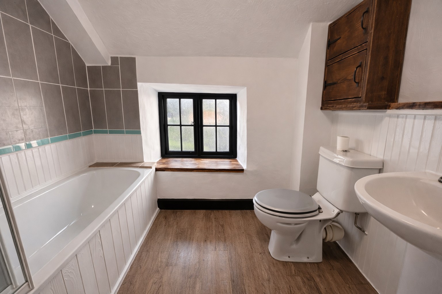 The bathroom includes a bath with shower over, pedestal basin, WC, and tongue-and-groove panelling.