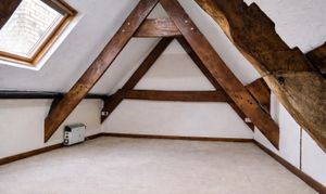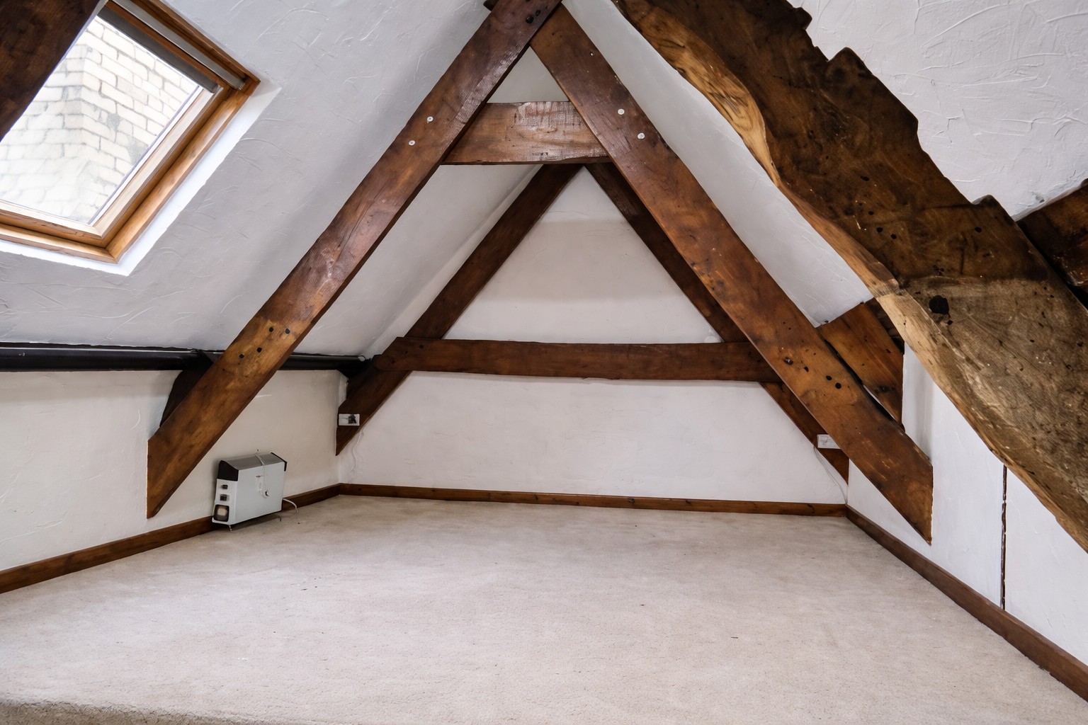 The converted attic offers further versatile accommodation, ideal as a home office, snug, or occasional sleeping space, with exposed oak beams and a Velux window bringing in plenty of light.