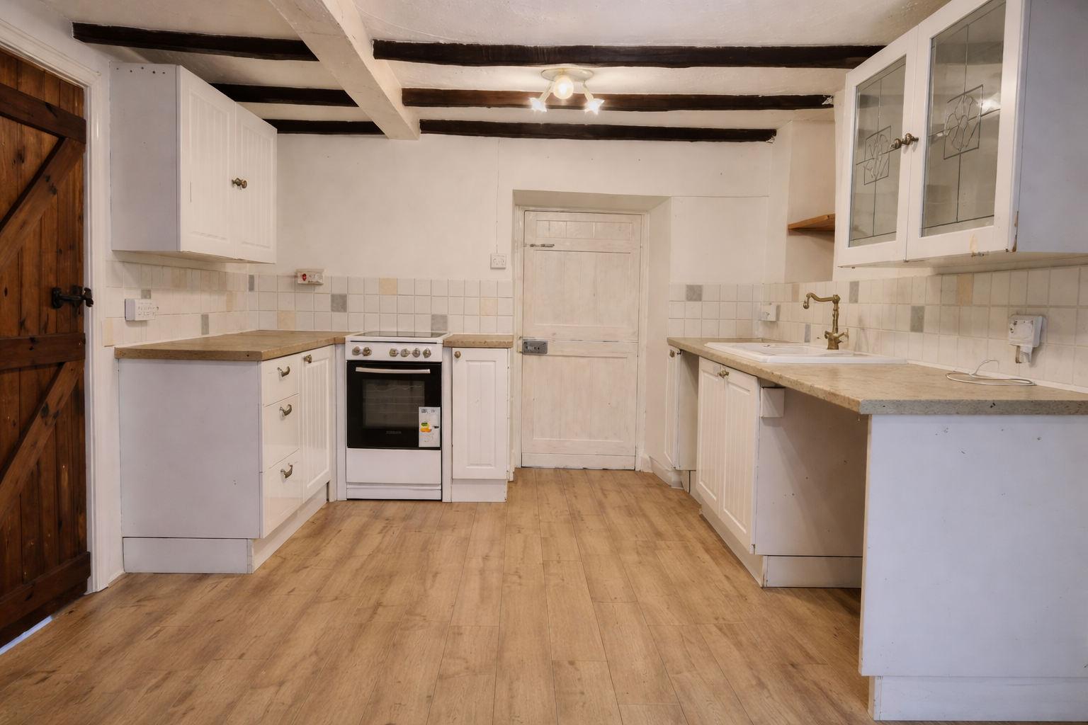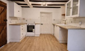 The ground floor features a cosy kitchen/dining room with beamed ceilings, white shaker-style units, wooden worktops, an integrated electric cooker, and plenty of natural light, along with a separate utility area and useful storage.
