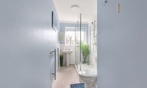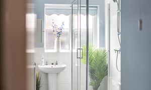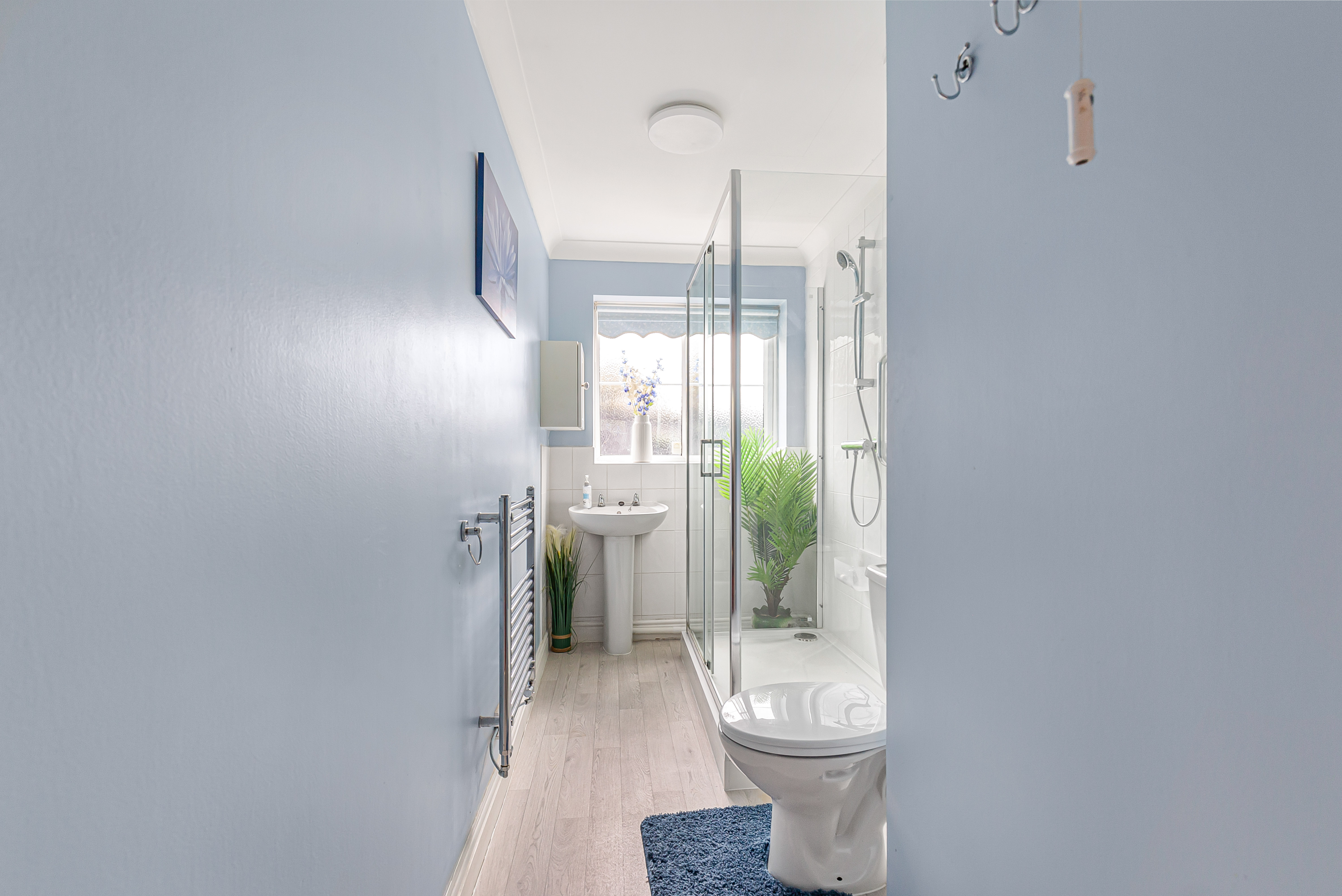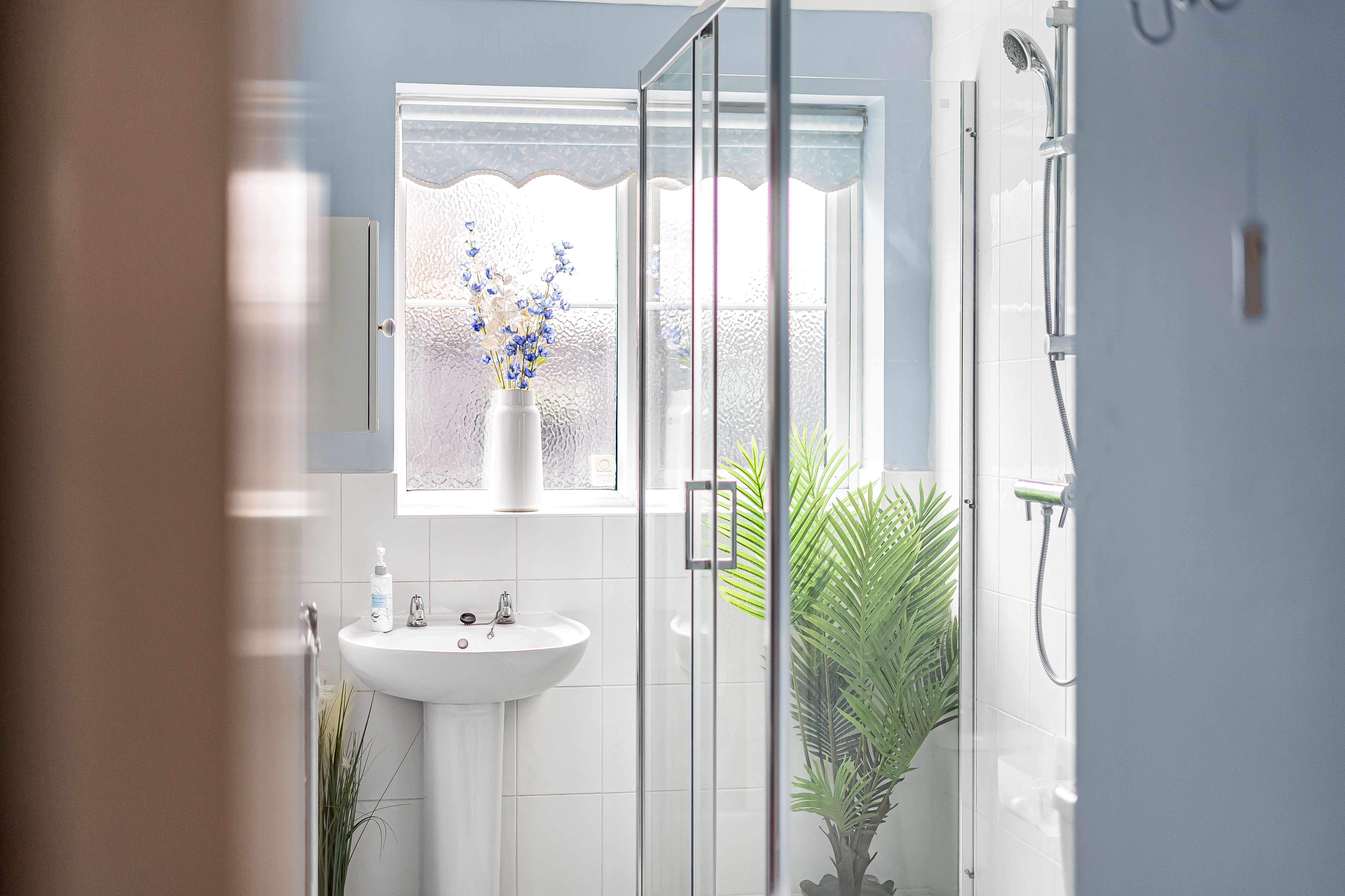 A modern three piece suite comprising double shower cubicle, close coupled WC and a wash hand basin with an obscure window to the side.