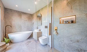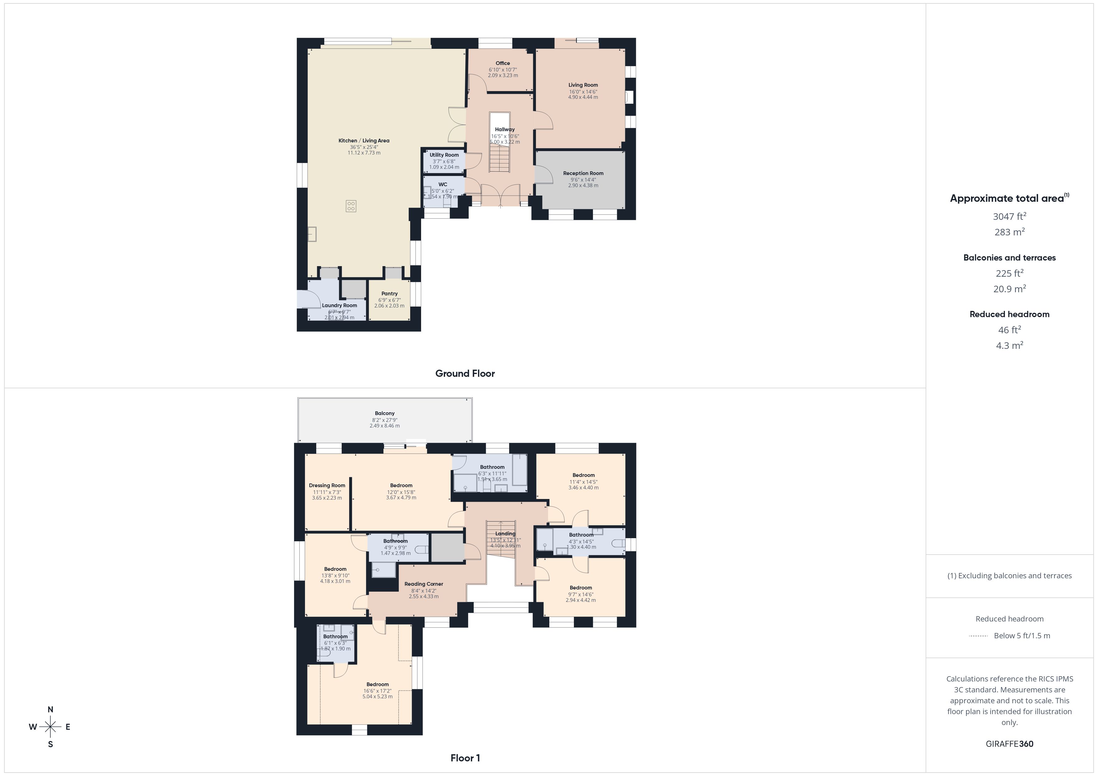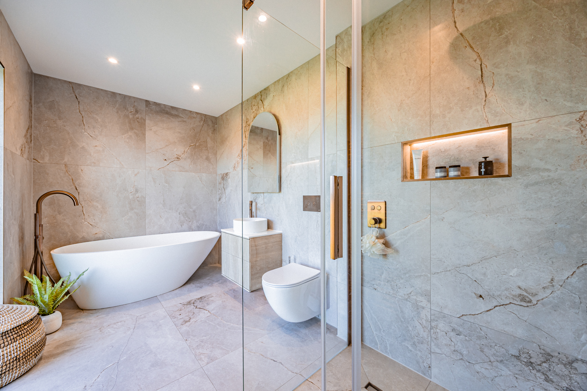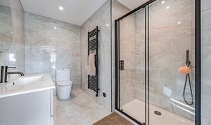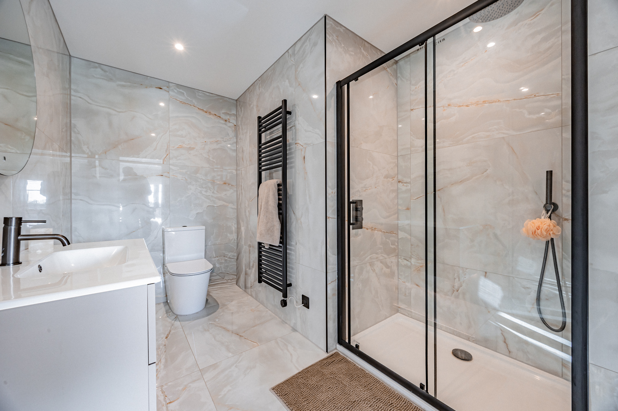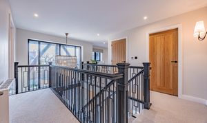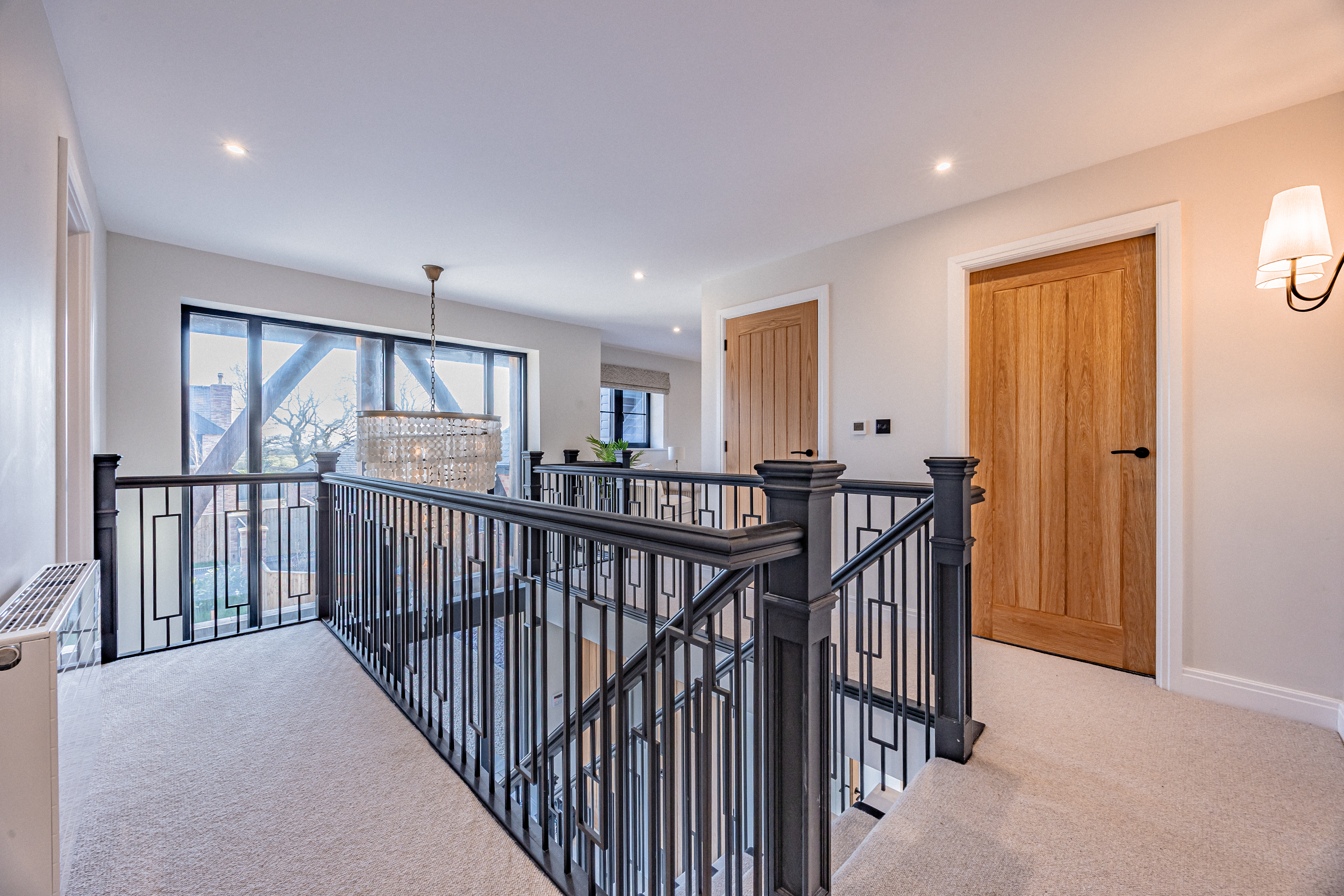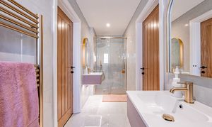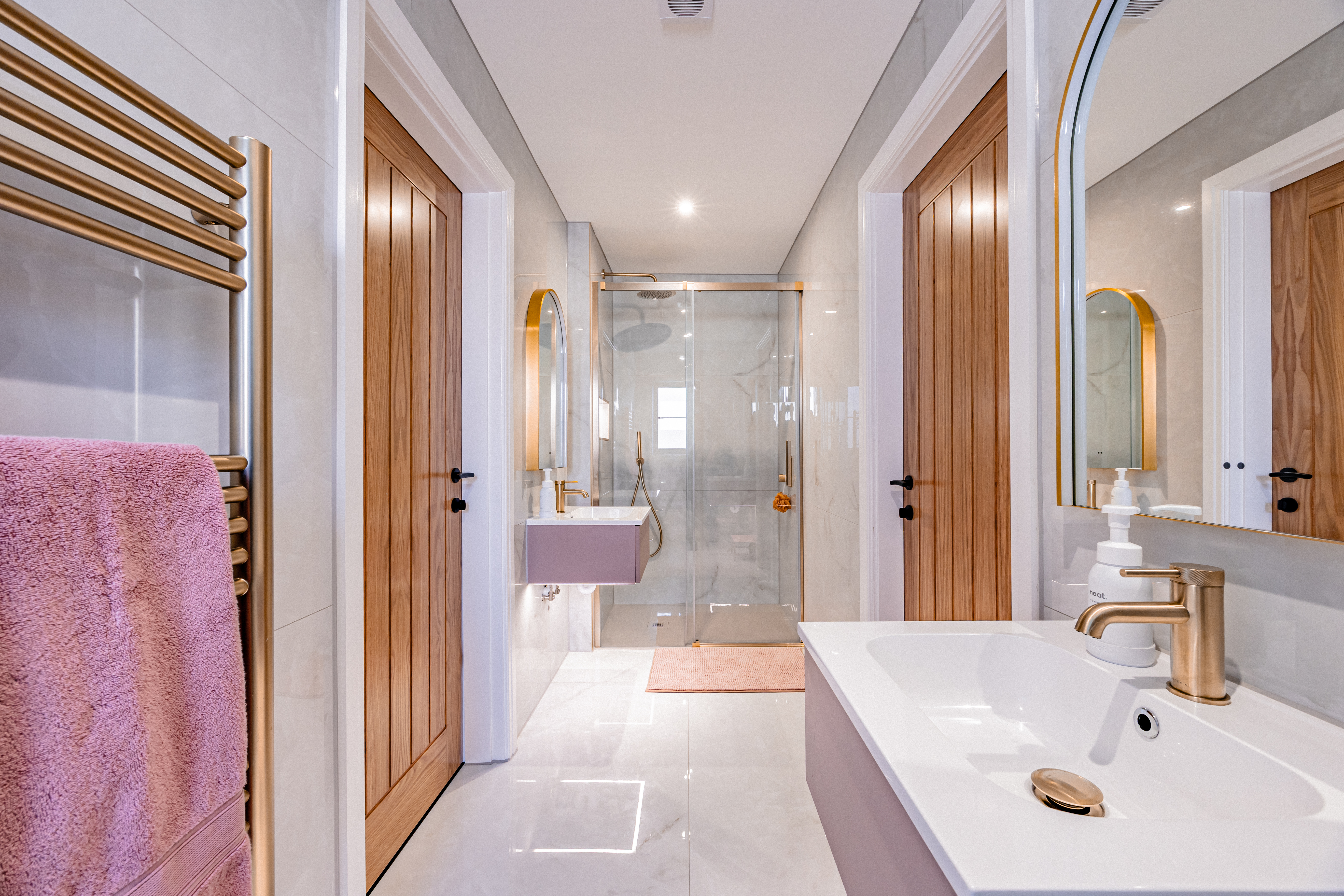 Take the stairs up to the light-filled gallery landing, where two spacious double bedrooms share a Jack and Jill shower room, finished in soft pink tones with gold accents.