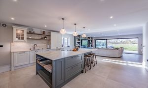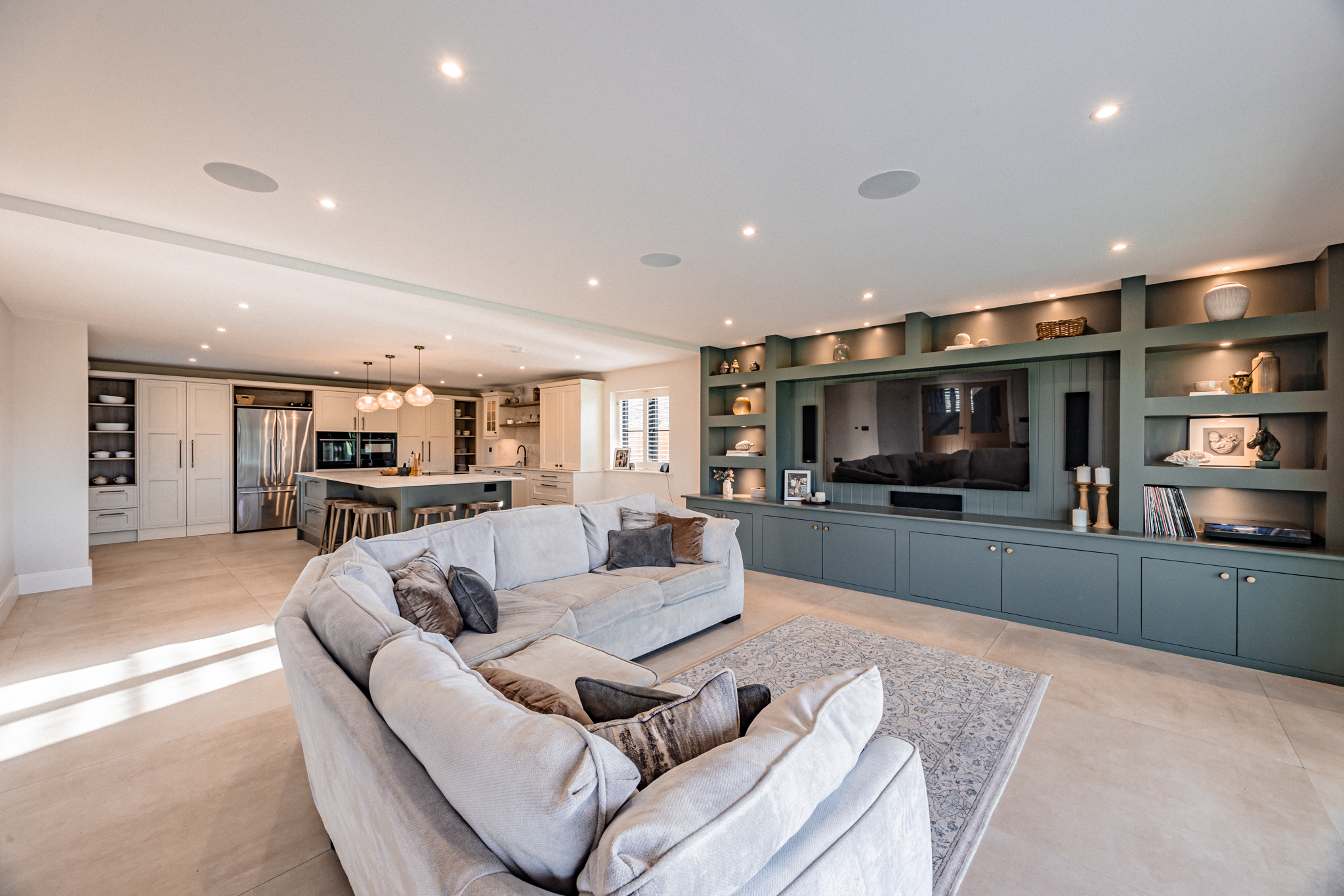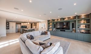 Double doors open from the hallway into a wide, sociable kitchen, dining and living space. Designed to bring people together, a substantial island-breakfast-bar sits at its centre, creating a natural place to gather for morning coffee, evening cooking with the children pitching in with the preparation on the porcelain worktop, or simply keeping homework up to speed.