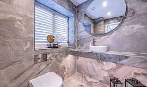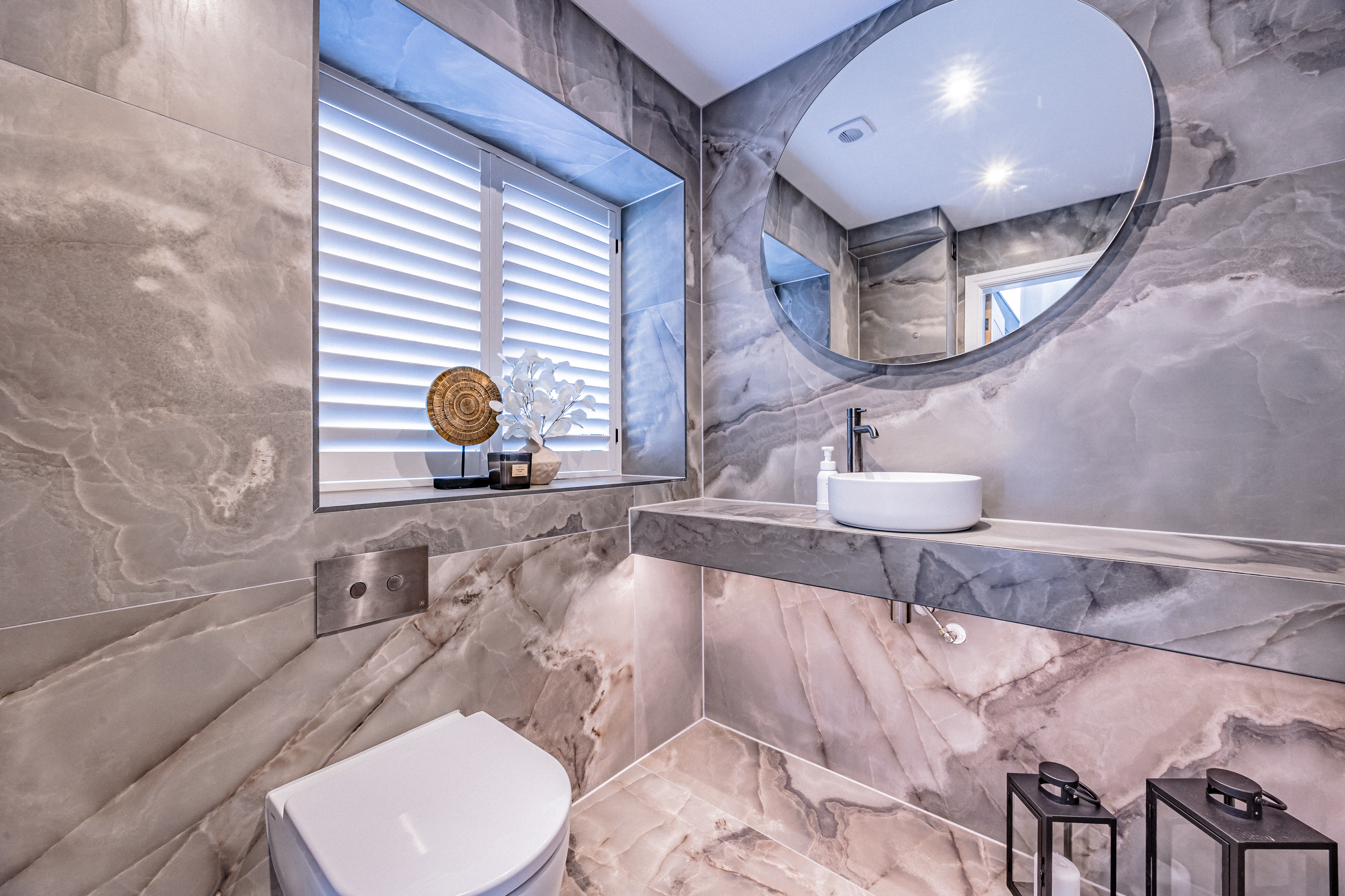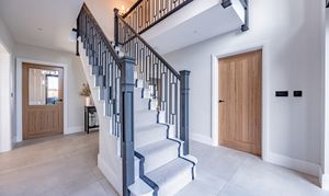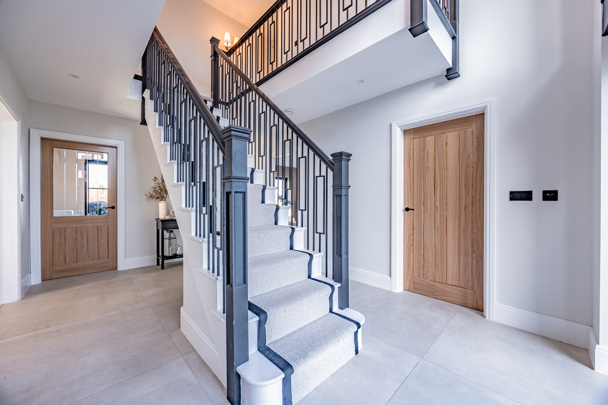 In the entrance hall, the grandeur of Moorthorpe Barn is instantly felt in the impressive staircase, centrally positioned, its charcoal-toned balustrade and elegant runner combining presence with restraint. Underfoot, premium-quality porcelain tiles from Rokia, warmed by underfloor heating, flow throughout the main living spaces, while a palette kept deliberately neutral allows the proportions and light to speak for themselves. Practicality is effortlessly woven into the design, with cloak storage and a cloakroom set just off to the side, finished with subtle marble detailing.