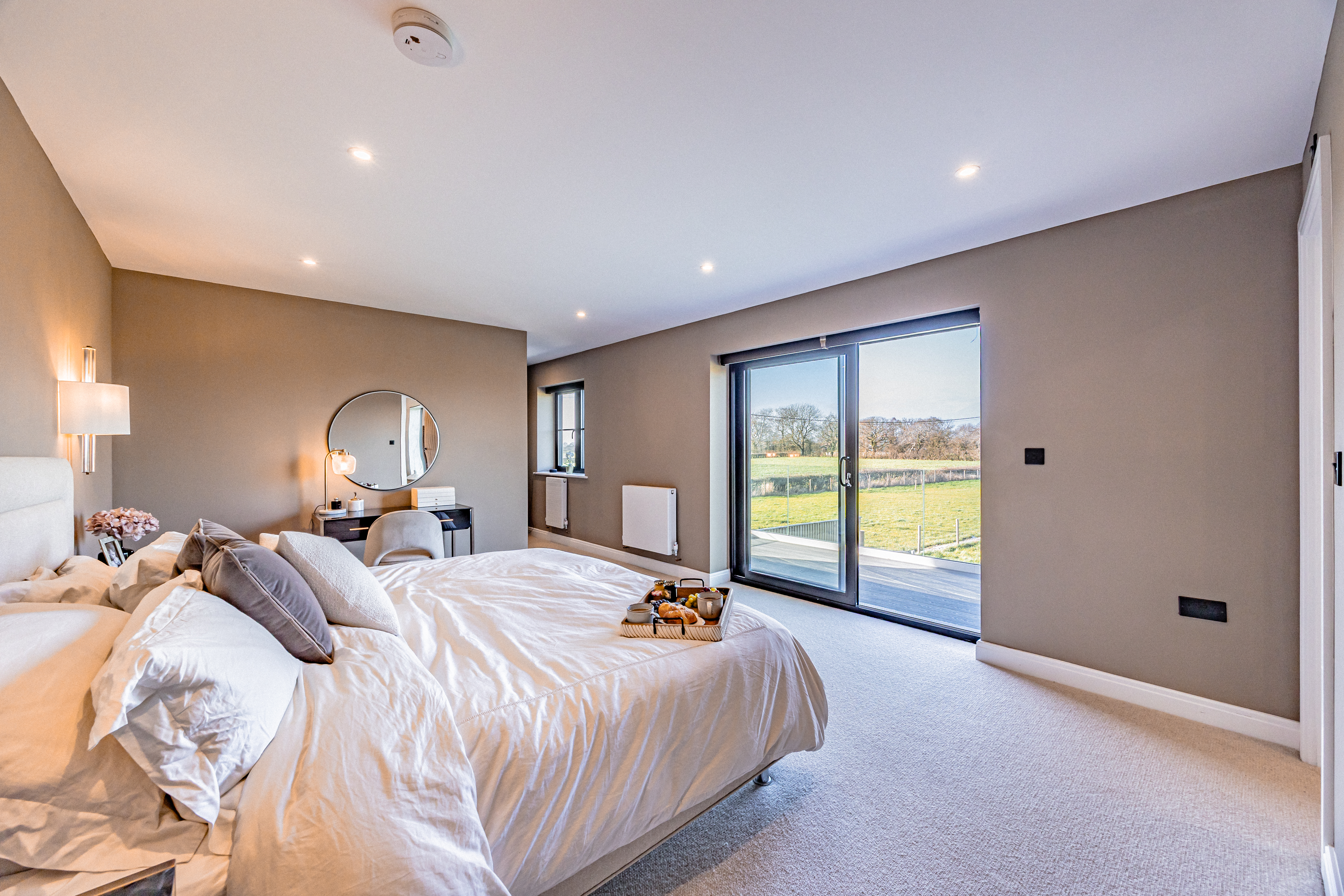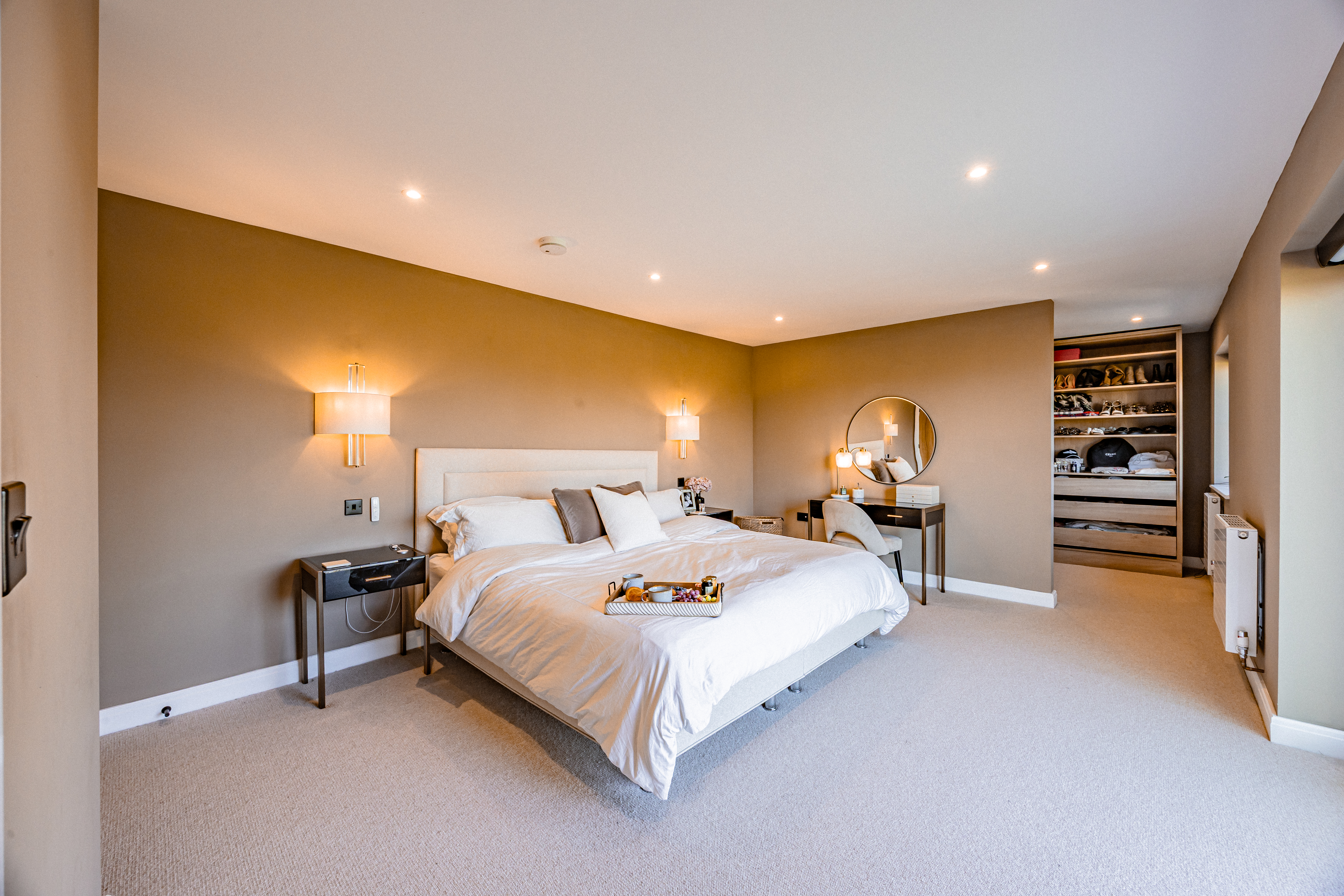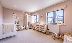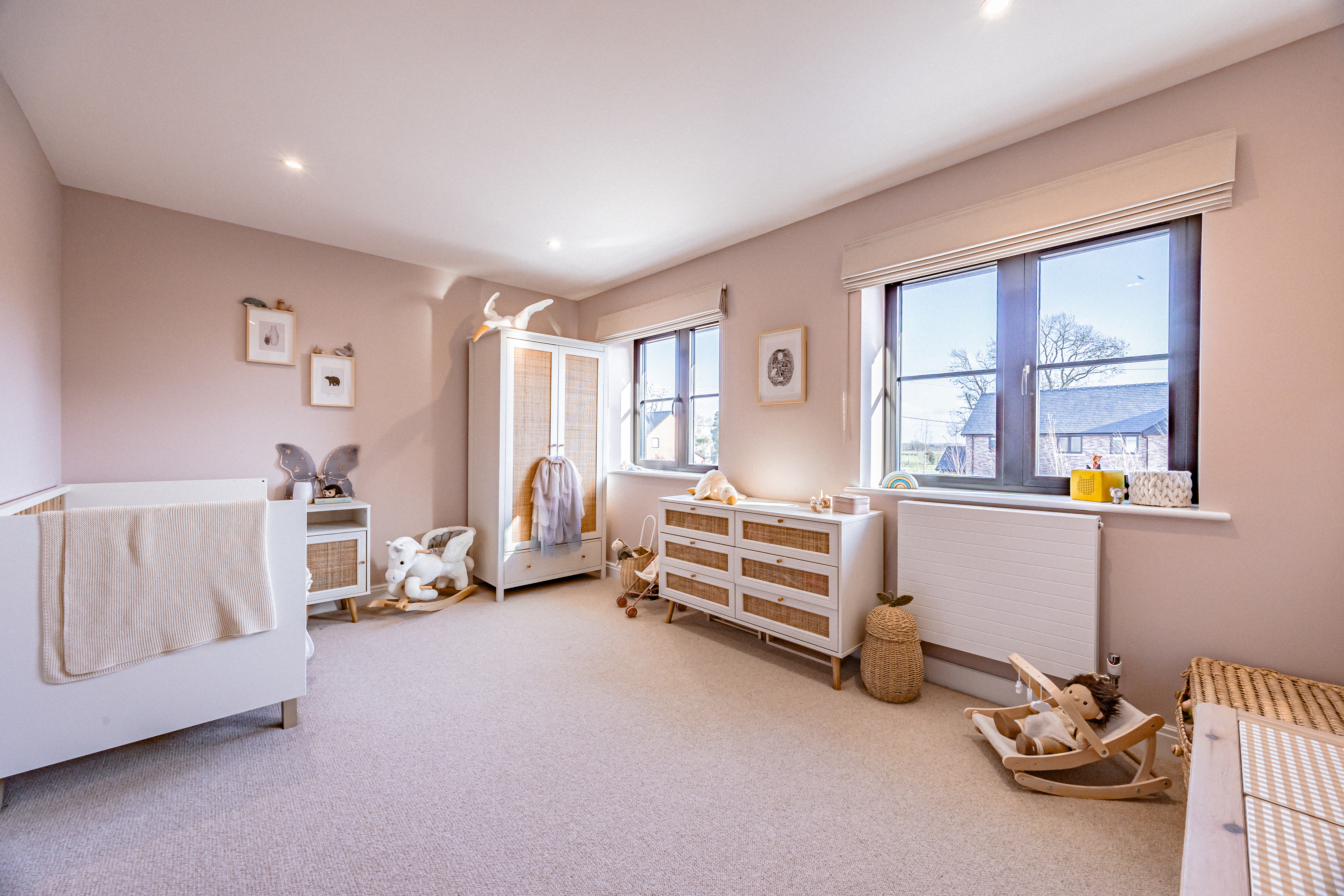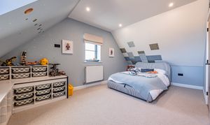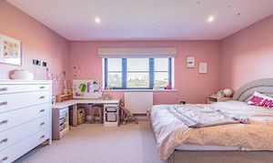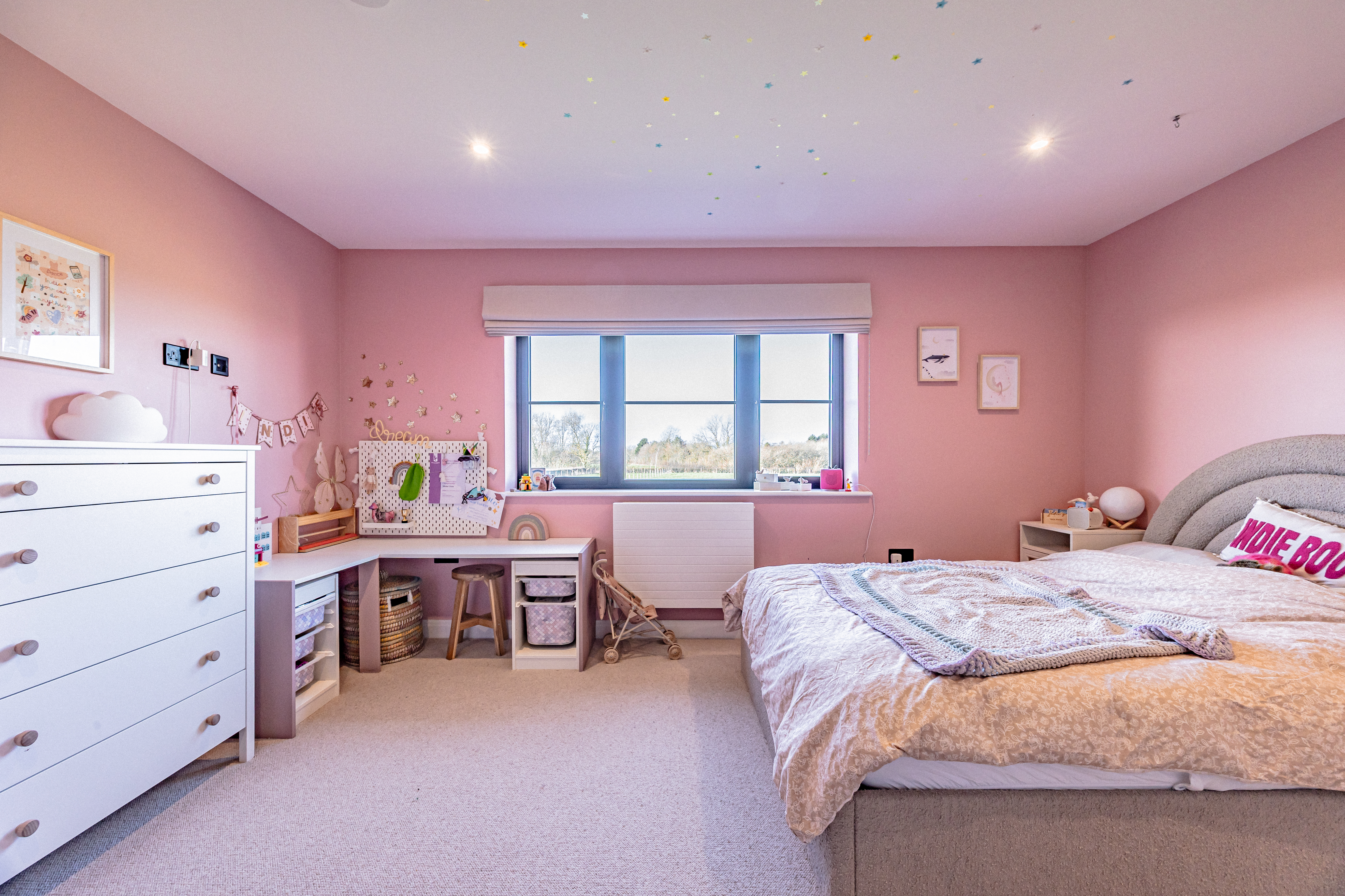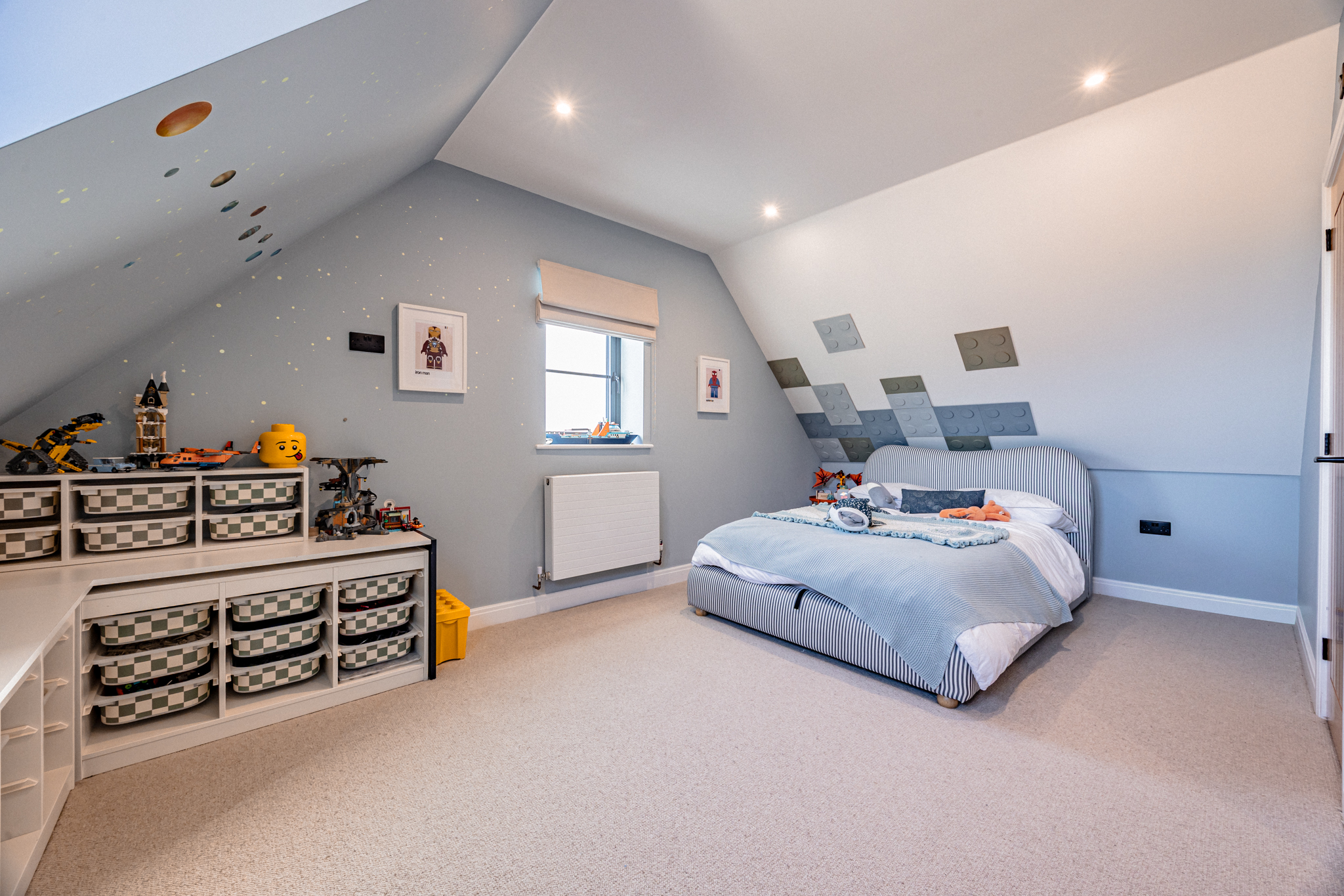 Two further double bedrooms sit along this wing, each with private en suite facilities. One offers a more private setting, well suited to guests, while the other nestles into the eaves, where a sloping ceiling features a playful, removable Lego detail perfect for little ones.