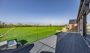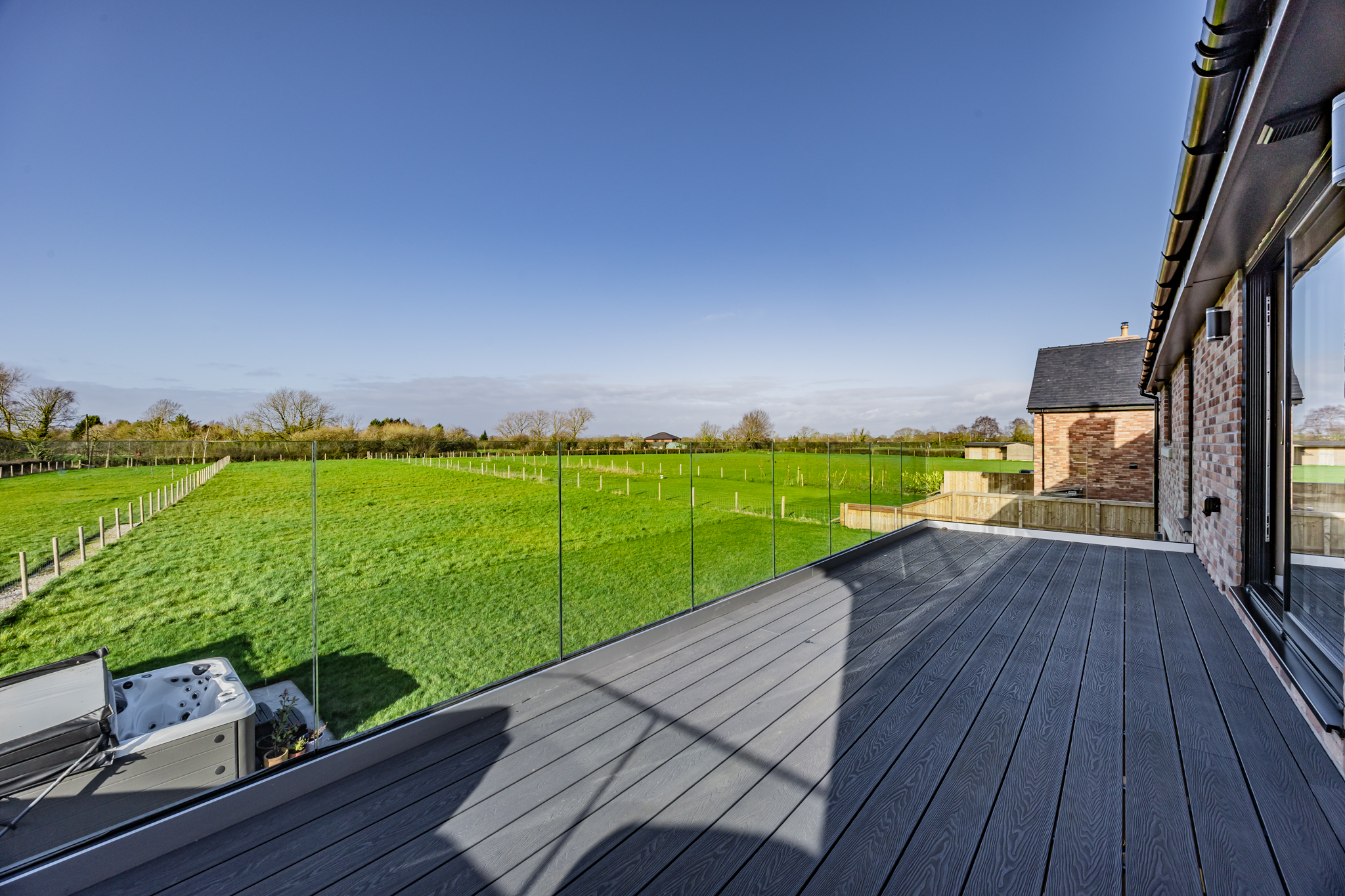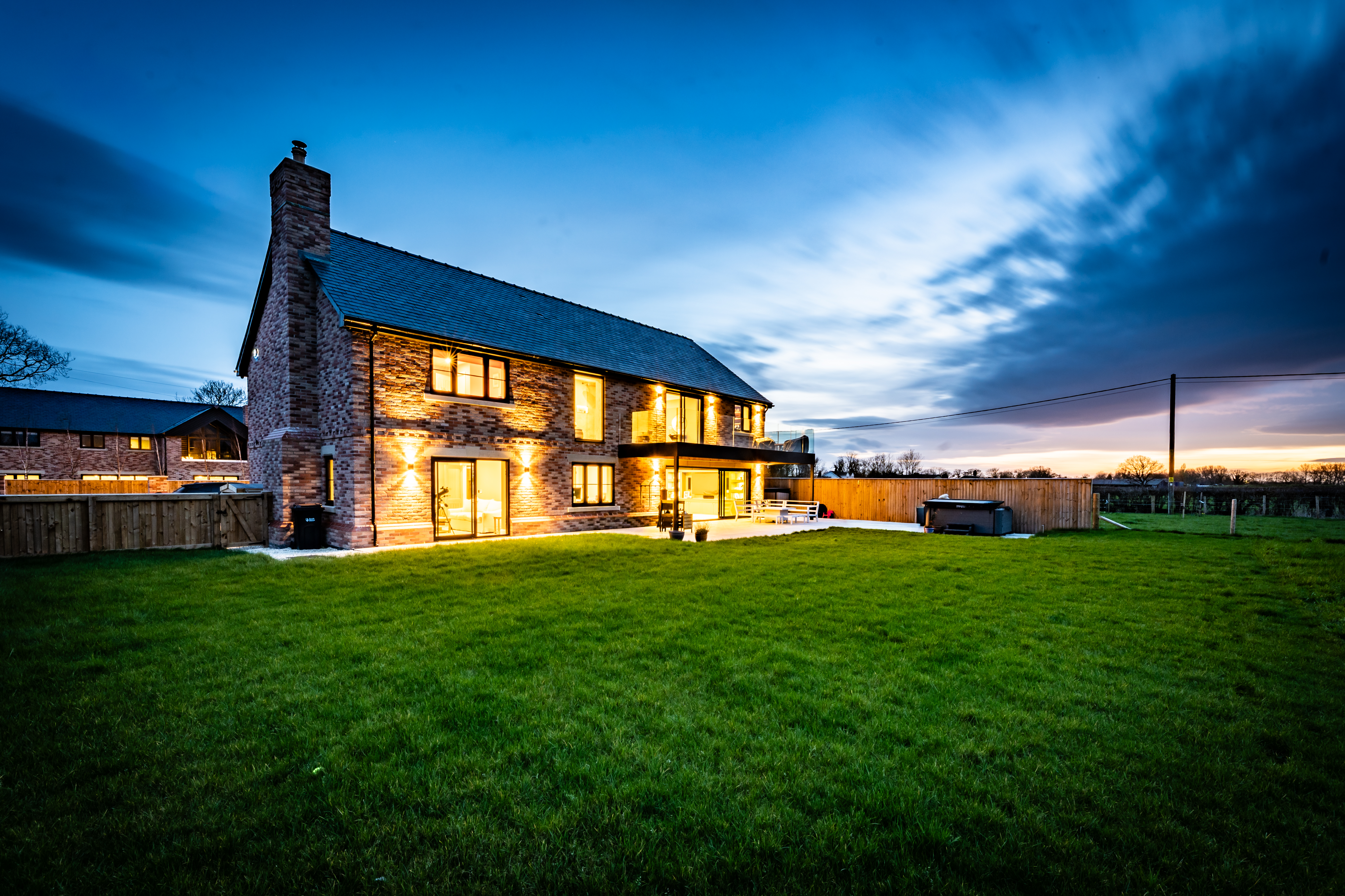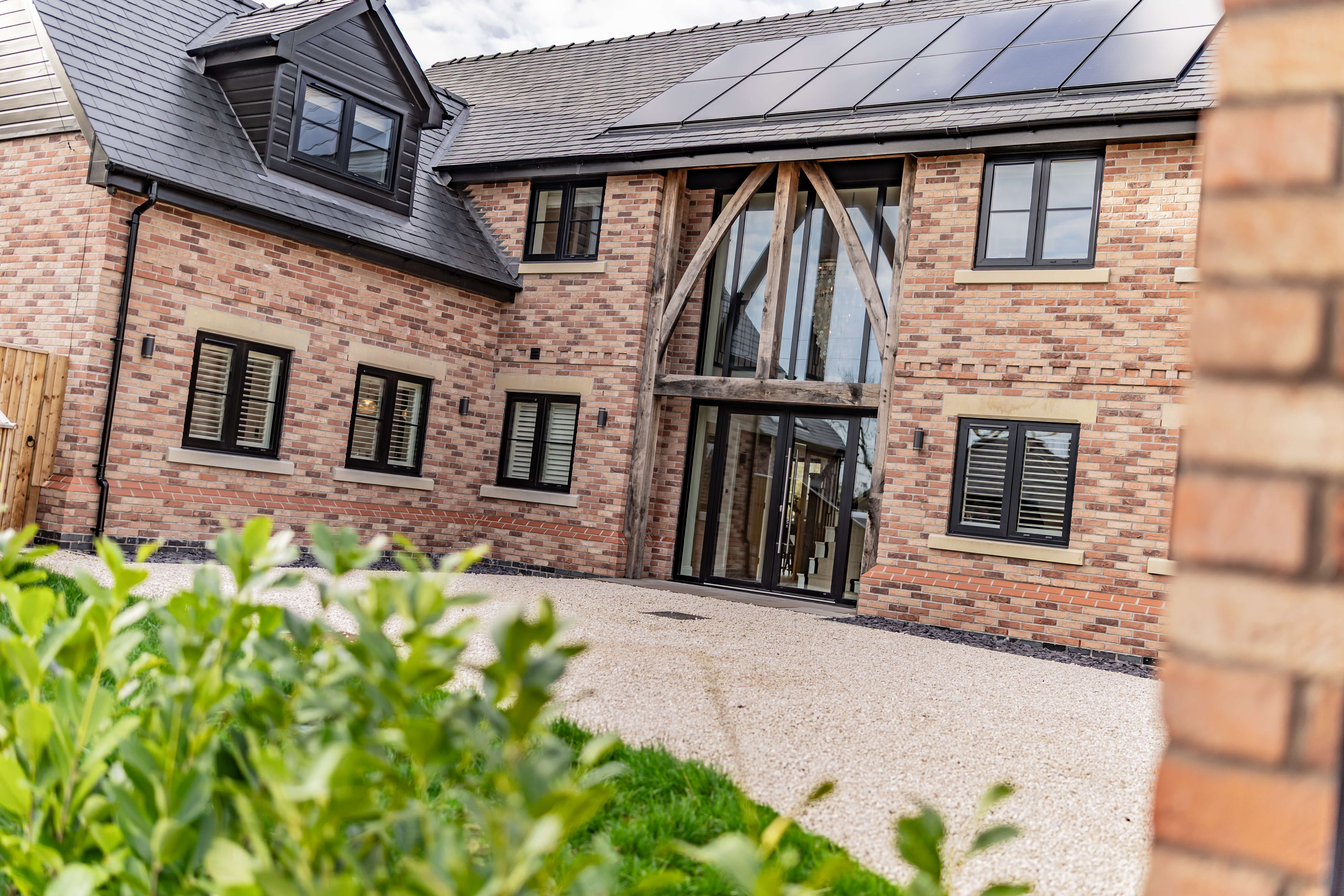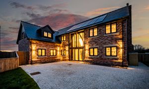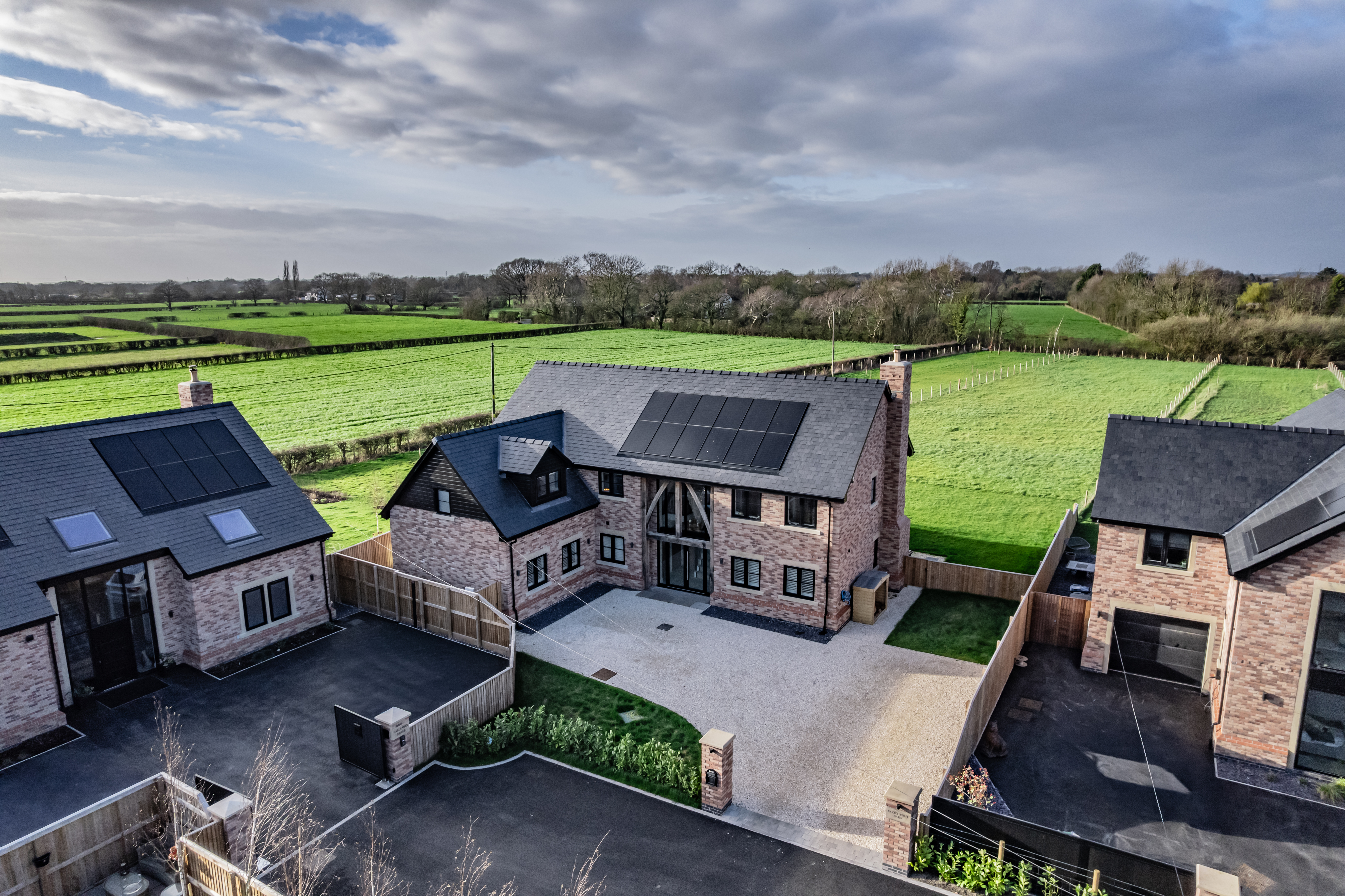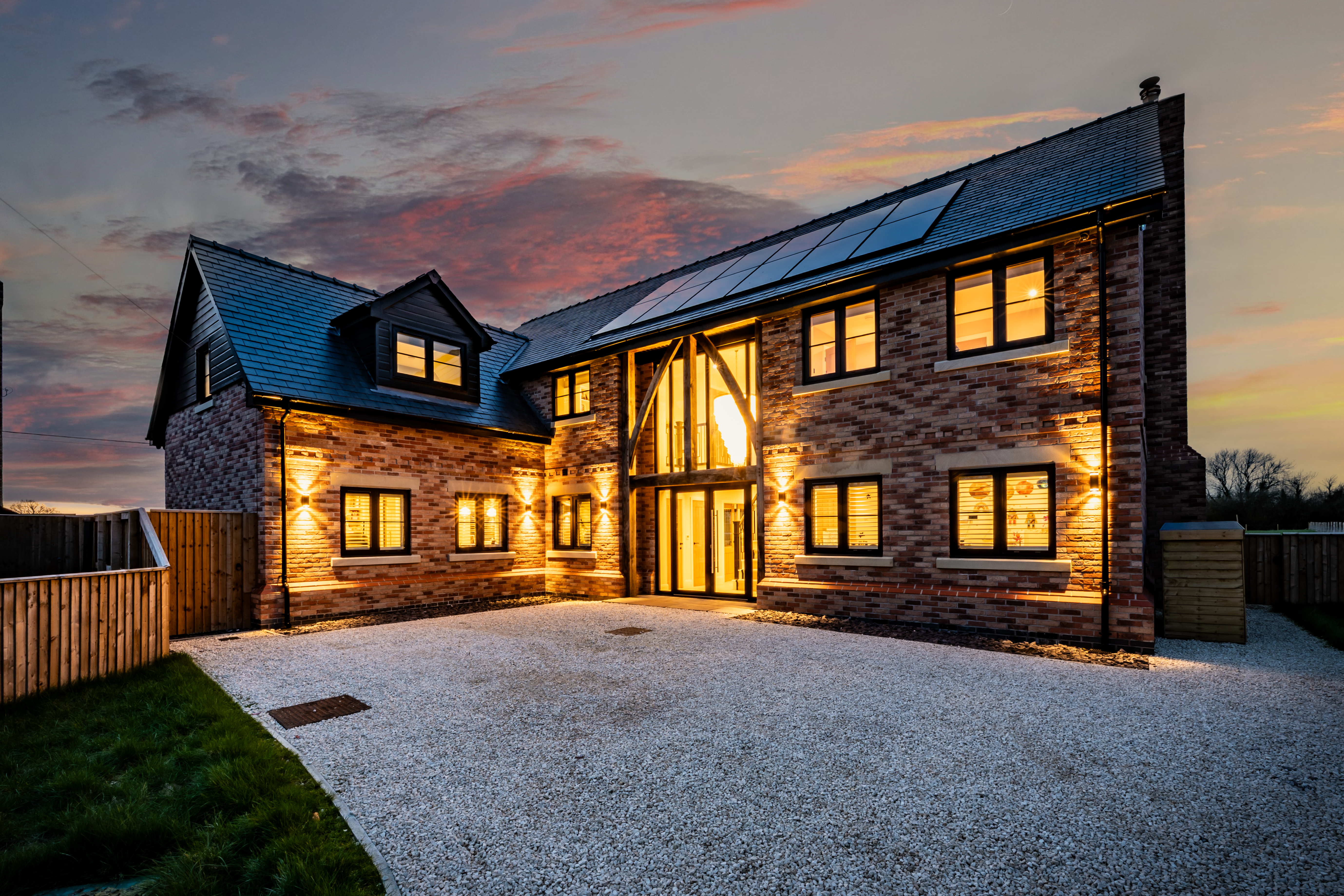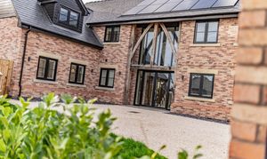 Pull onto the broad gravel driveway where gateposts stand ready for electric gates if ever required. With an electric vehicle charging point and provision for four cars comfortably to park, make your way to the striking entrance, where brick, glass and timber come together, the exposed frame drawing the eye upward, allowing a moment to pause and admire the handsome stature of the home, before stepping indoors.