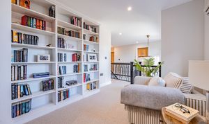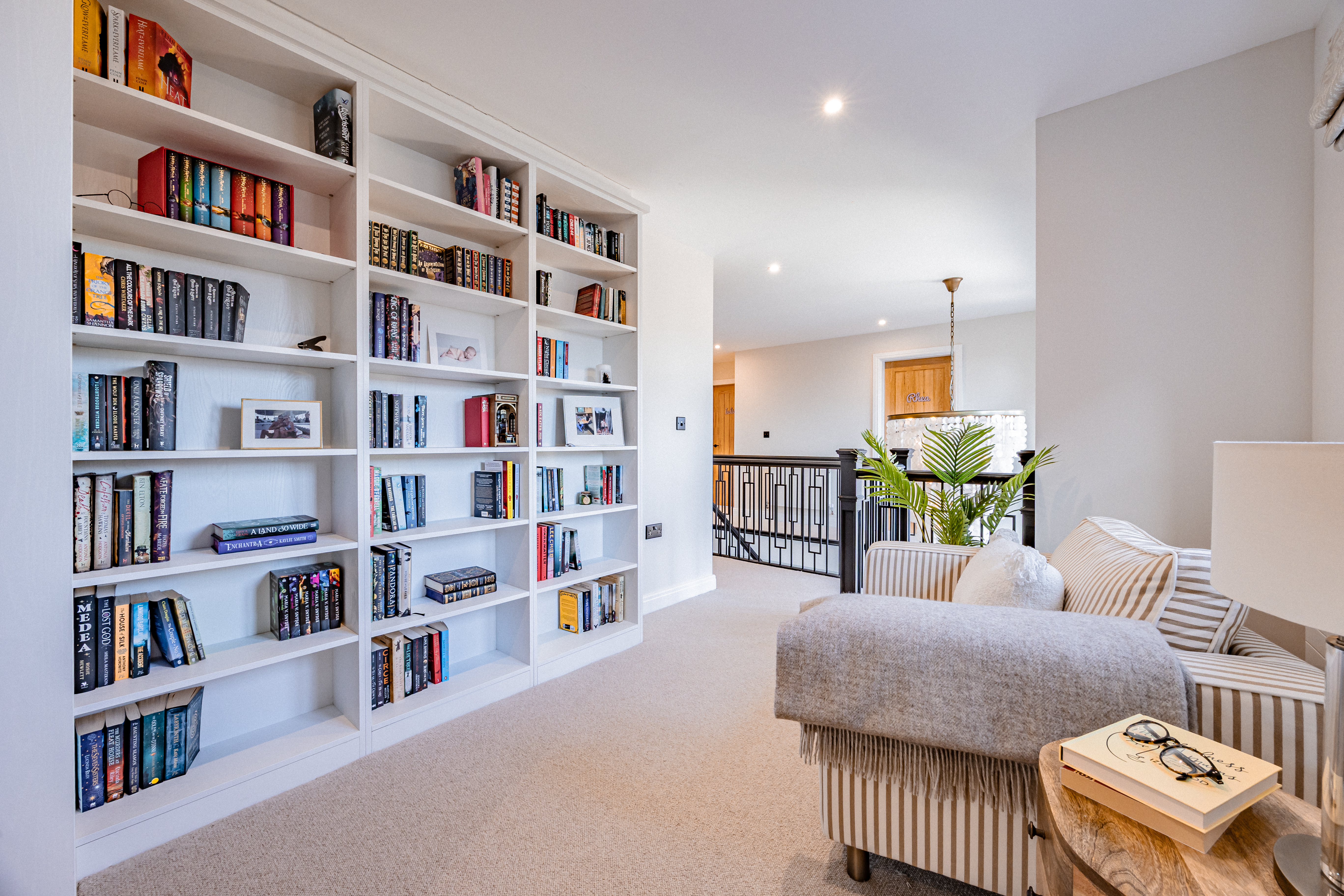 Beyond, a cosy landing nook has been shaped into a quiet reading corner, lined with shelving, perfect for bedtime stories at the end of the day.
