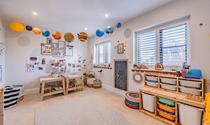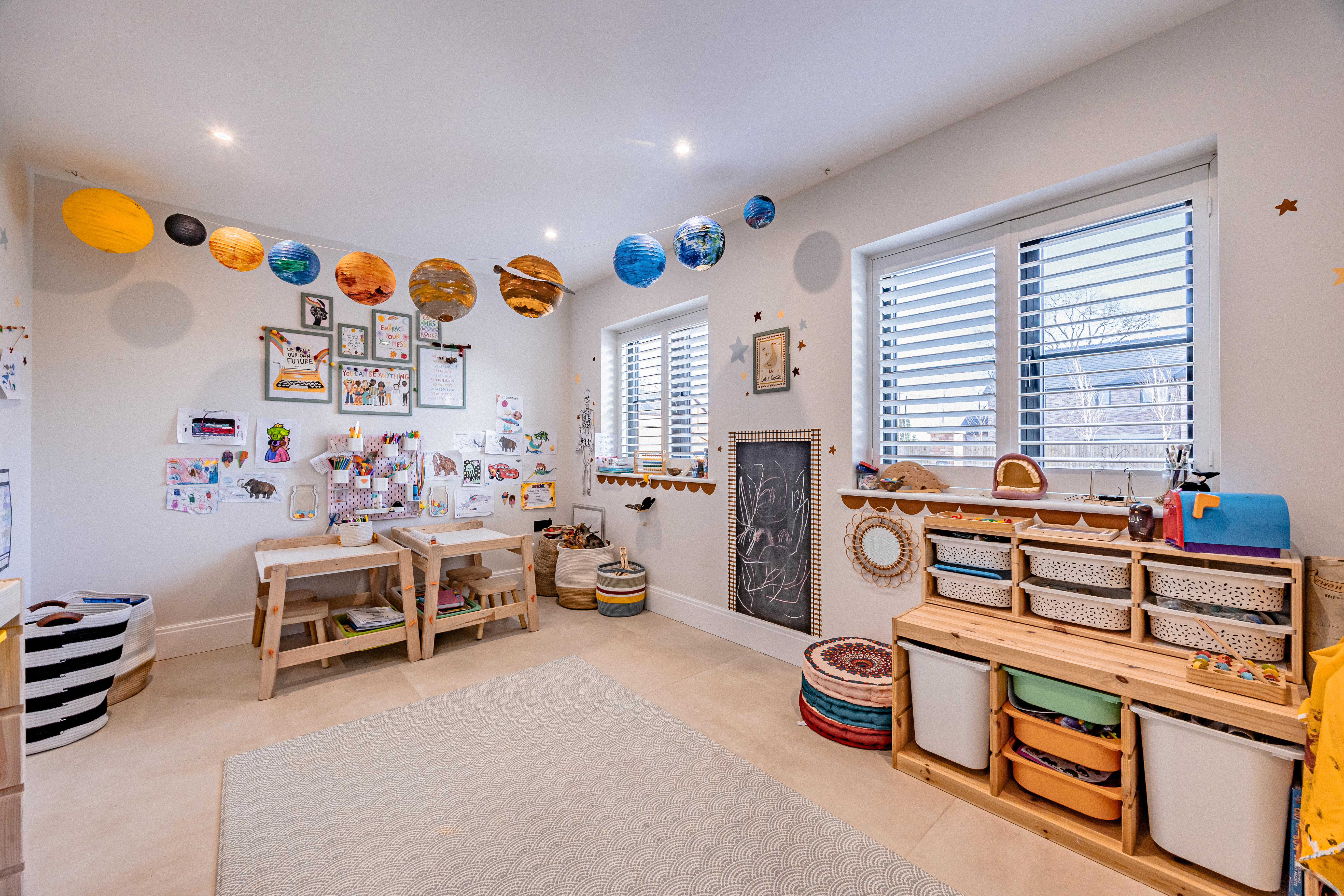 To the immediate right, discover the first of the versatile reception rooms, currently configured as a bright playroom, with plantation shuttered windows looking out to the quiet comings and goings to the front, making it also ideal as an office, or home gym.