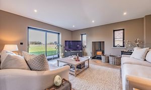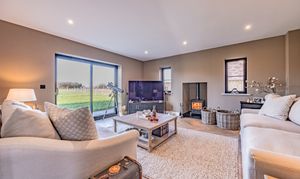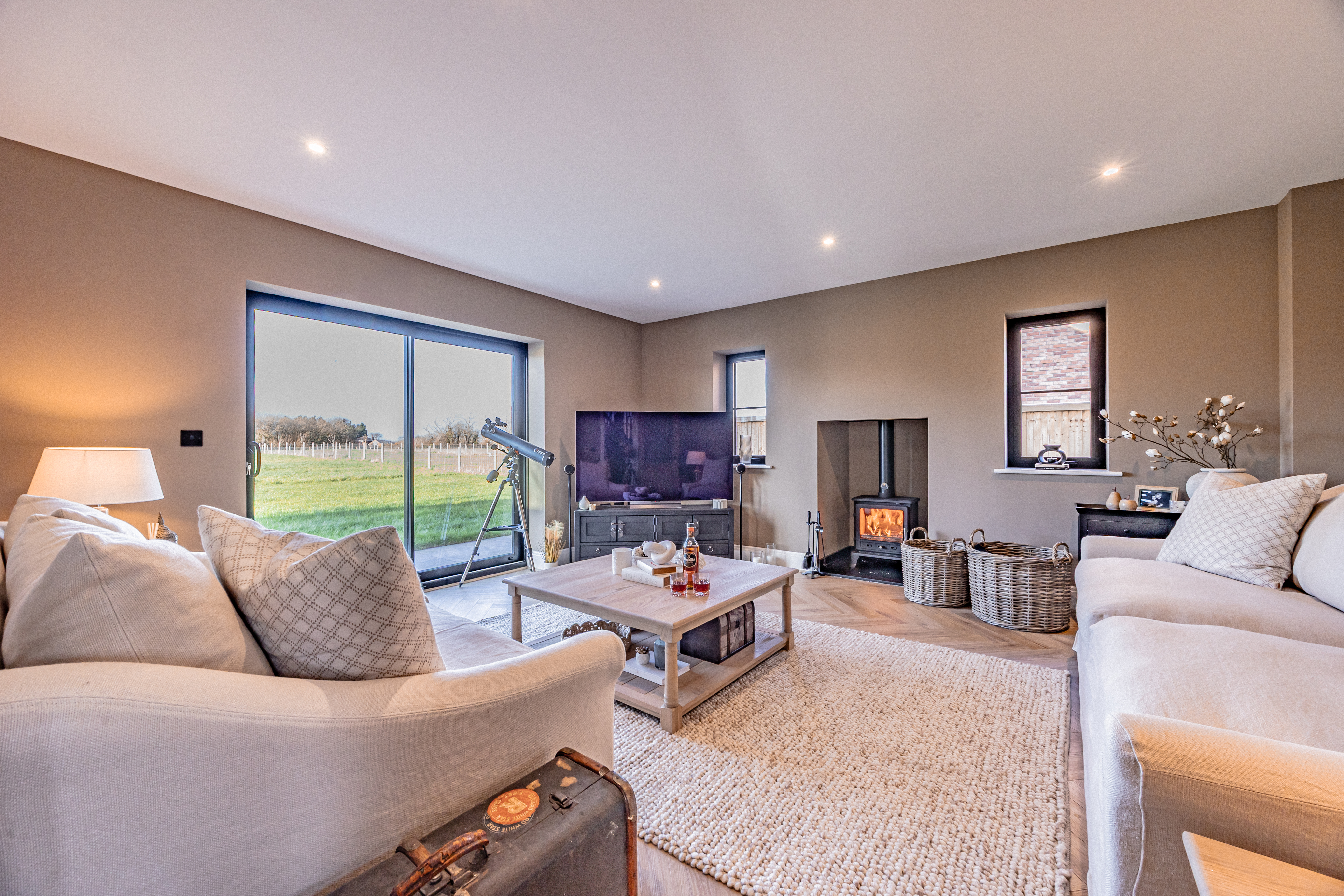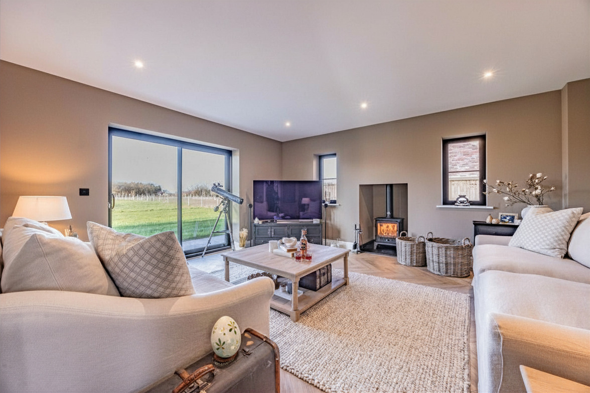 Honey-toned herringbone tiled flooring features underfoot in the living room to the rear, where black framed sliding doors invite verdant views out over the garden and meadow beyond. A peaceful ‘grown ups’ room, glorious in winter with the log-burning stove blazing, further light enters through windows to the side.