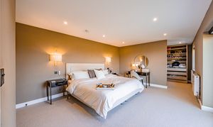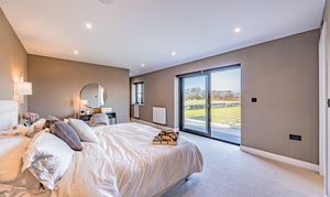Pure serenity awaits in the principal bedroom, discovered to the left of the landing. A peaceful, private retreat, complete with a dressing room fitted with built-in storage and an en suite bathroom, full height glazing frames far-reaching garden views, while doors open onto a balcony that catches the early morning sun, the ultimate spot to soak up the warmth of the early day rays with a cup of coffee. These views can also be admired at the end of the day, while soaking in the freestanding bath positioned to enjoy the same uninterrupted vistas, private and unoverlooked.