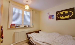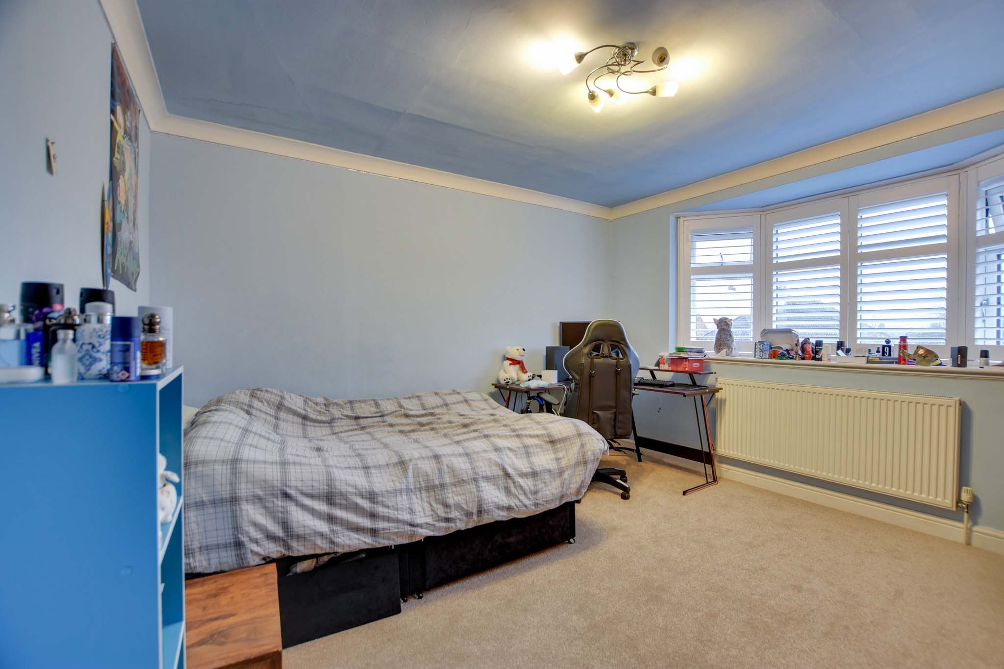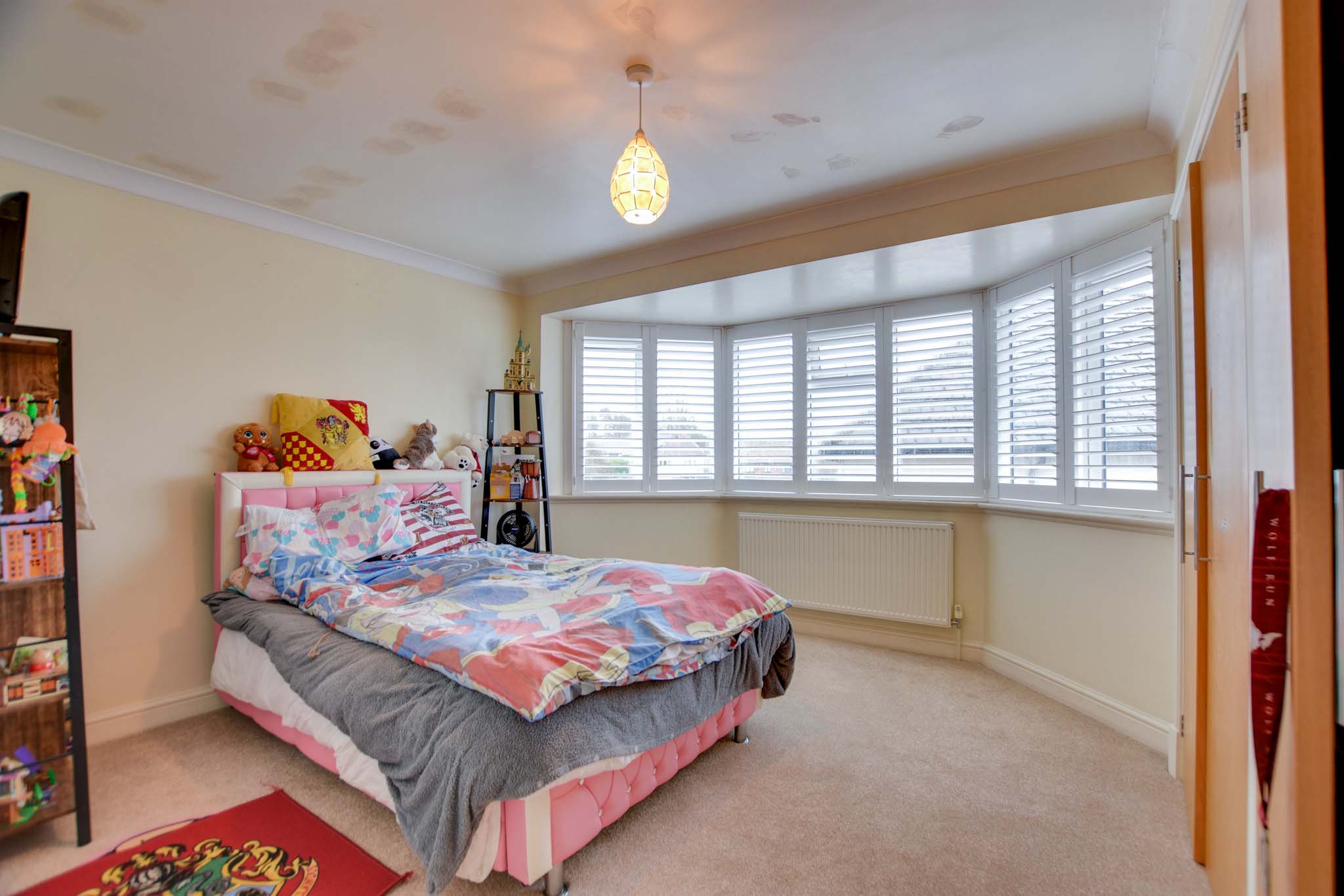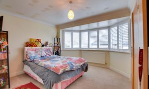 Features a double-glazed bay window to the front elevation with window shutters, built-in wardrobes, coving to the ceiling, and a radiator.