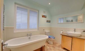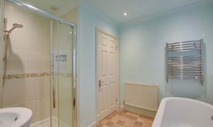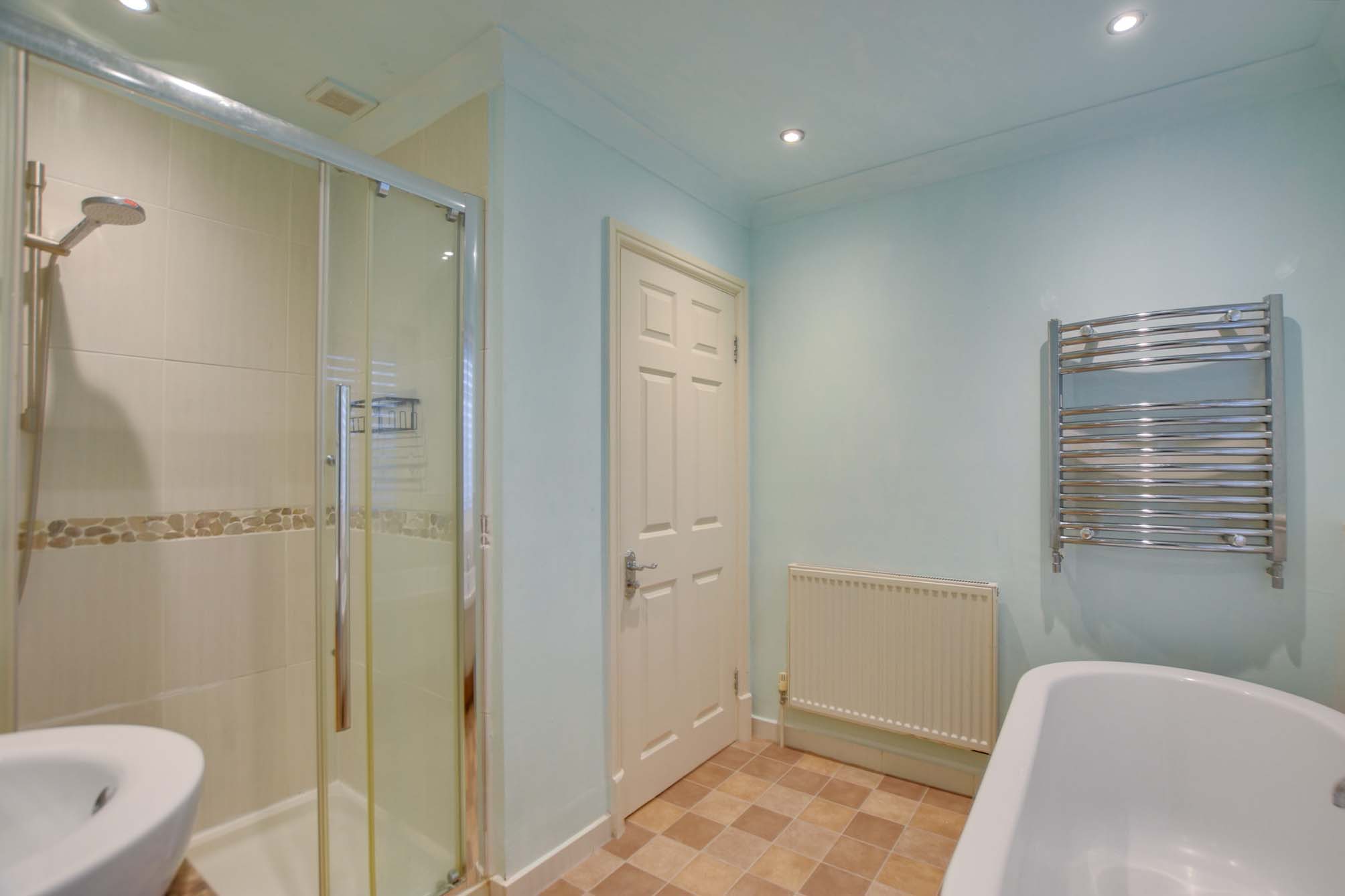 With a double-glazed window to the front elevation with window shutters, a roll-top free-standing bath with mixer tap, a low-level WC, a separate double shower cubicle with chrome mixer shower, inset ceiling spotlights, coving to the ceiling, tiled walls, a heated chrome towel rail, and a radiator.