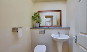 With double glazed window to the side elevation, a low-level WC, a wash hand basin, tiled walls, tiled flooring and an extractor fan.