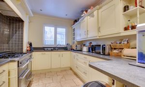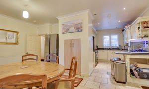 (narrowing to 2.52m) Kitchen area: Features a double-glazed window to the front elevation with window shutters, sink and drainer with a range of traditional style wall and base units with Corian worktops over, breakfast bar, a Rangemaster cooker with chimney hood over, built-in dishwasher, space for fridge freezer, coving to ceiling, inset ceiling spotlights, limestone style tiled floor. Dining Area: With limestone-style tiled flooring, coving to the ceiling, a radiator, and folding doors to the family room. Access to a lobby area with a shelved storage cupboard and access to WC / utility room