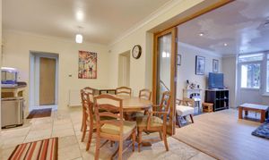 The ground floor opens with an entrance porch leading into a welcoming hallway with a staircase and useful understairs storage. There is a ground floor WC and four versatile reception spaces, including a formal dining room with feature inglenook fireplace, a comfortable sitting room with gas fire, a spacious family room opening onto the rear garden, and a further large reception currently used as a ground floor bedroom, complete with ensuite shower room and exposed beams.