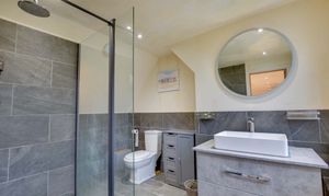 Features a double-glazed window to the rear elevation, a walk-in tiled shower cubicle with an overhead rainfall shower, a wash hand basin, and a low-level WC, tiled flooring, a heated towel rail, and inset ceiling spotlights.