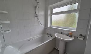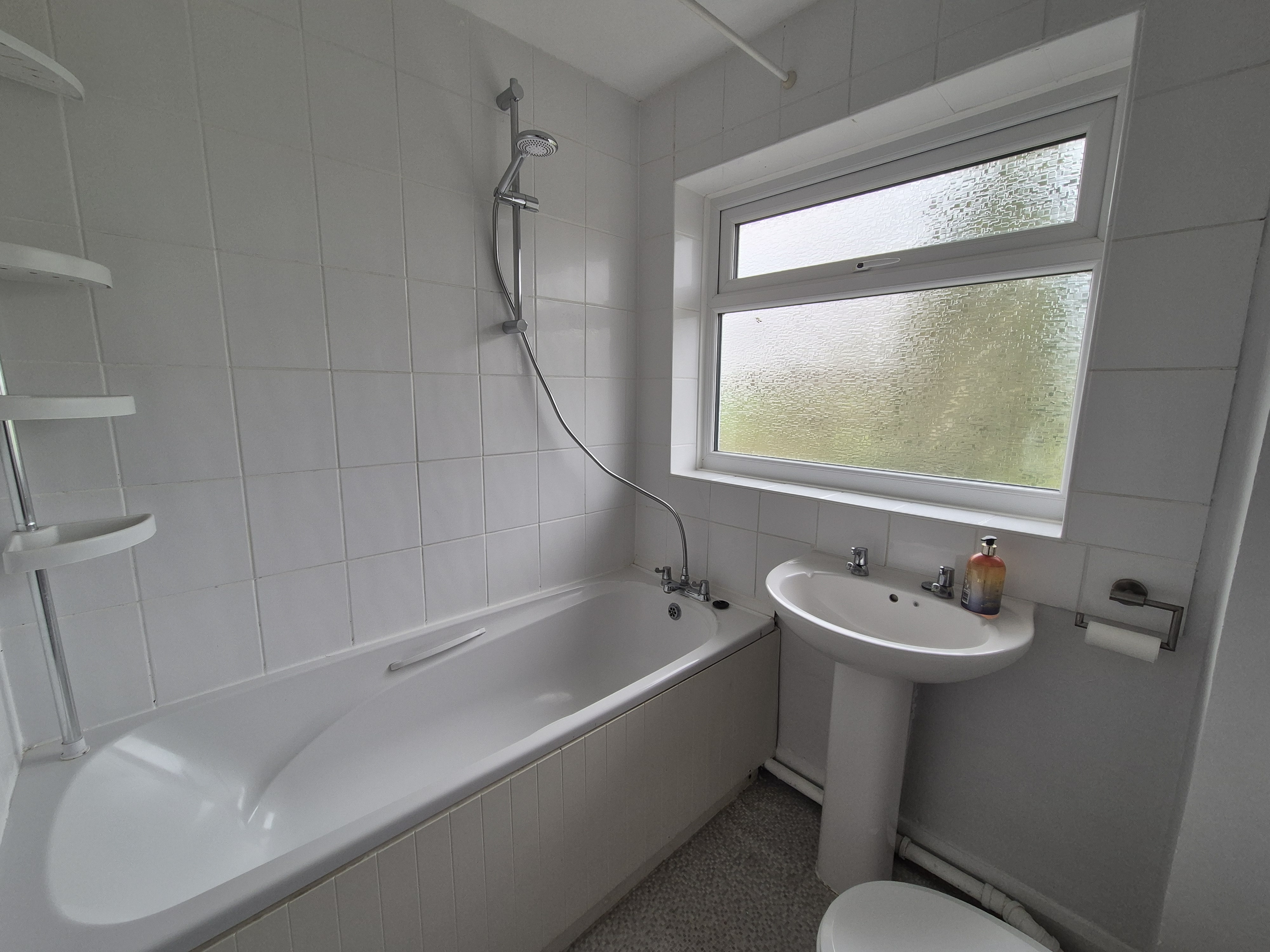 This comprises of panel bath with mixer tap, wash hand basin, low level flush WC, part tiled walls, wall mounted cabinet and obscure UPVC double glazed window.