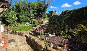 To the front of the property, there is stairway down towards the UPVC front door with shrub areas and lawn either side, fenced & hedged boundaries, concrete pathway leading down the side of the dwelling providing access towards the rear garden, outside stores and into the kitchen.